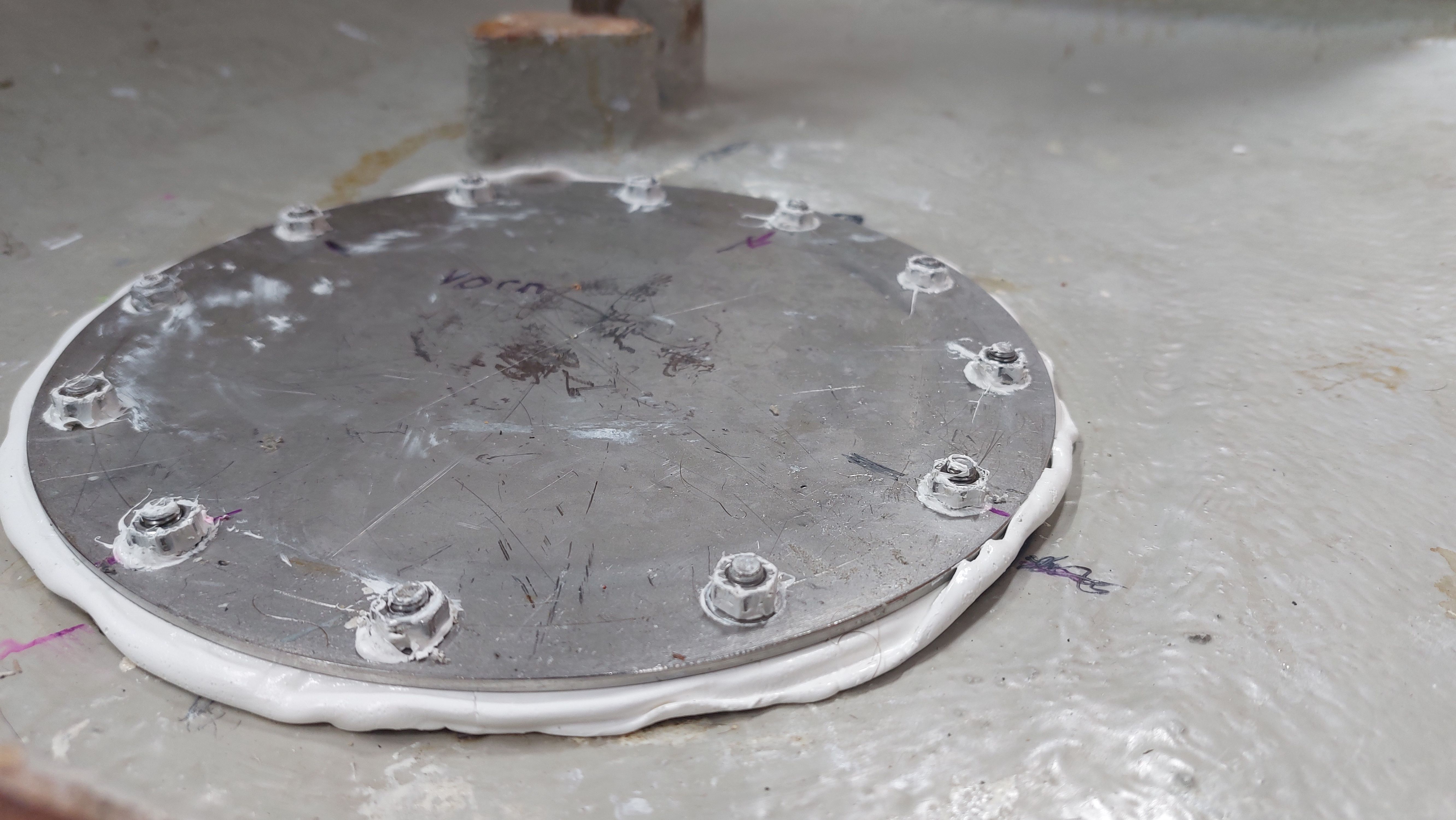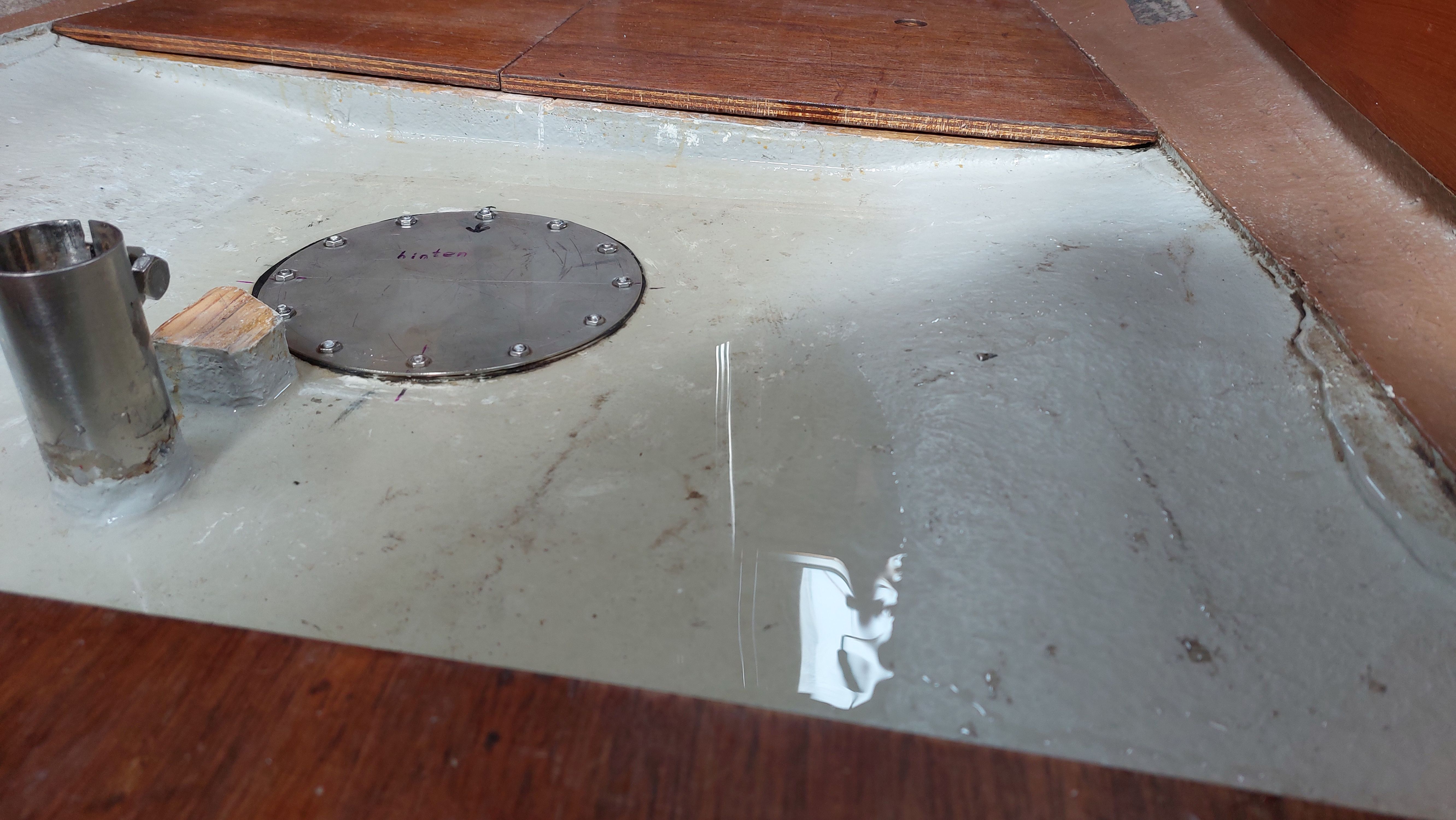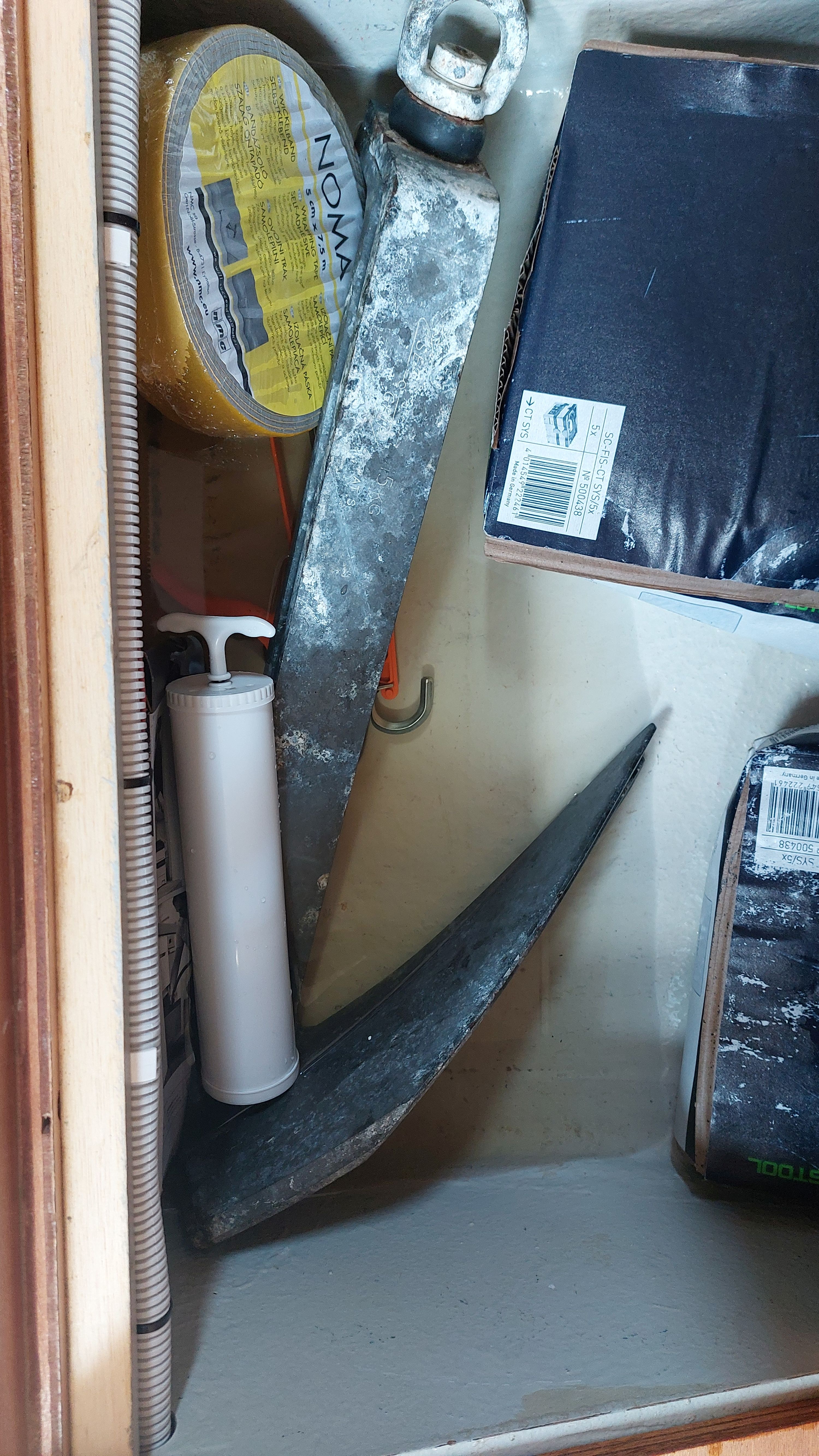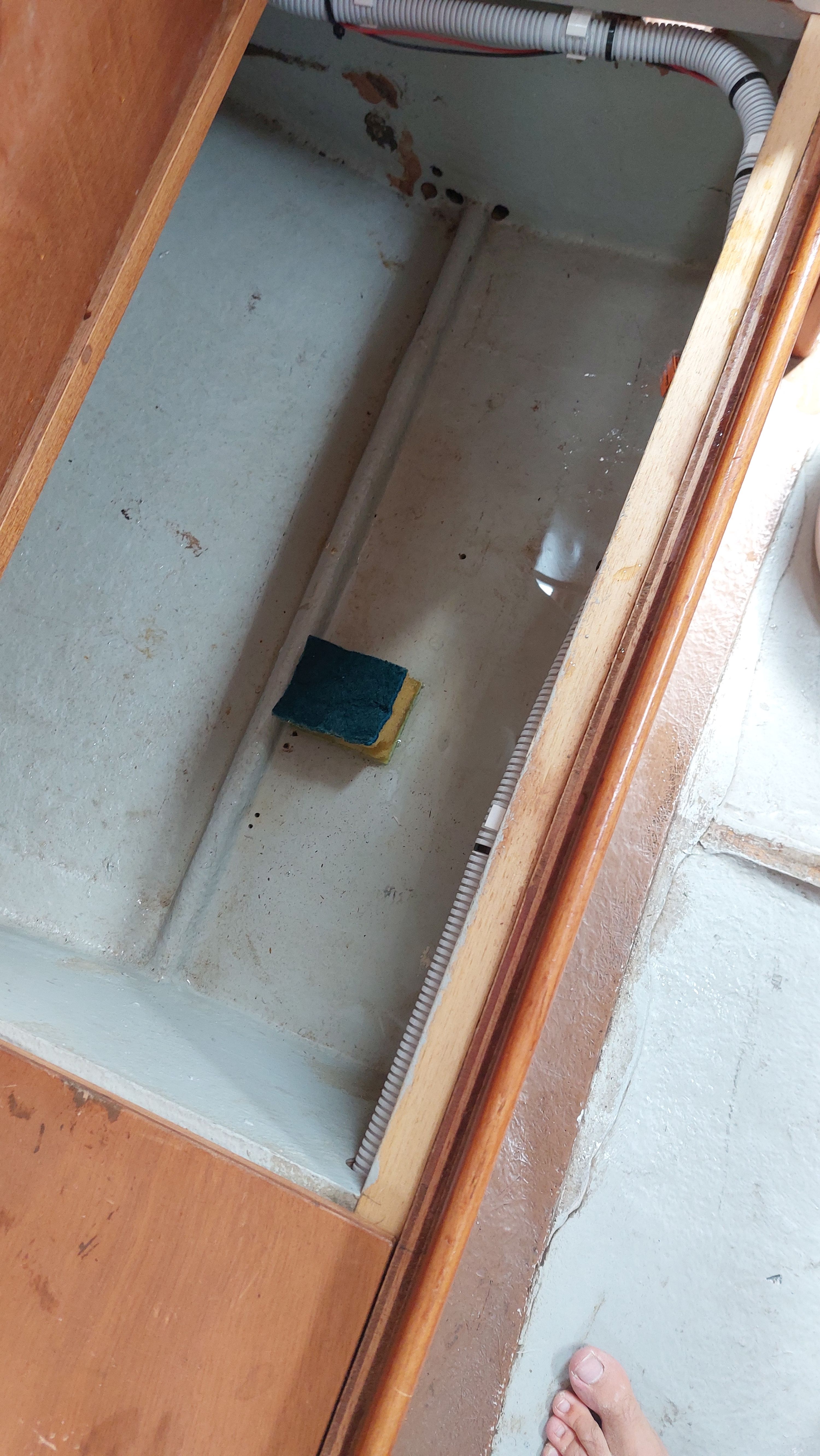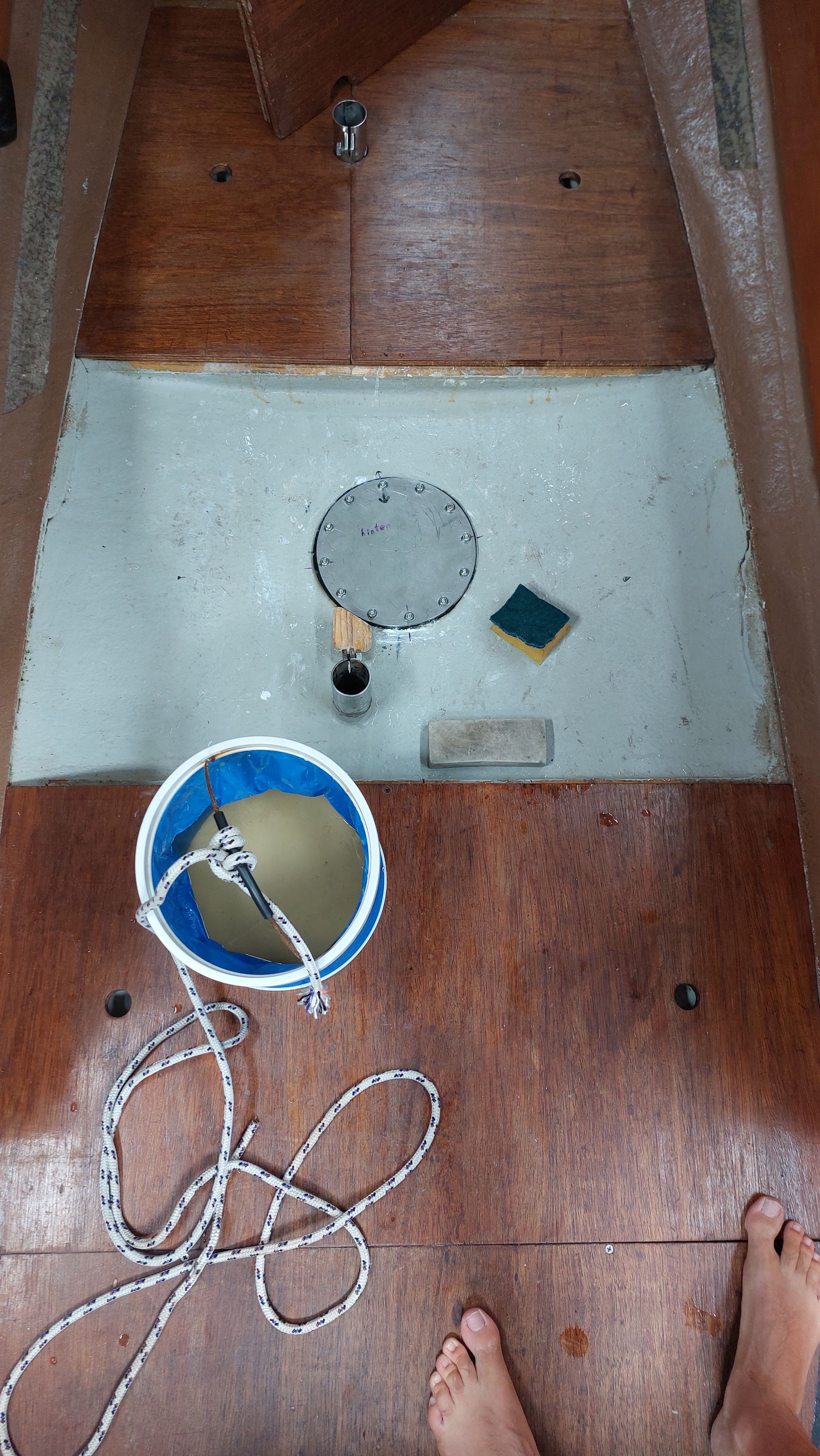 Nachdem alles halbwegs trockengewischt ist leere ich den Bilgetank. Das mache ich mit der Fußpumpe in der Pantry und muss dafür gut viertausend mal pumpen. Dann öffne ich die beiden Tankdeckel und wische den Rest trocken bevor ich die Deckel in einer dicken Silikonwurst wieder einsetze.
