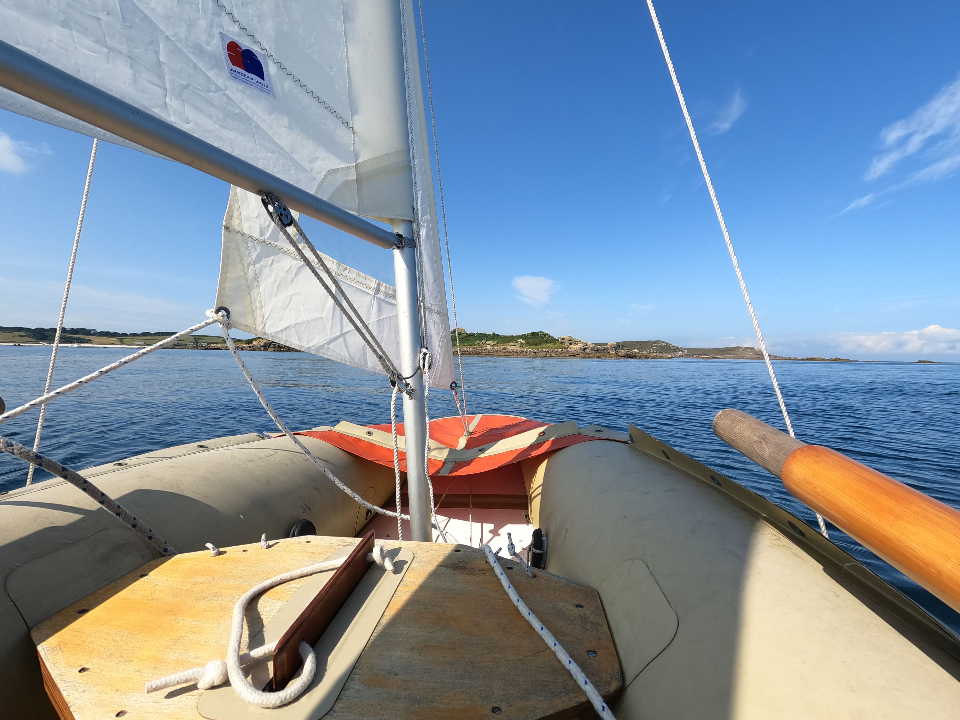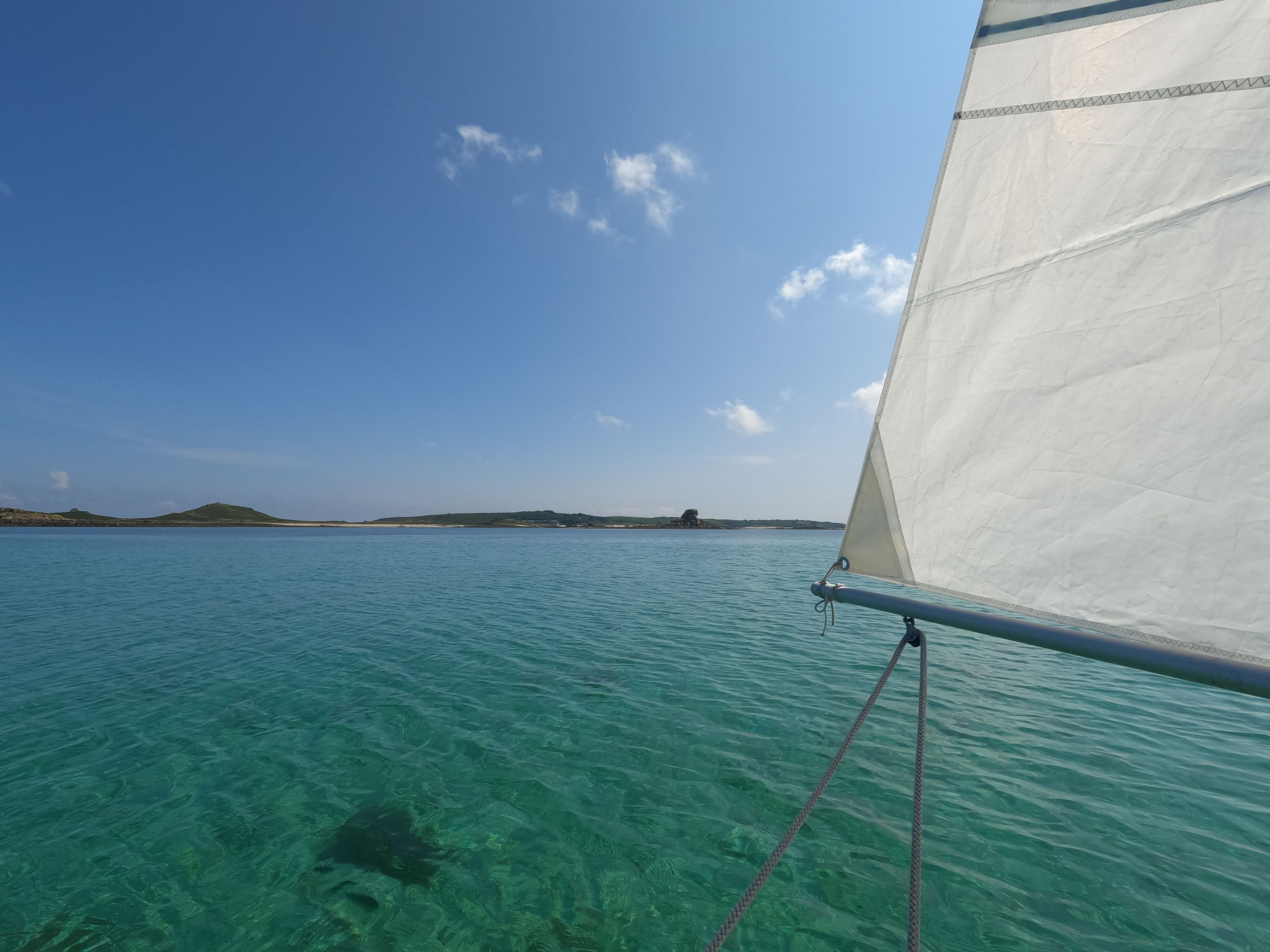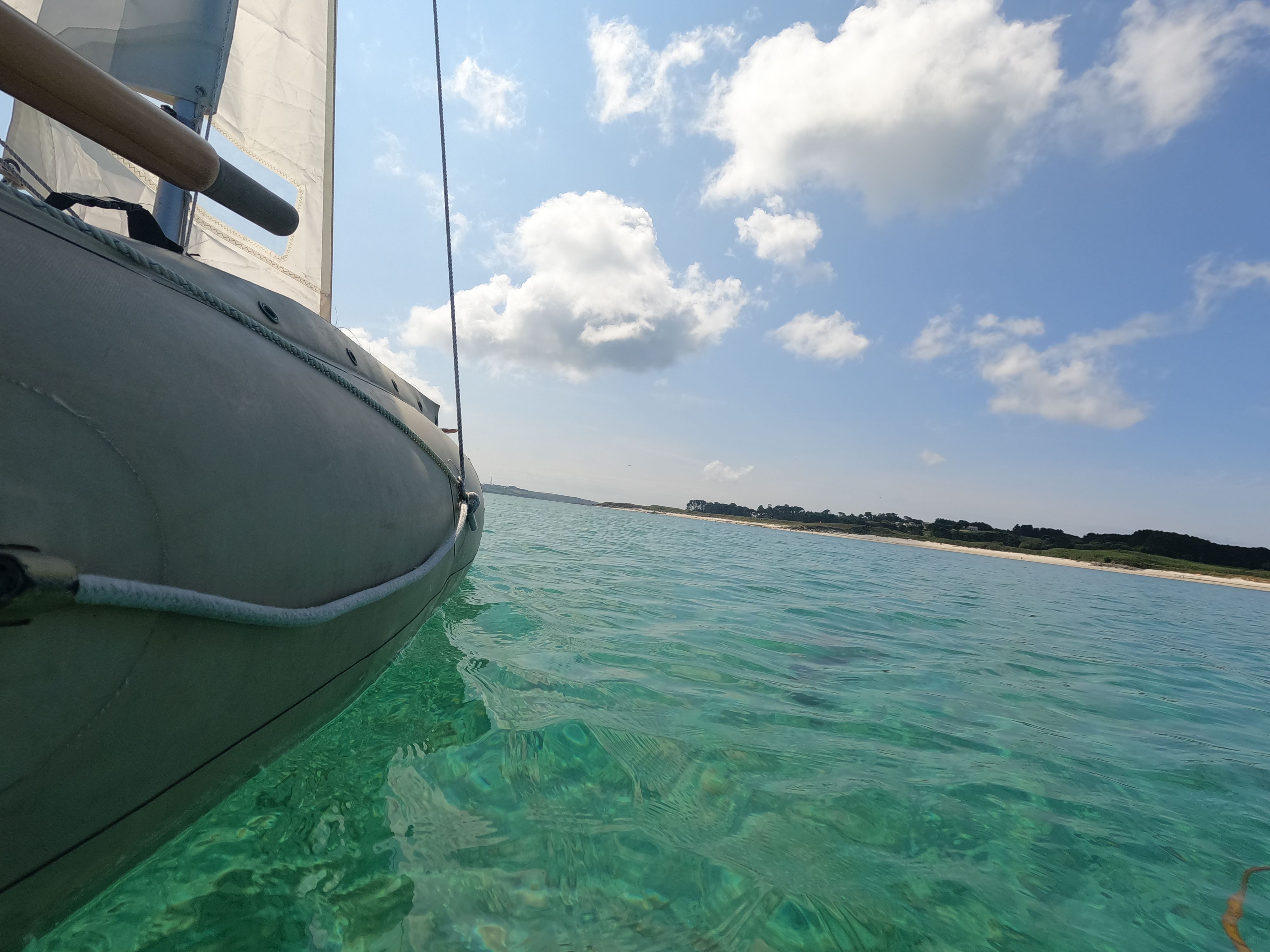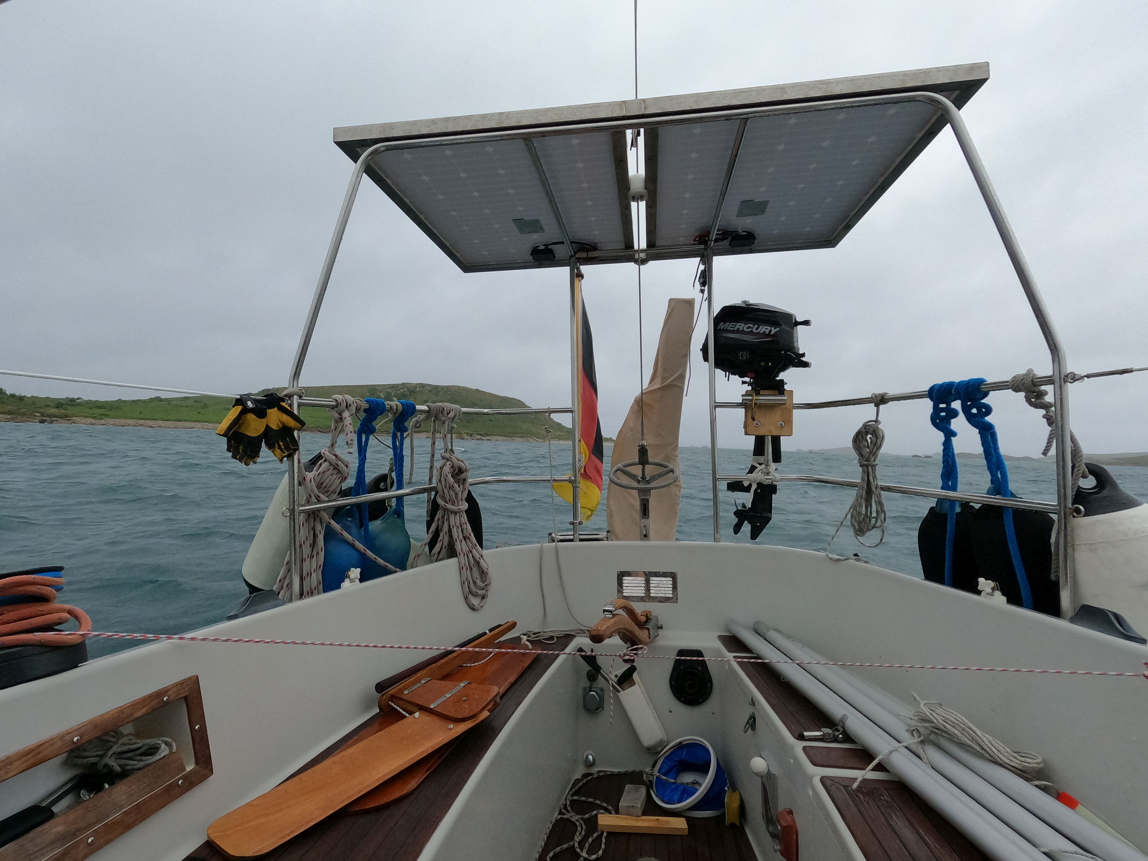 Dann packe ich Geld und Rucksack ein und mache mich auf den Weg zur Insel Tresco. Trotz leichtem Wind komme ich am Wind kurzzeitig auf knapp über drei Knoten. Meist geht es aber deutlich langsamer voran. Für die eine Meile zum Strand von Old Grimsby brauche ich fast eine Stunde. Aber es ist angenehmes vorankommen. Mit nur einem leichten Glucksen gleitet das Boot durchs Wasser und springt bei der leichtesten Bö sofort an.
