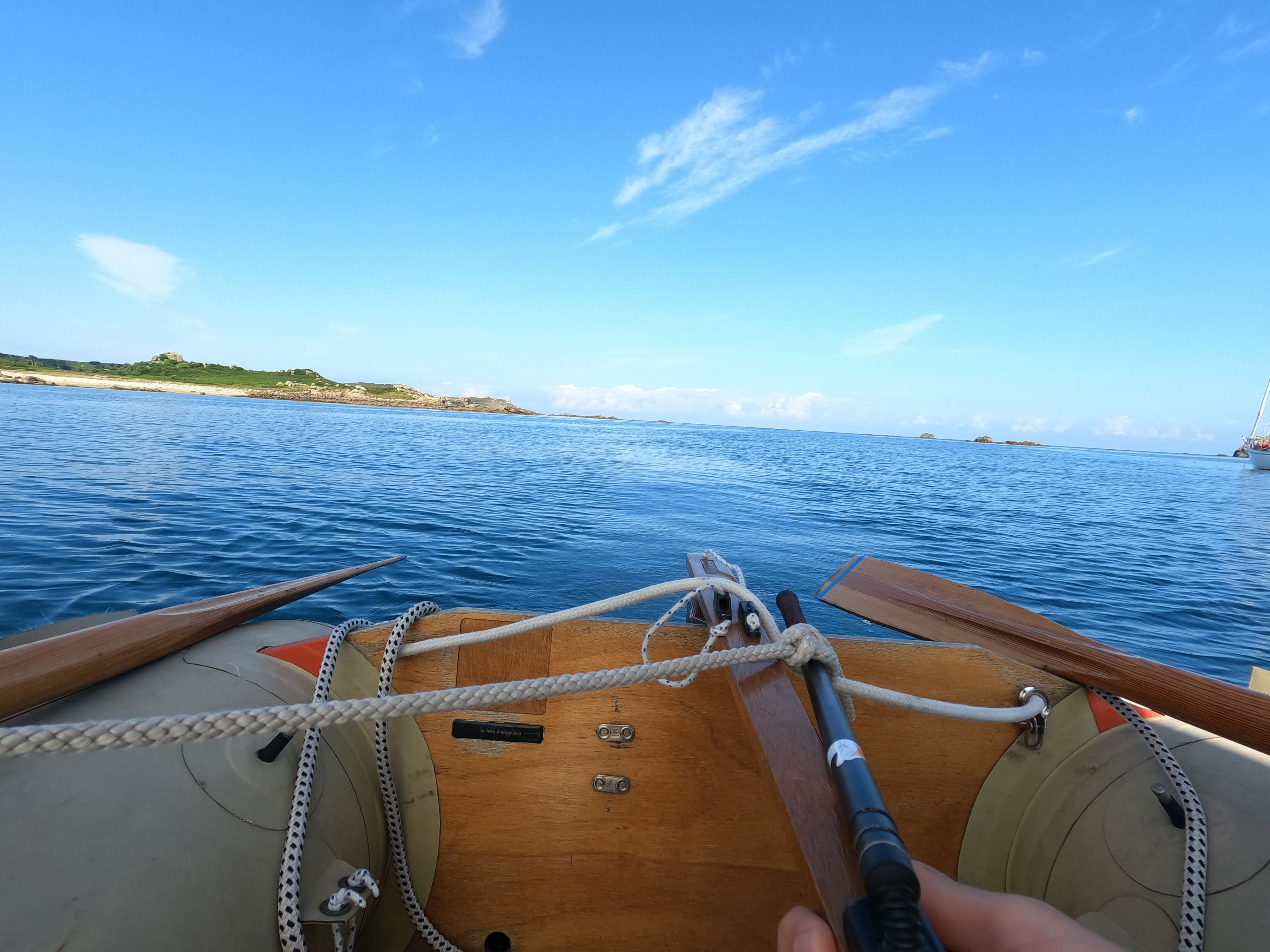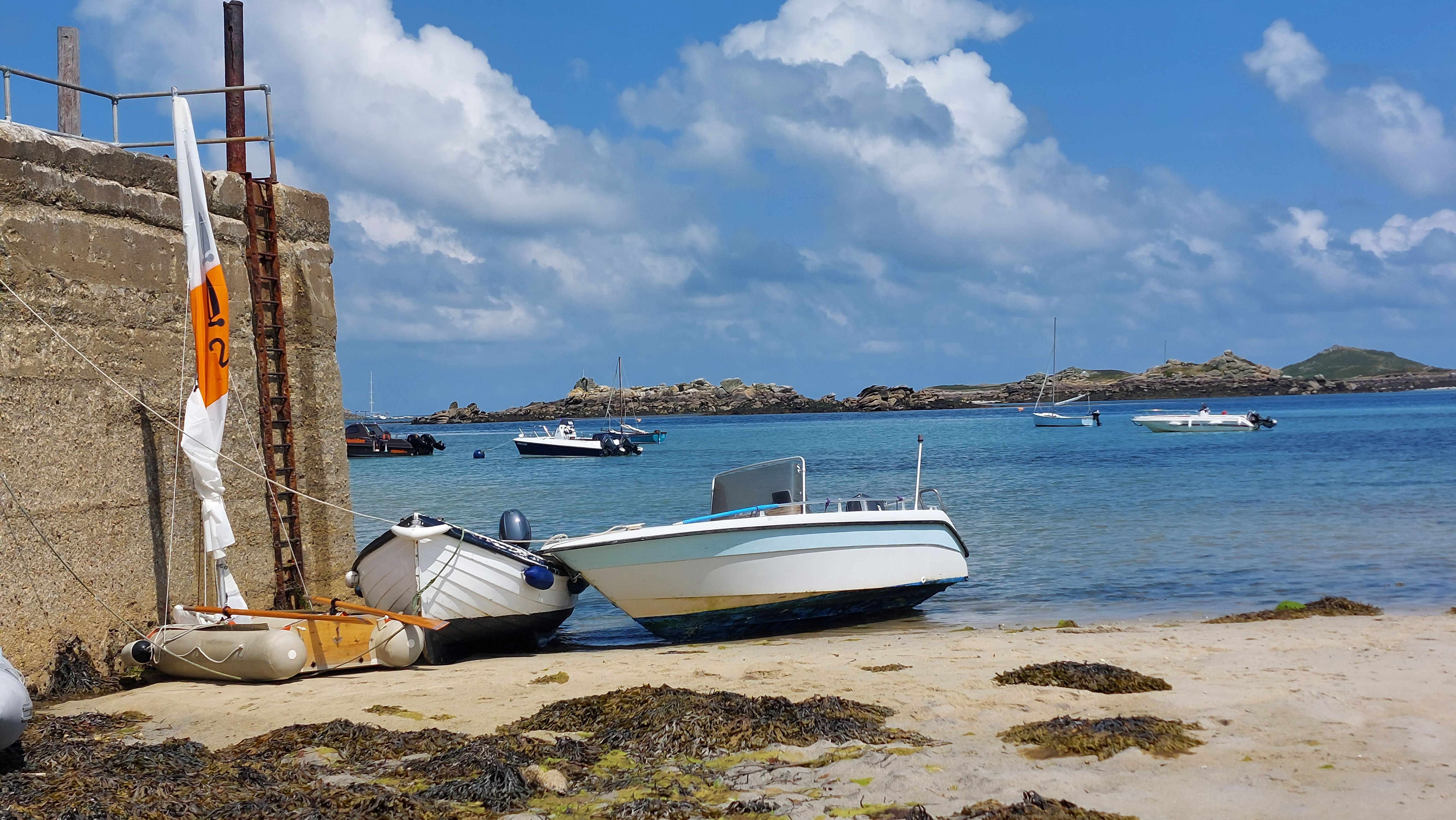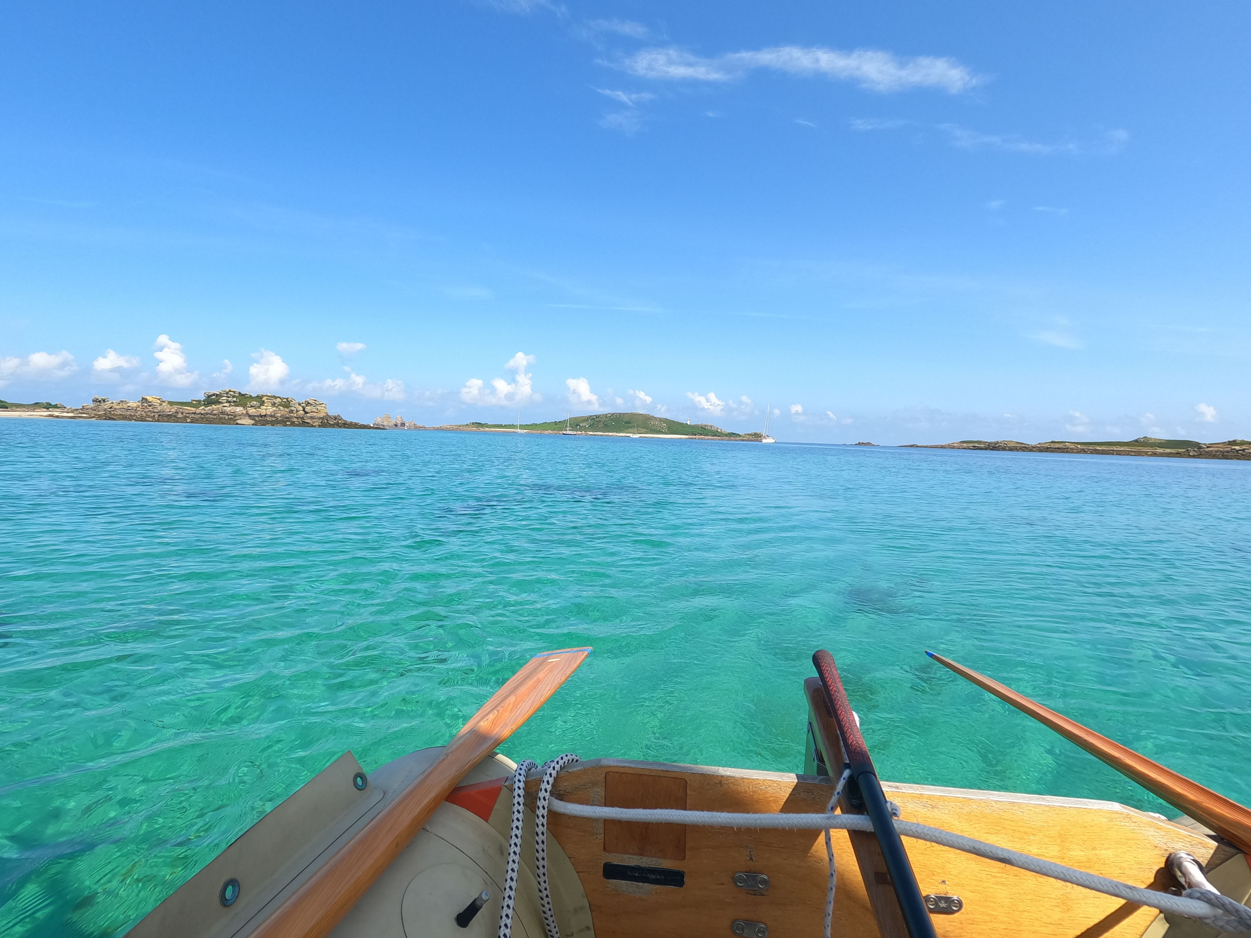 Dann packe ich Geld und Rucksack ein und mache mich auf den Weg zur Insel Tresco. Trotz leichtem Wind komme ich am Wind kurzzeitig auf knapp über drei Knoten. Meist geht es aber deutlich langsamer voran. Für die eine Meile zum Strand von Old Grimsby brauche ich fast eine Stunde. Aber es ist angenehmes vorankommen. Mit nur einem leichten Glucksen gleitet das Boot durchs Wasser und springt bei der leichtesten Bö sofort an.
