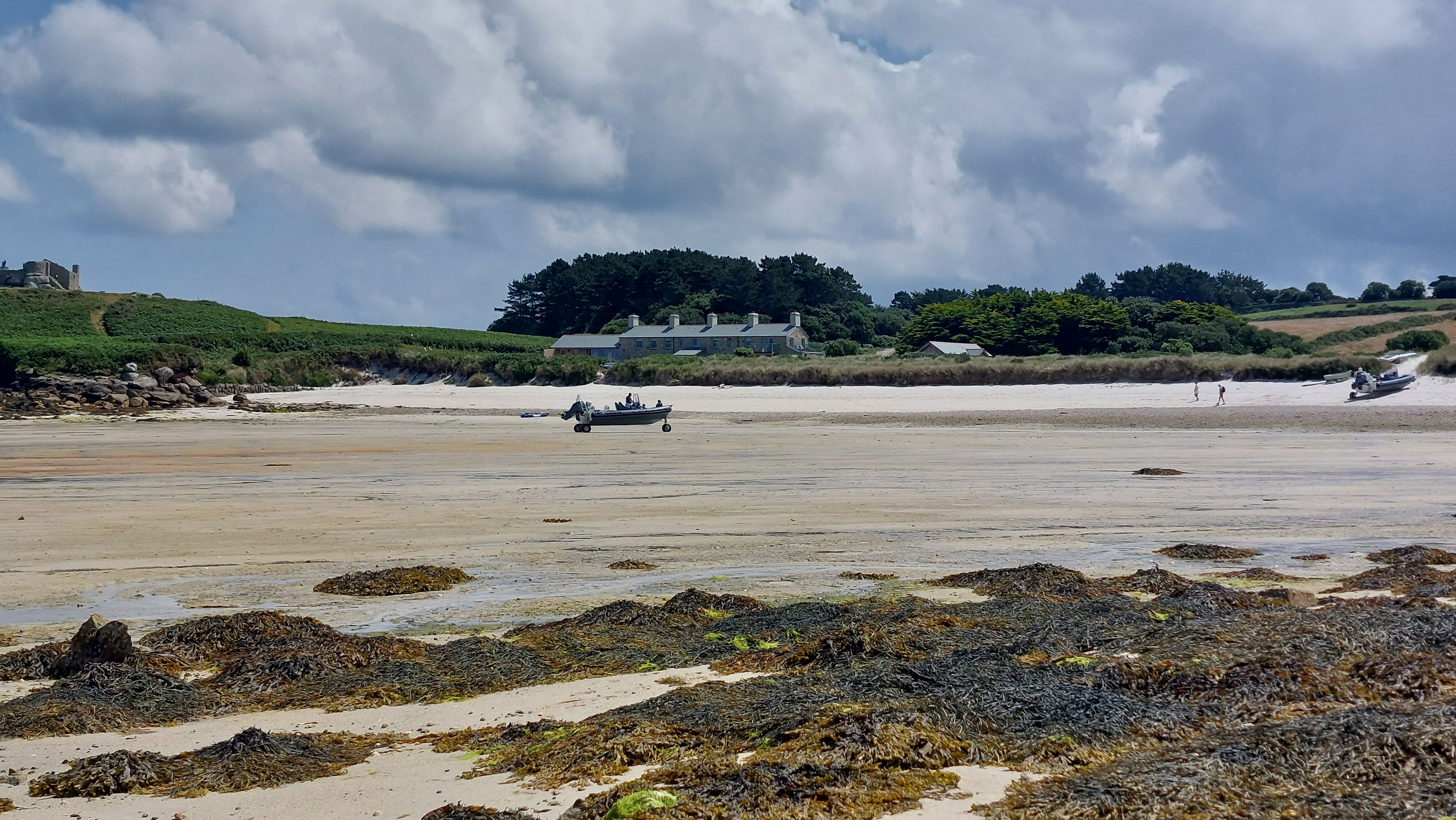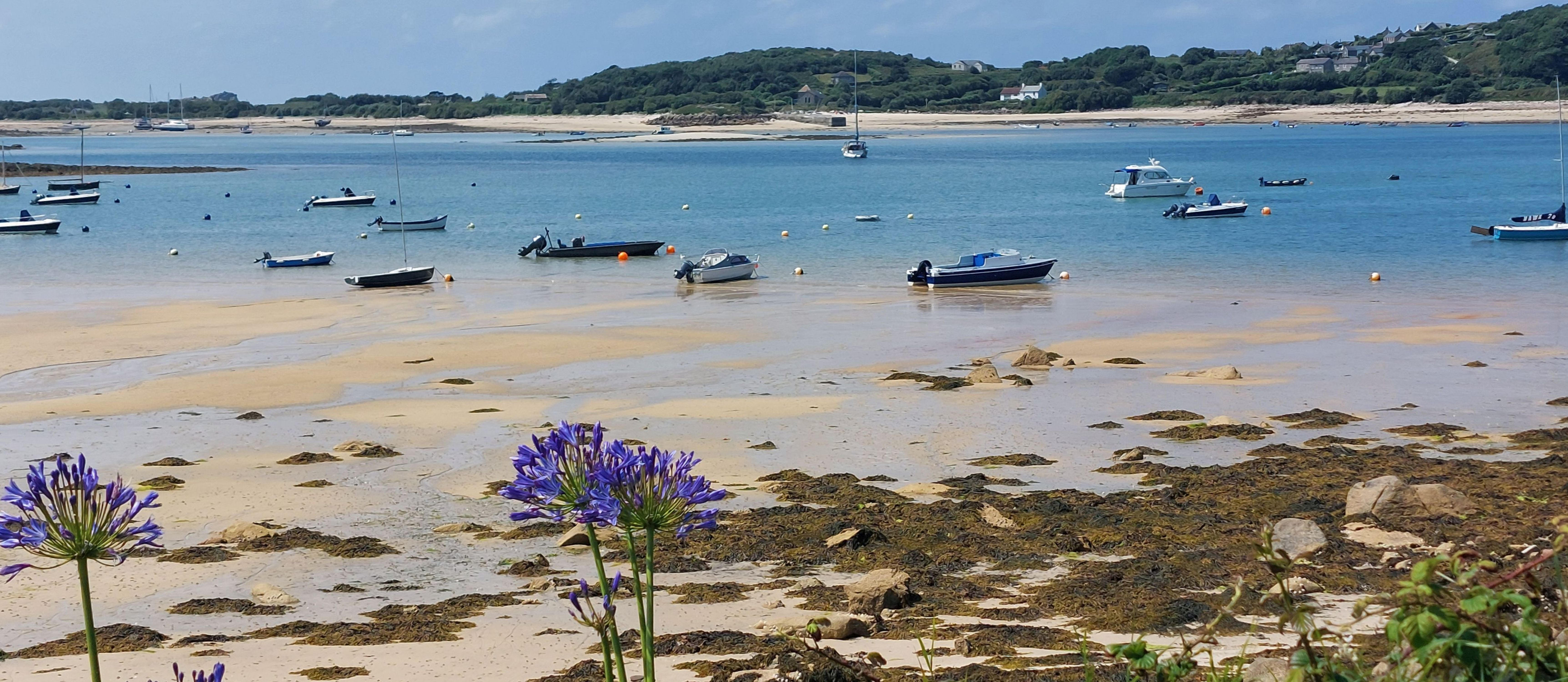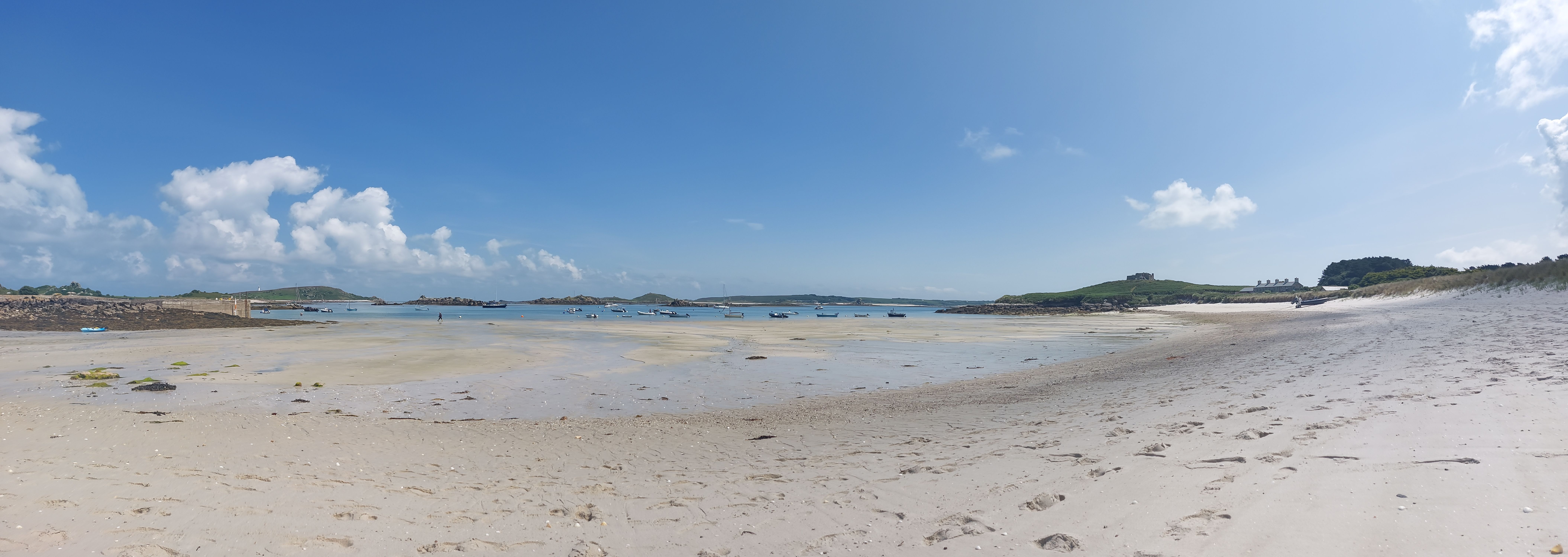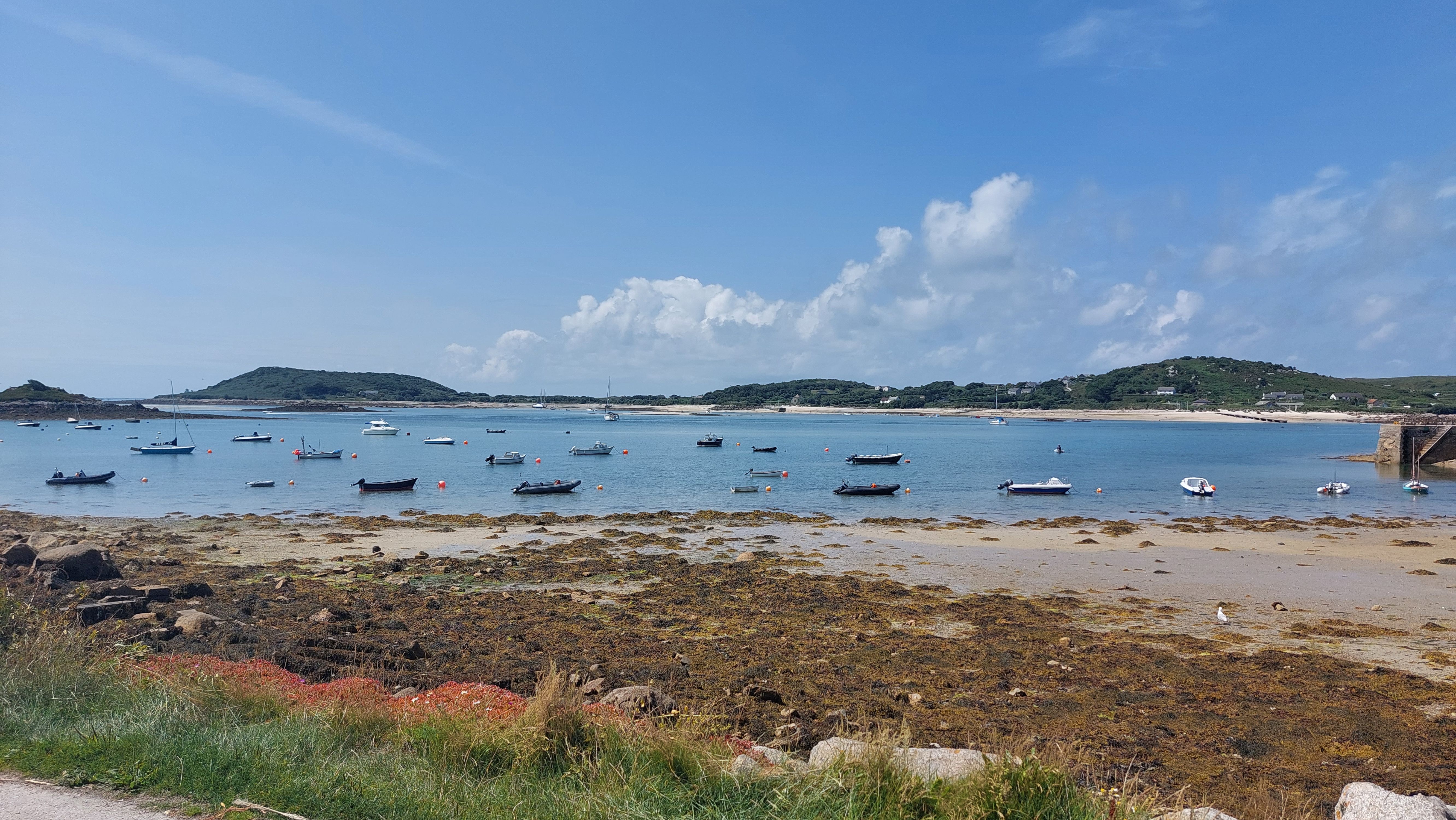 Dann packe ich Geld und Rucksack ein und mache mich auf den Weg zur Insel Tresco. Trotz leichtem Wind komme ich am Wind kurzzeitig auf knapp über drei Knoten. Meist geht es aber deutlich langsamer voran. Für die eine Meile zum Strand von Old Grimsby brauche ich fast eine Stunde. Aber es ist angenehmes vorankommen. Mit nur einem leichten Glucksen gleitet das Boot durchs Wasser und springt bei der leichtesten Bö sofort an.