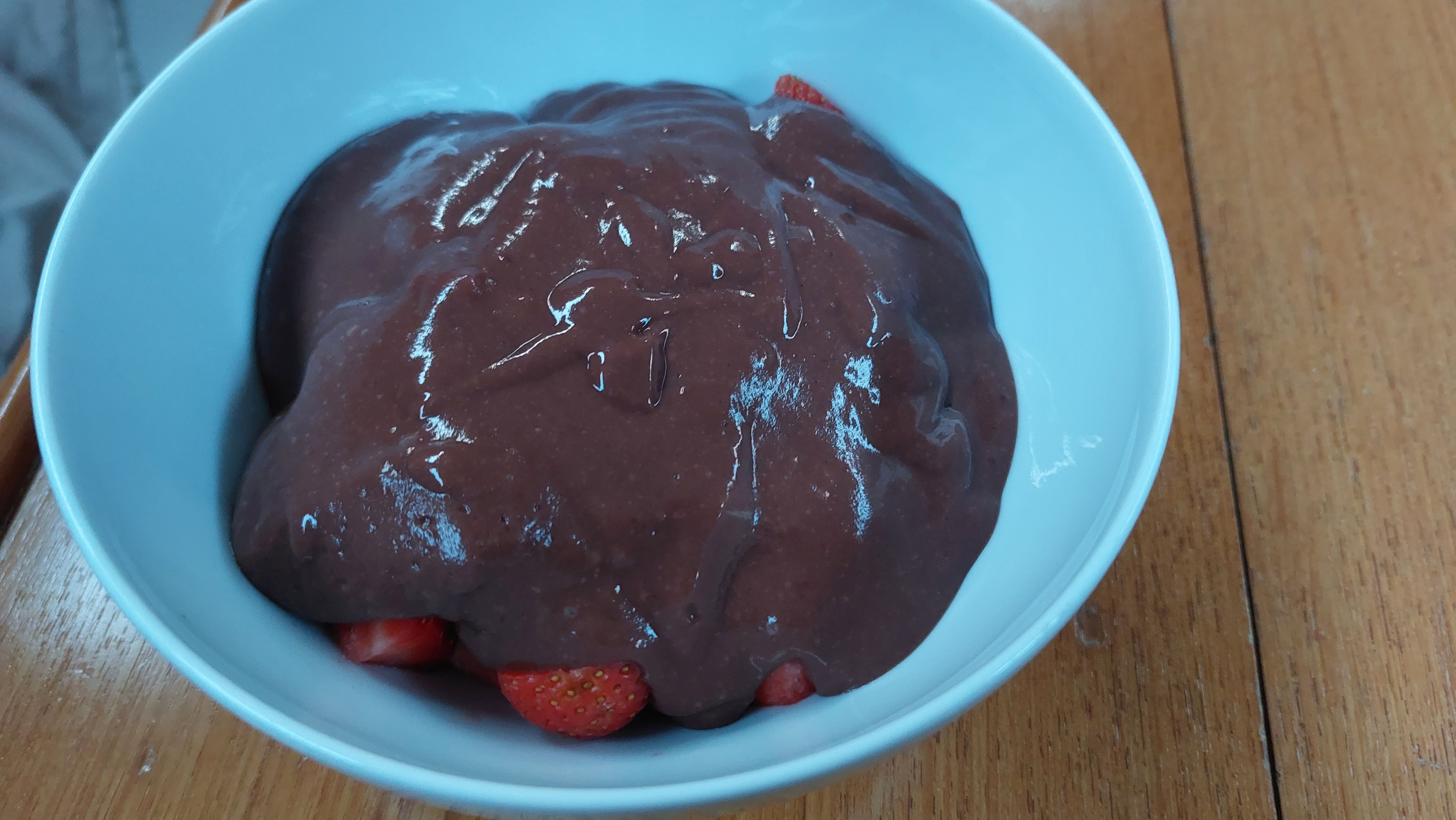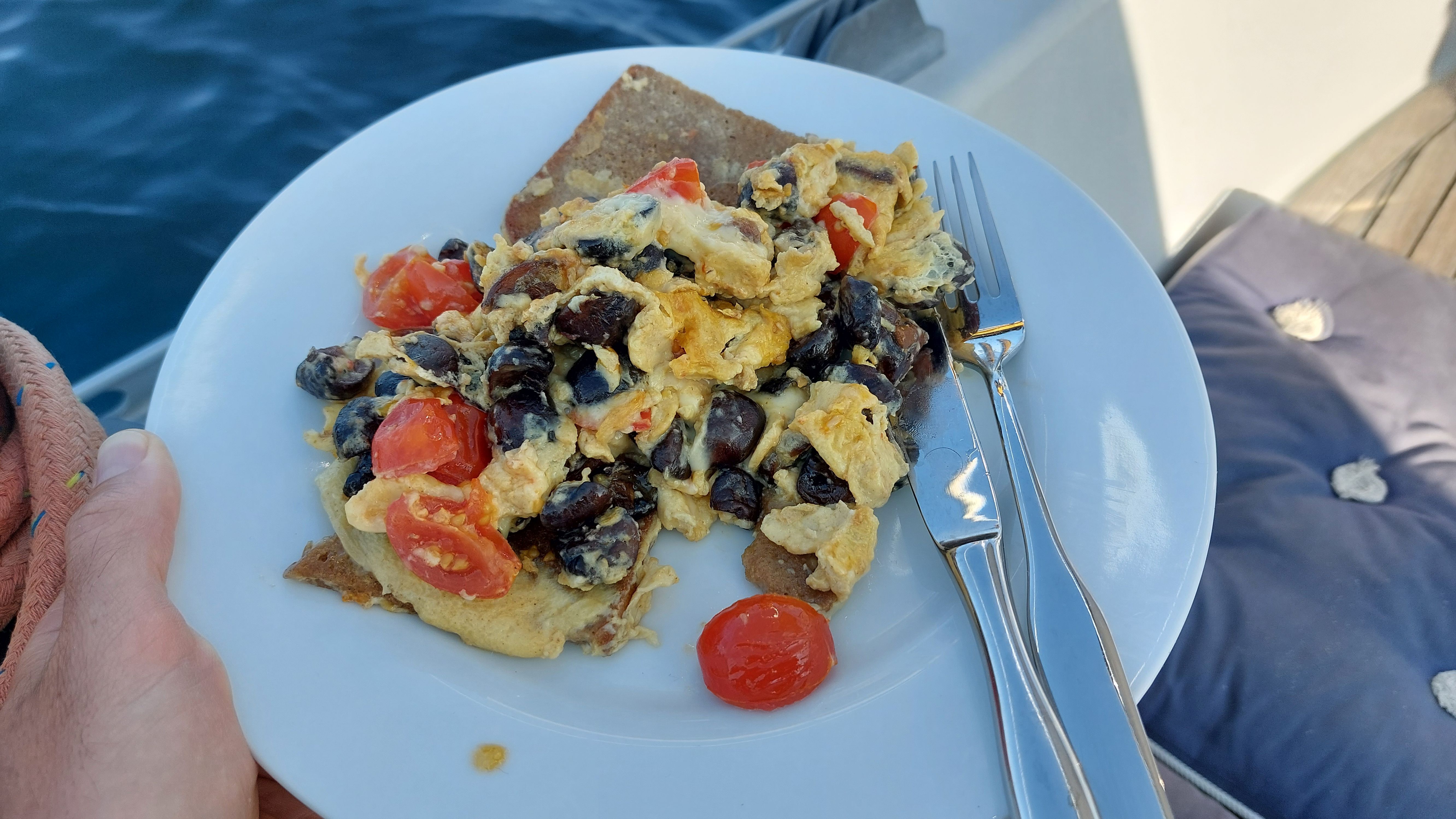 Mit frischem Obst und Gemüse an Bord kann wieder geschlemmt werden. Zu Abend gibt es Pilzrührei mit getoastetem Brot und zum Nachtisch Erdbeeren mit aus Mandelmilch angerührtem Schokopudding.