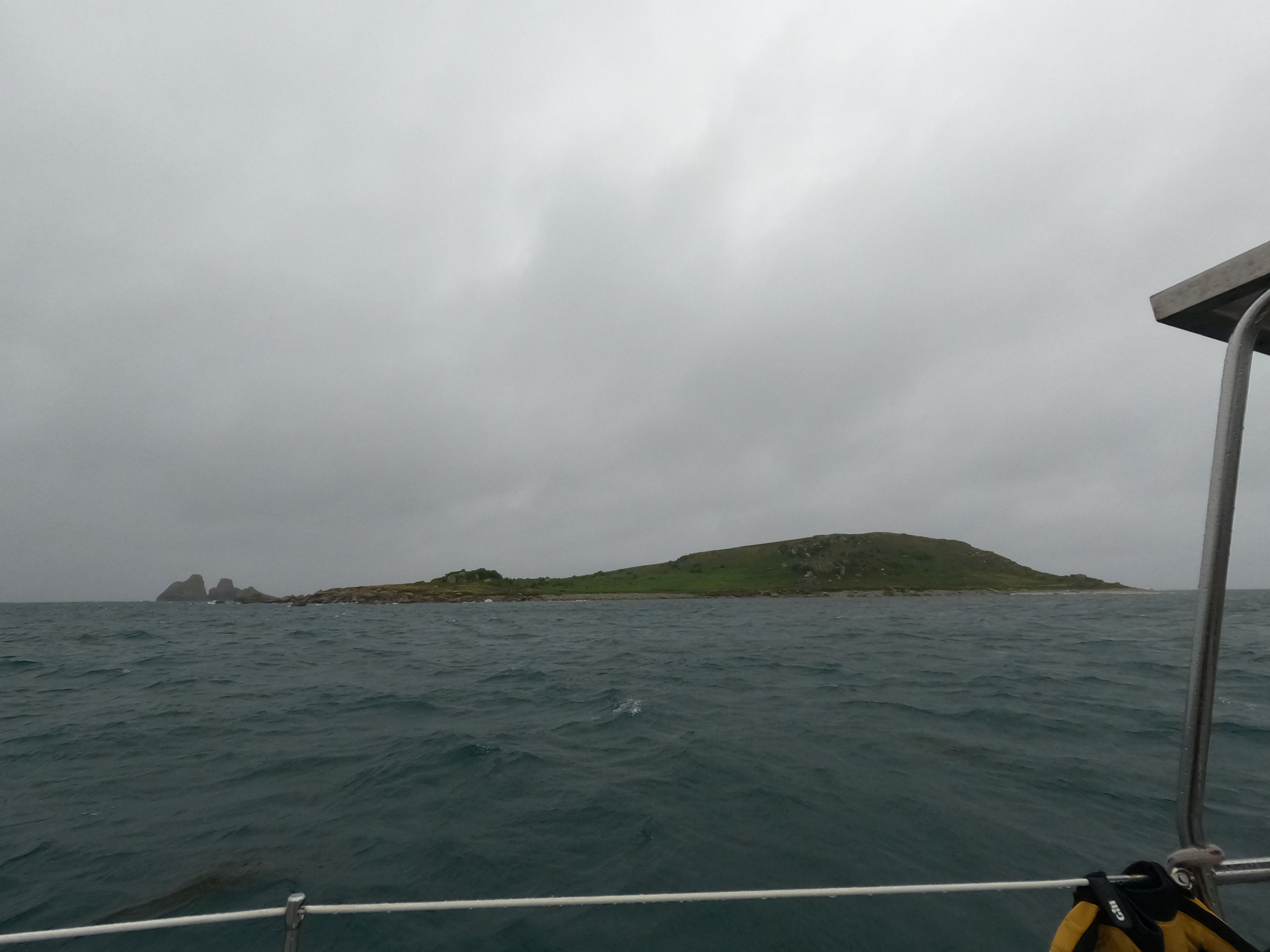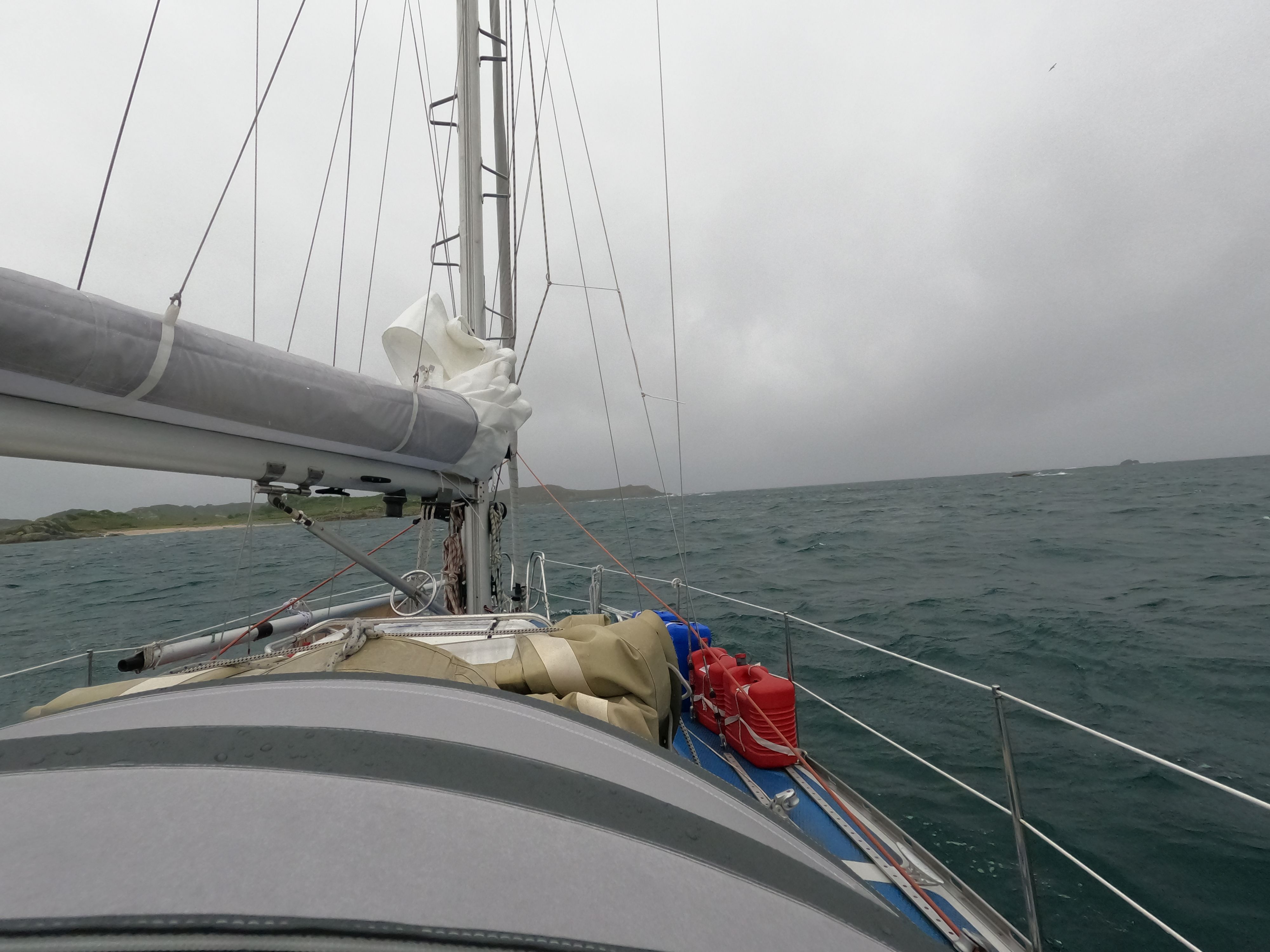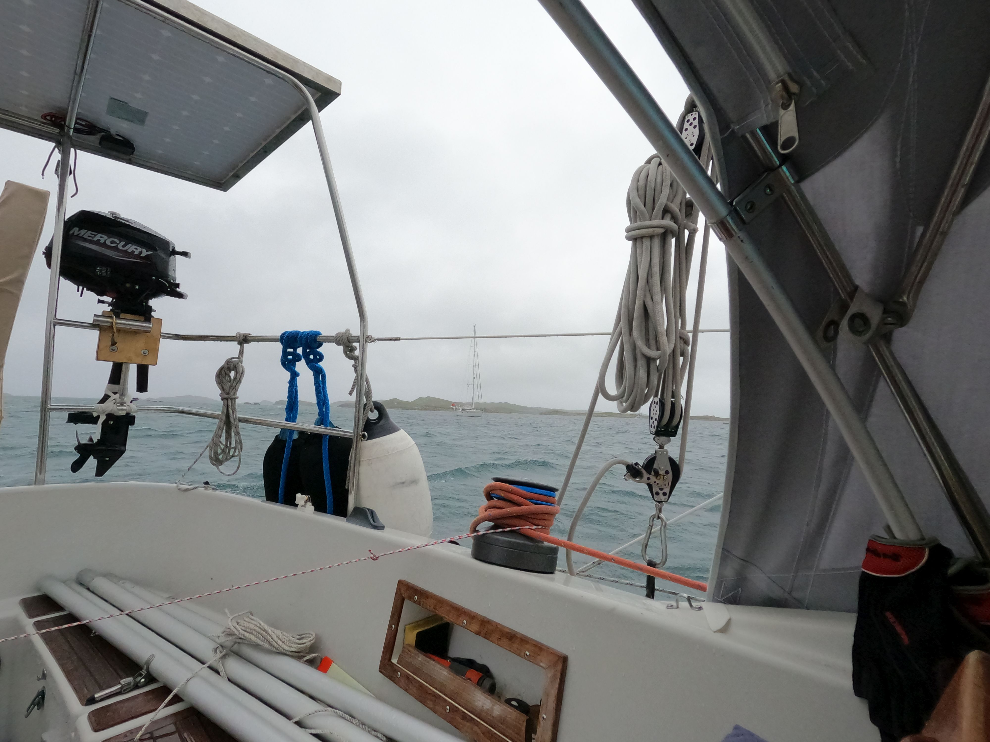 Es fetzt und regnet den ganzen Tag. Bei Hochwasser ist ein Großteil der Felsen im Nordwesten überspült und es wird ganz schön schaukelig am Ankerplatz. Selbst die große Oyster hinter mir gerät kräftig in Bewegung.