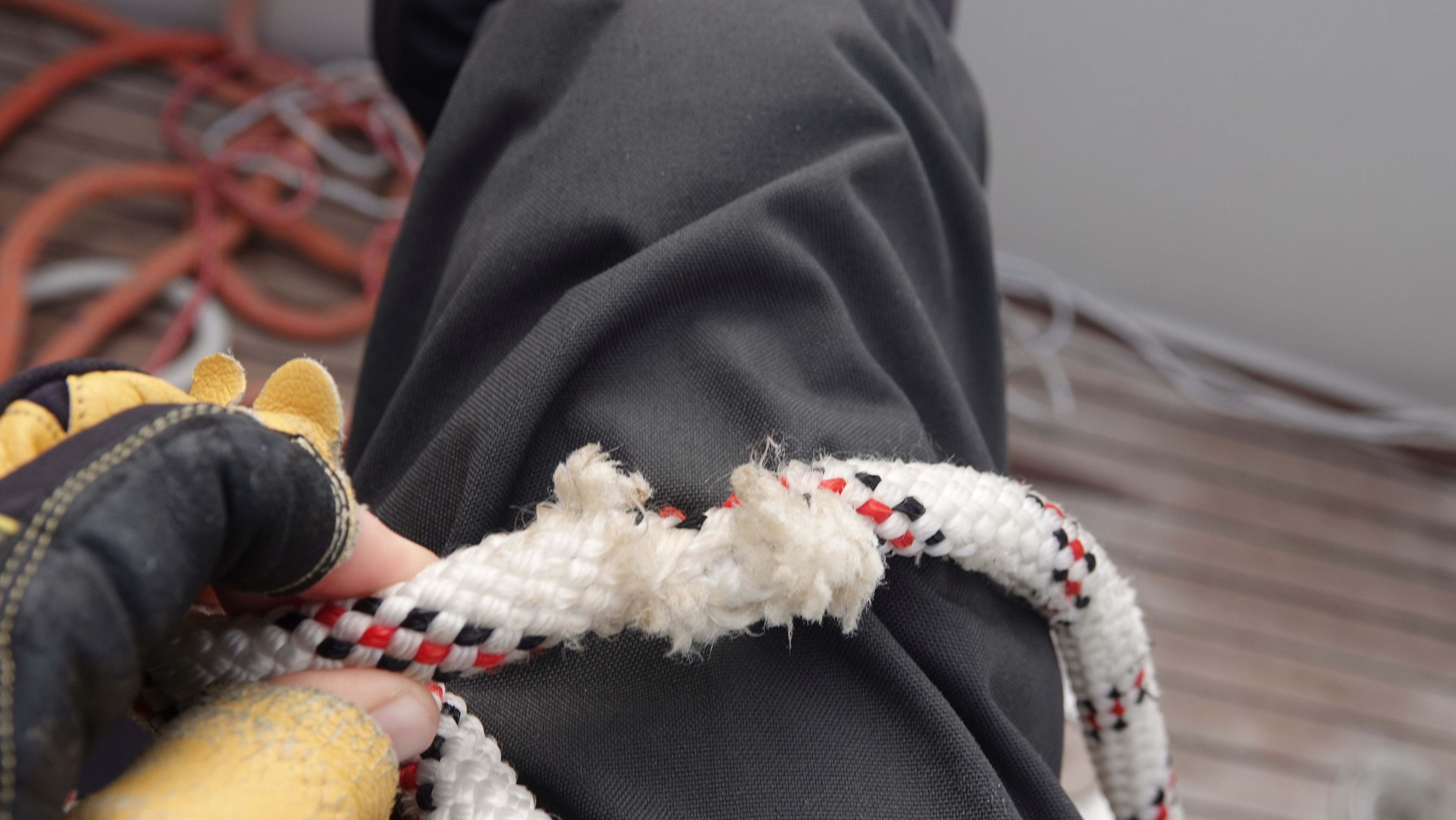 Am Sonntag lässt der Wind ein bisschen nach. Nachmittags kommt sogar hin und wieder die Sonne für ein paar Minuten heraus. Als ich am Abend den Tampen der Ankerkralle prüfe ist der fast durchgescheuert. Ich knote einen neuen Festmacher mit Ruckfender an und platziere ein Stück Schlauch als Schutz an der Lippklampe.