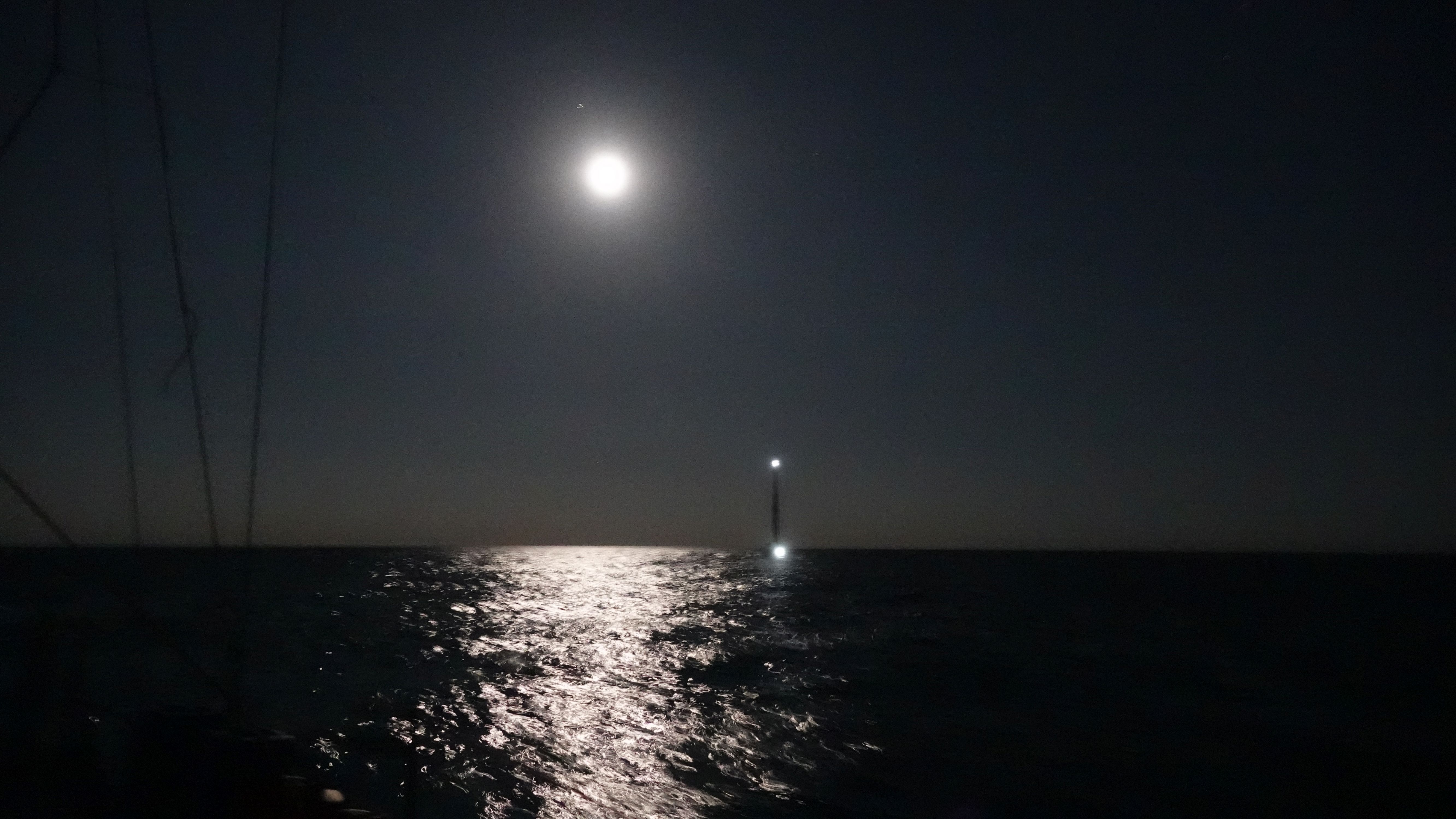 Heute Nacht habe ich wenig geschlafen. Der Wind hat gedreht und unangenehmen Schwell in der Bucht erzeugt. Als der Wecker um halb zwei klingelt bin ich bereits wach. Eine Stunde später lege ich von meiner Boje ab und motore in die trotz Vollmond finstere Nacht hinein.