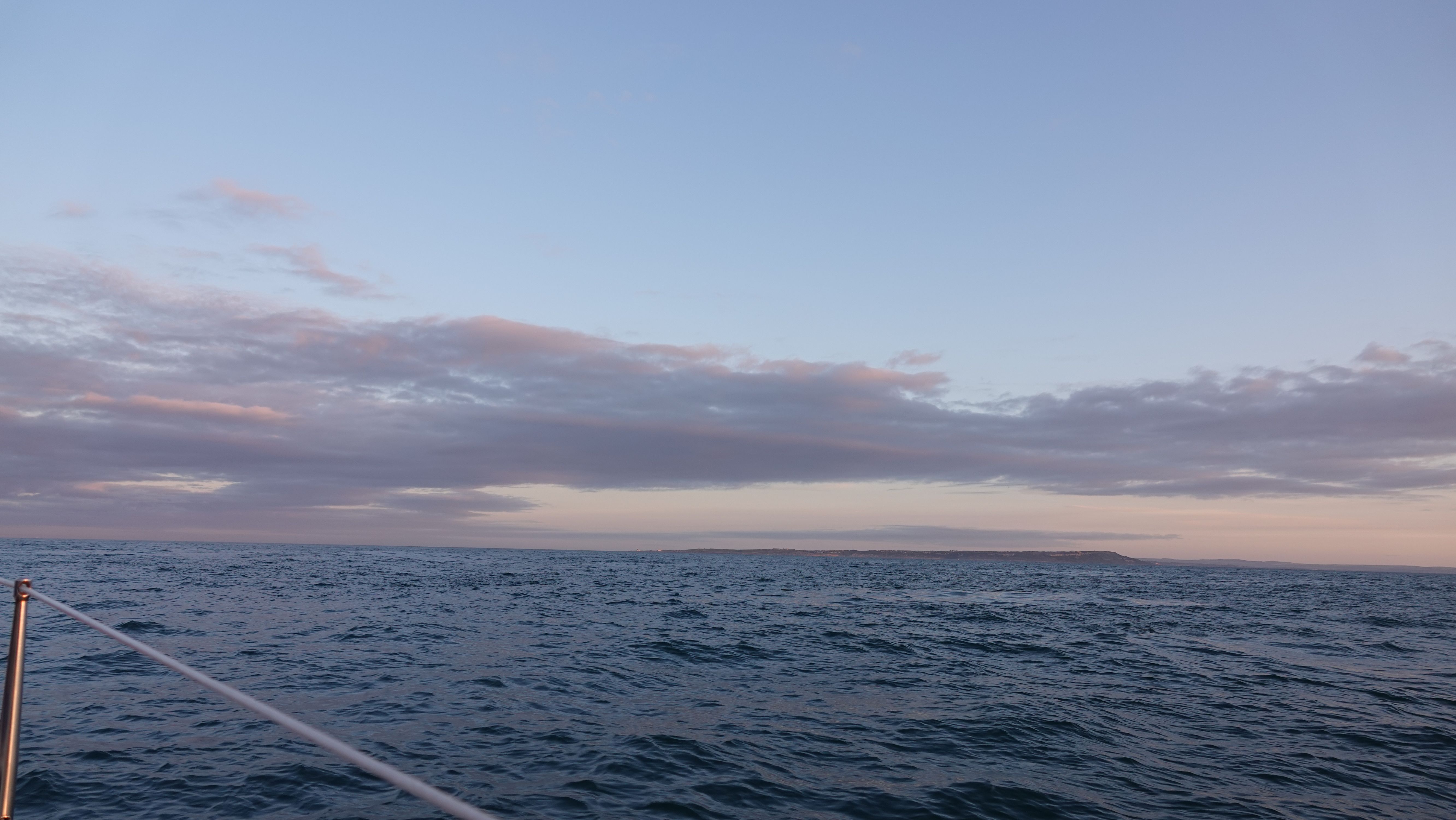 Das erste Kap ist St Alban's Ledge. Vor vielen der Landspitzen an der englischen Küste liegen weitläufige Untiefen, die zu gefährliche Seen und Strömungen führen können. Meist gibt es dort auch küstennahe Inshore-Passagen, die bei passenden Bedingungen den Weg um einiges abkürzen können. Doch diese Inshore-Passagen sind eng, sehr dicht unter der Küste und gespickt mit Hummerkörben und Fischernetzen, deren Bojen den Propeller und das Ruder lahmlegen können. Da die Bojen im Dunkeln selbst mit dem Mondlicht nicht wirklich auszumachen sind halte ich also die empfohlenen drei Meilen Abstand von St Alban's Head und später im ersten Sonnenlicht auch von Portland Bill.