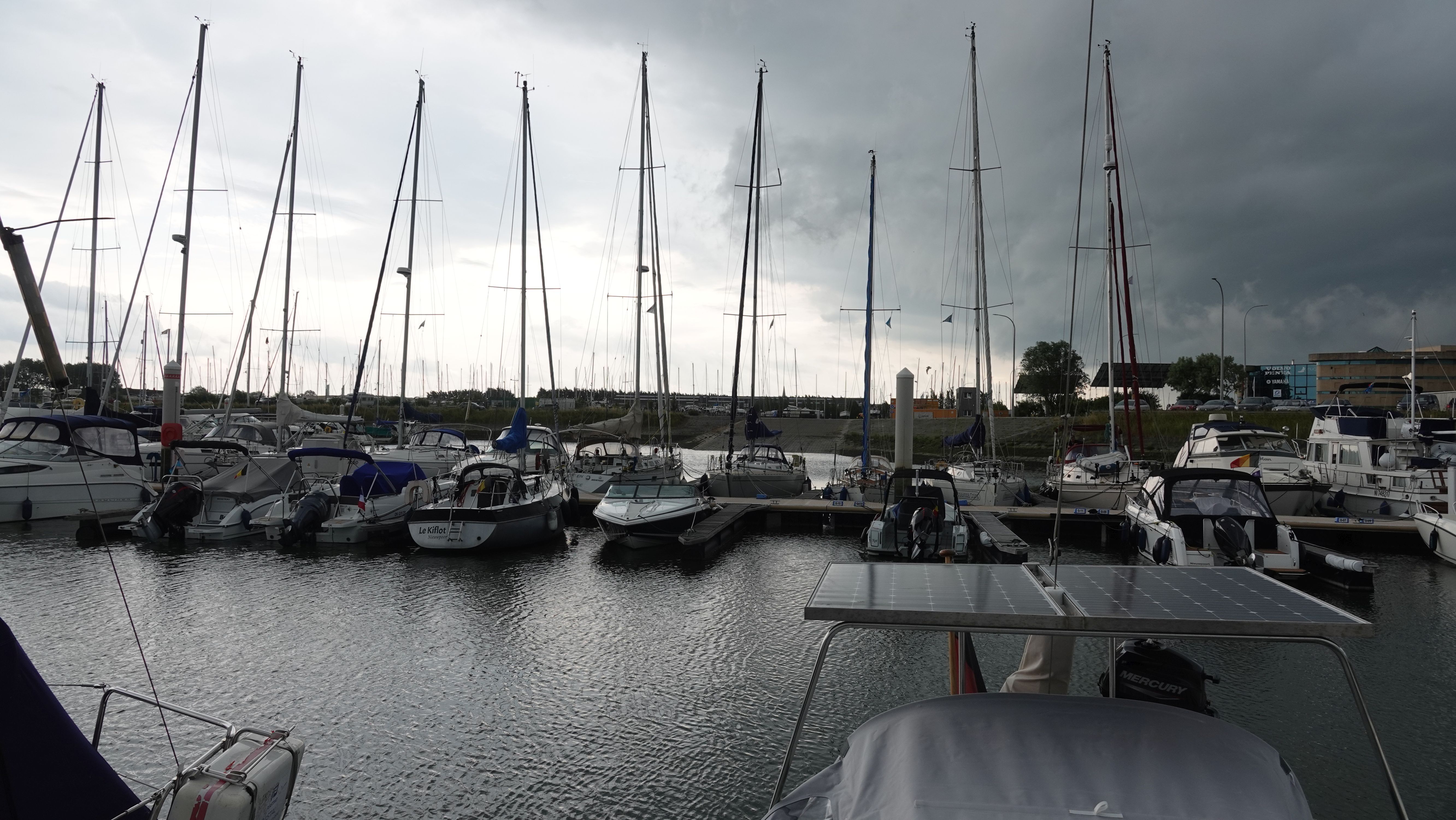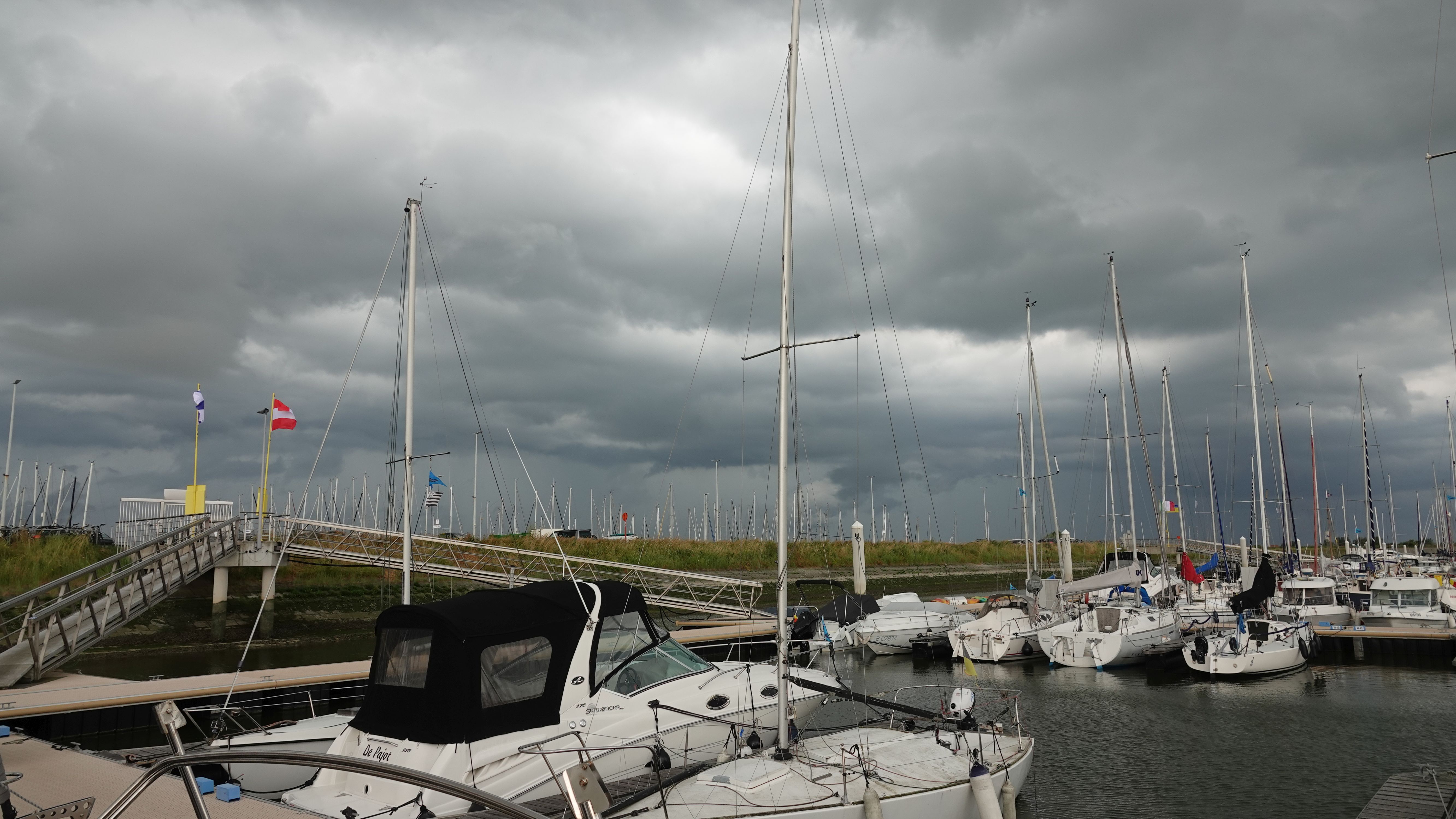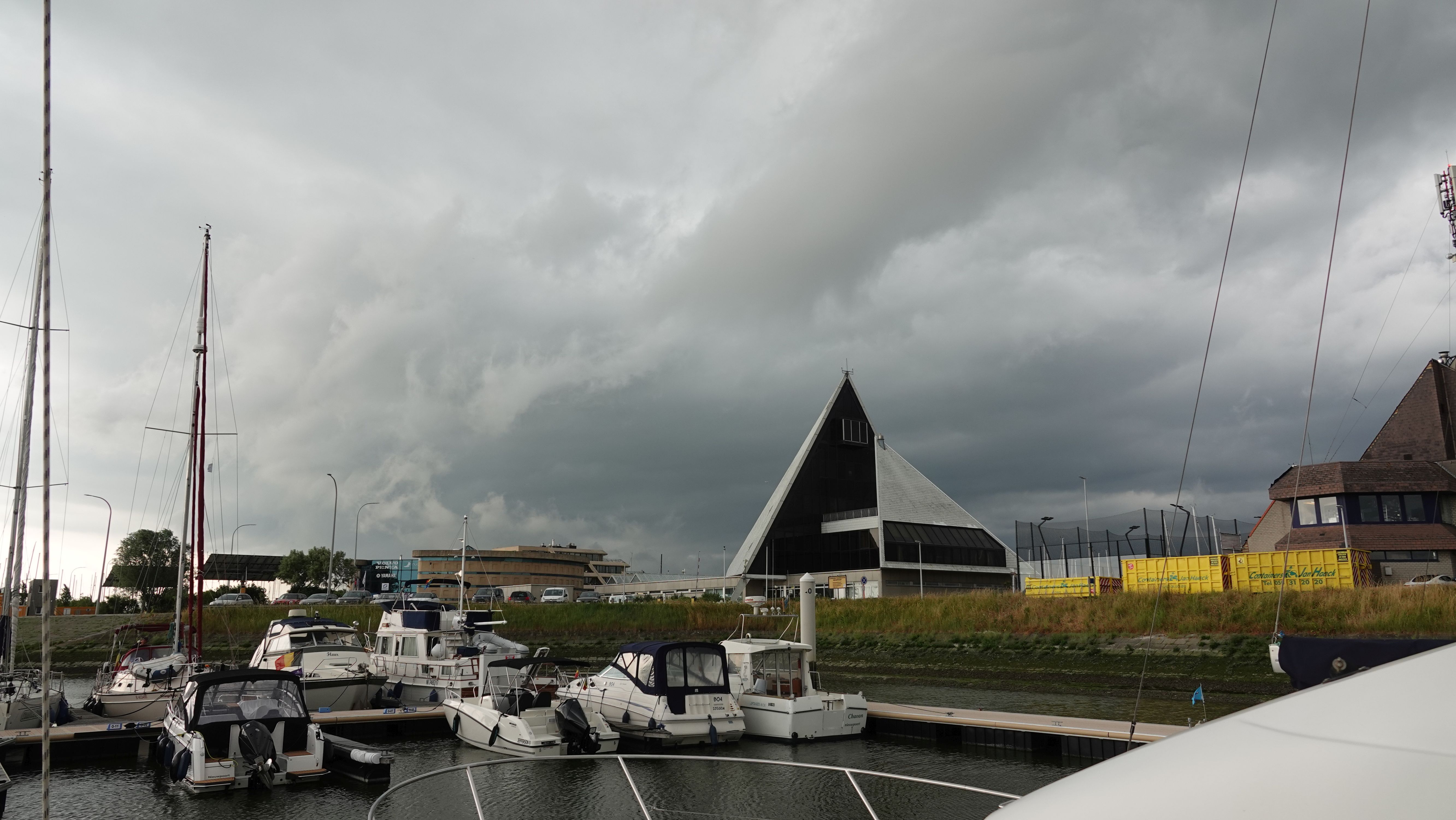 Ich lege zunächst in der Westseite des Hafens direkt im Fluss Yser an, verhole mich nach einem Besuch bei der Rezeption dann aber noch in das Ostbecken. Kurz nachdem ich fest bin ziehen dann auch die dunklen Wolken auf. Schnell baue ich die Kuchenbude auf, dann fallen auch schon die ersten dicken Tropfen.