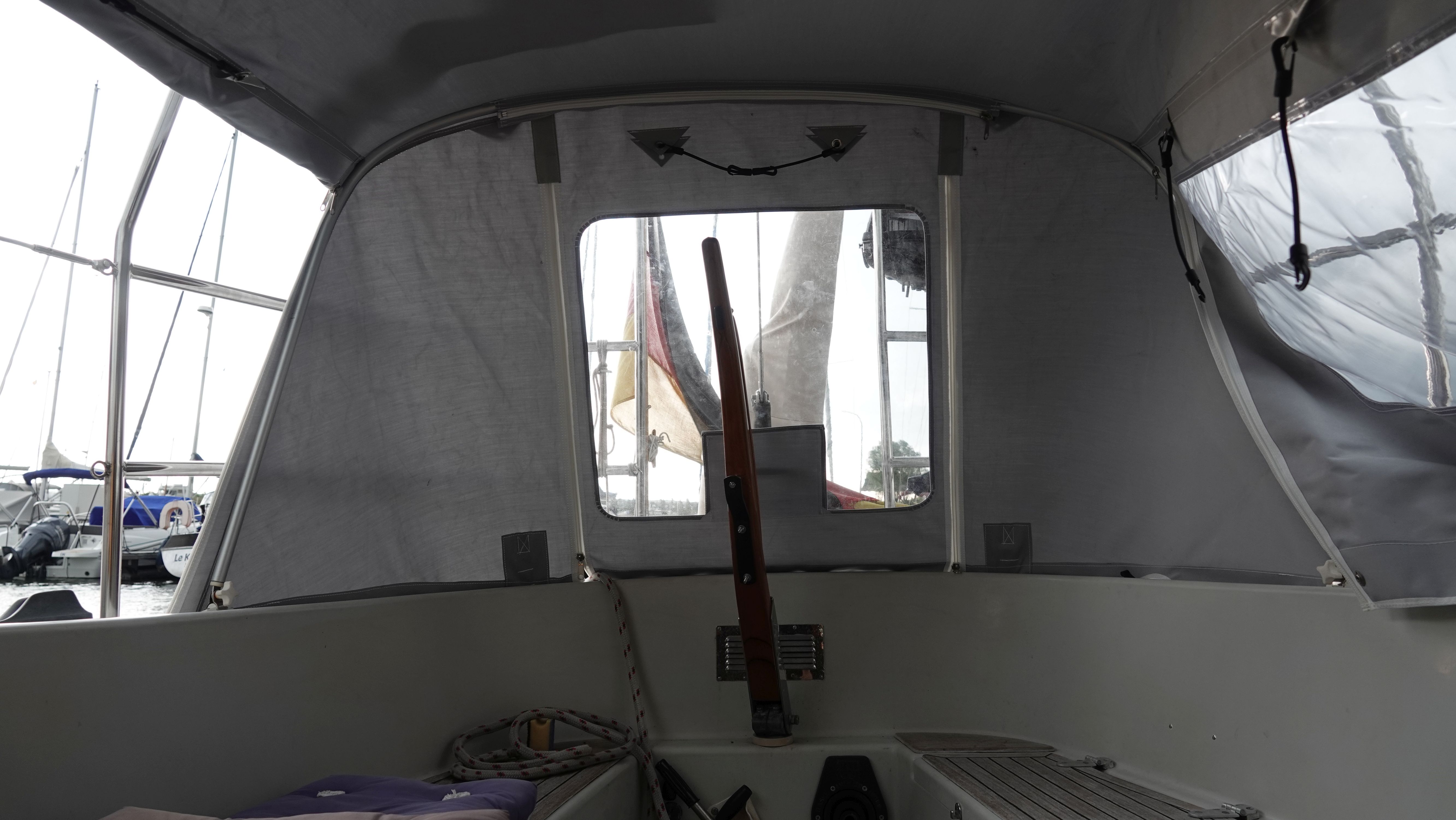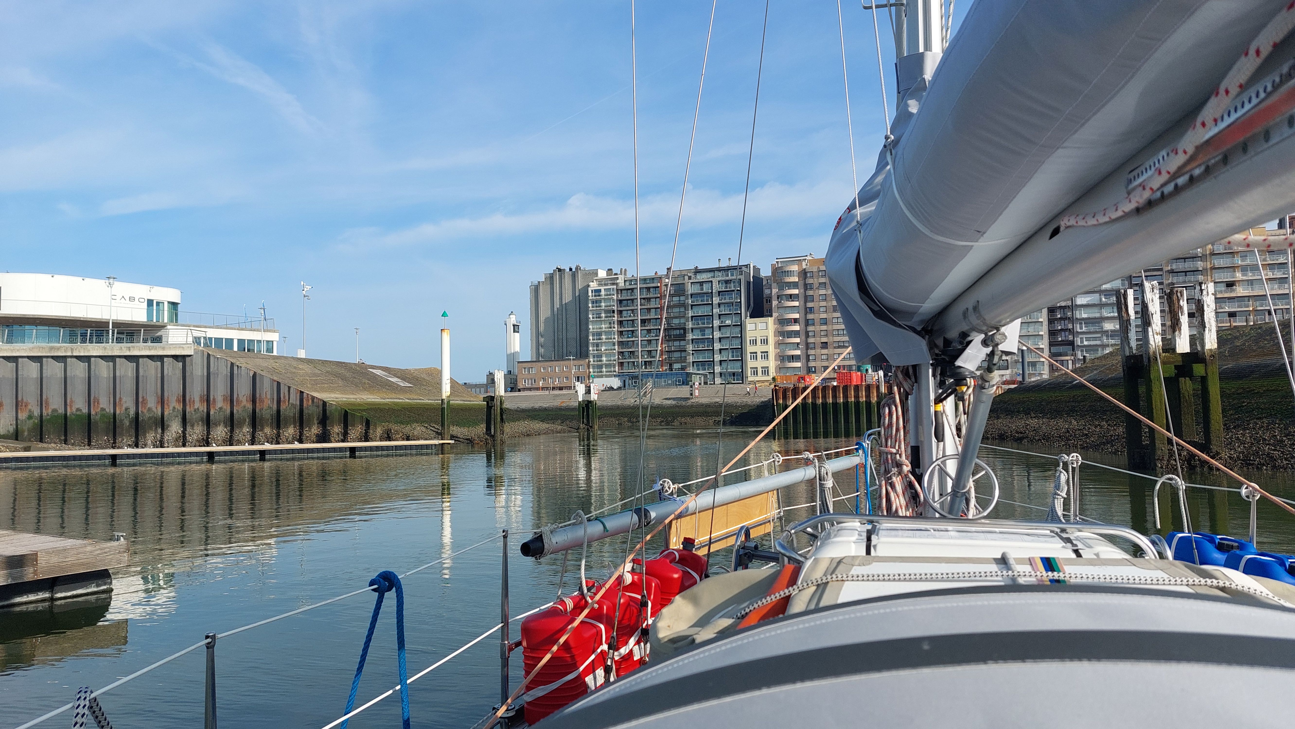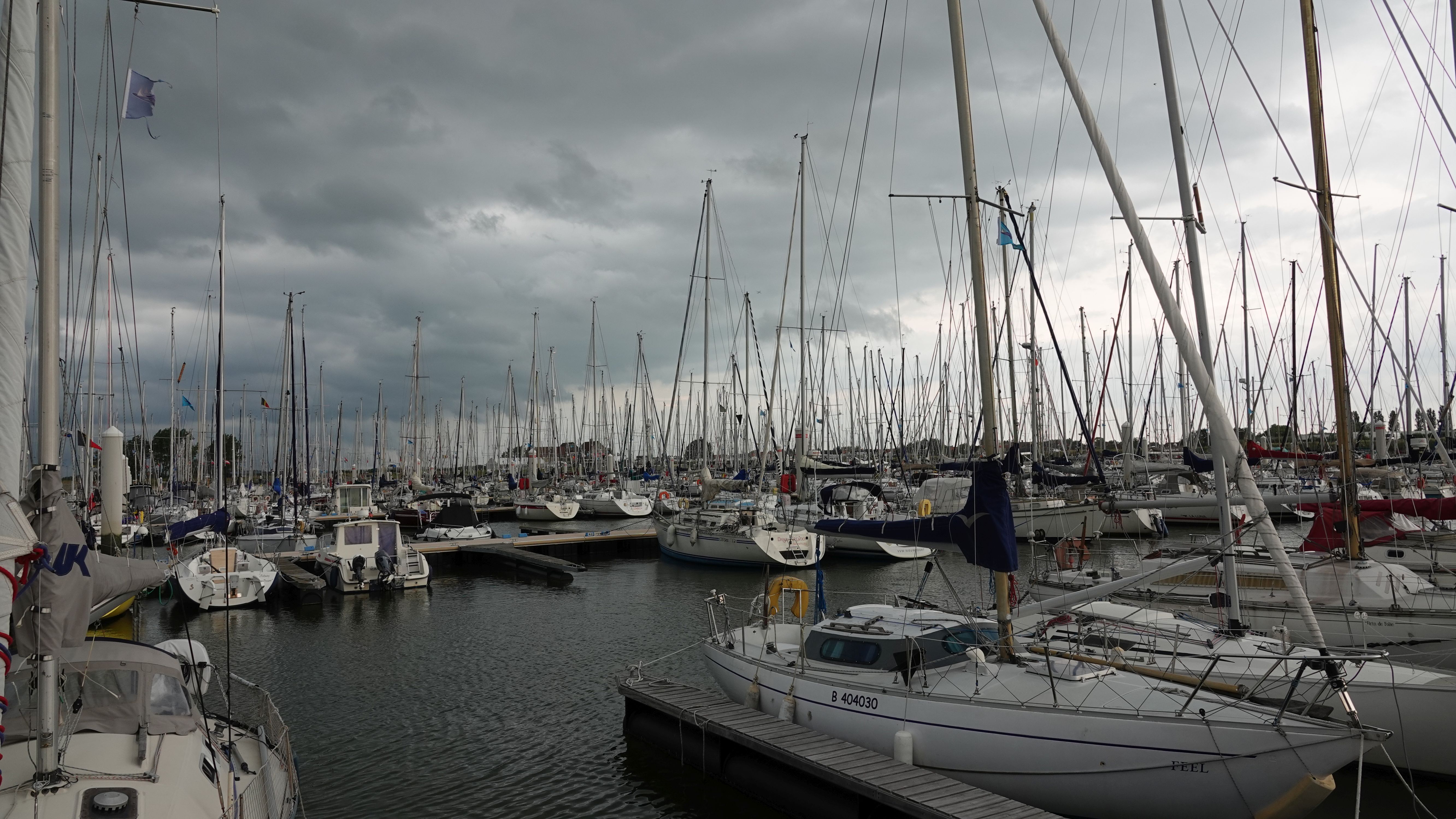 Ich lege zunächst in der Westseite des Hafens direkt im Fluss Yser an, verhole mich nach einem Besuch bei der Rezeption dann aber noch in das Ostbecken. Kurz nachdem ich fest bin ziehen dann auch die dunklen Wolken auf. Schnell baue ich die Kuchenbude auf, dann fallen auch schon die ersten dicken Tropfen.