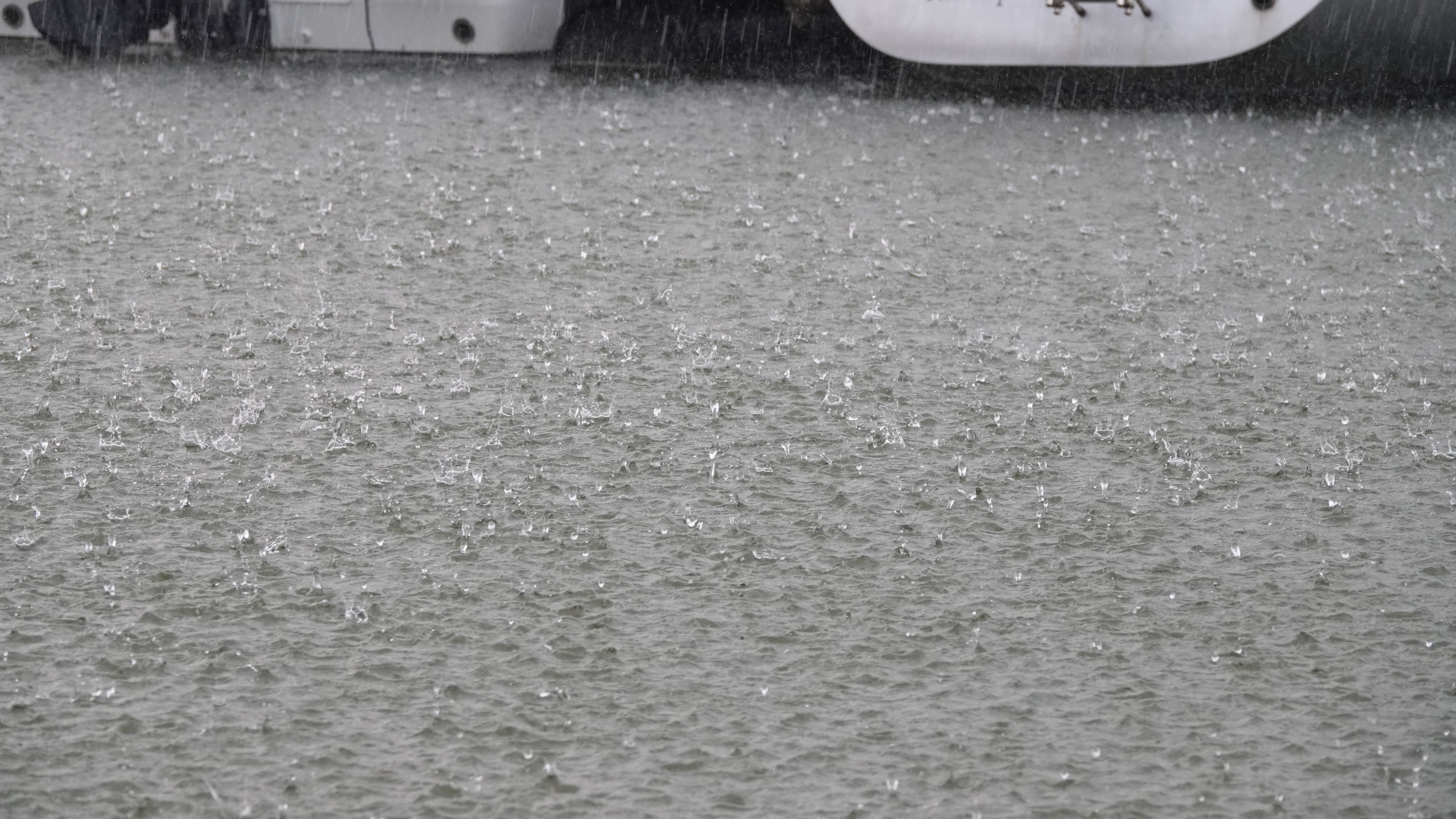 Das Wasser wird vom Regen regelrecht aufgepeitscht und der Donner rollt eine Dreiviertelstunde lang kontinuierlich von Nordost nach Südwest über den Hafen hinweg. Sobald die Lautstärke des Grollens im Süden etwas nachlässt beginnt es im Norden wieder.