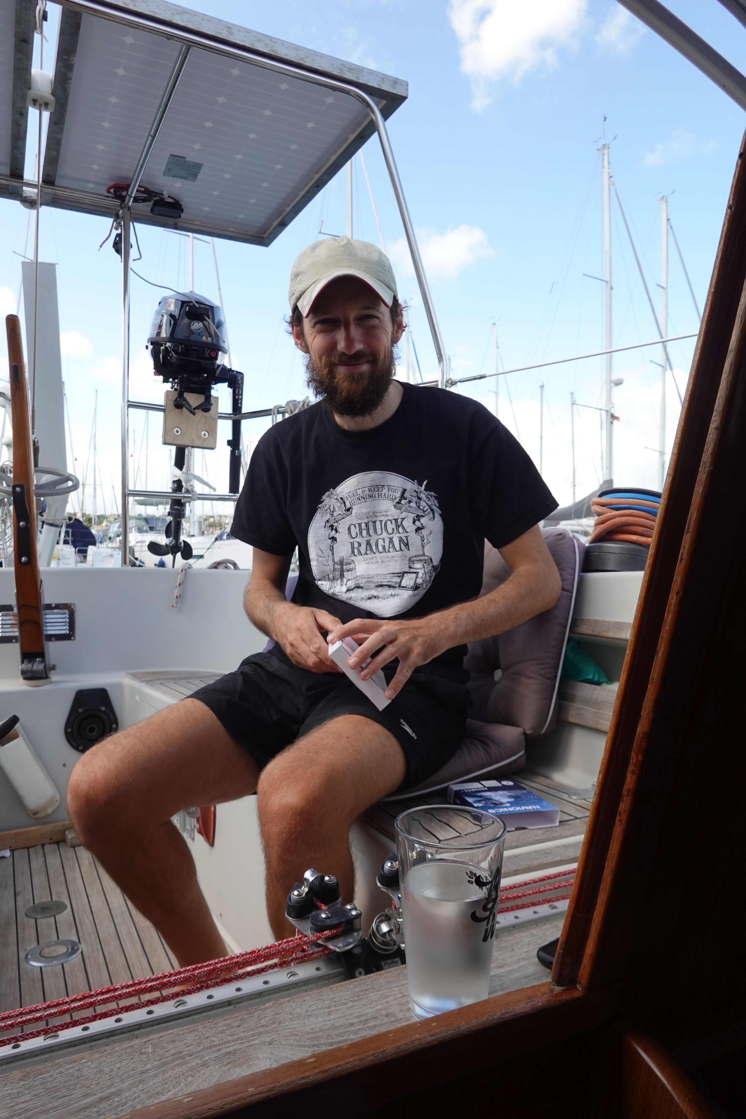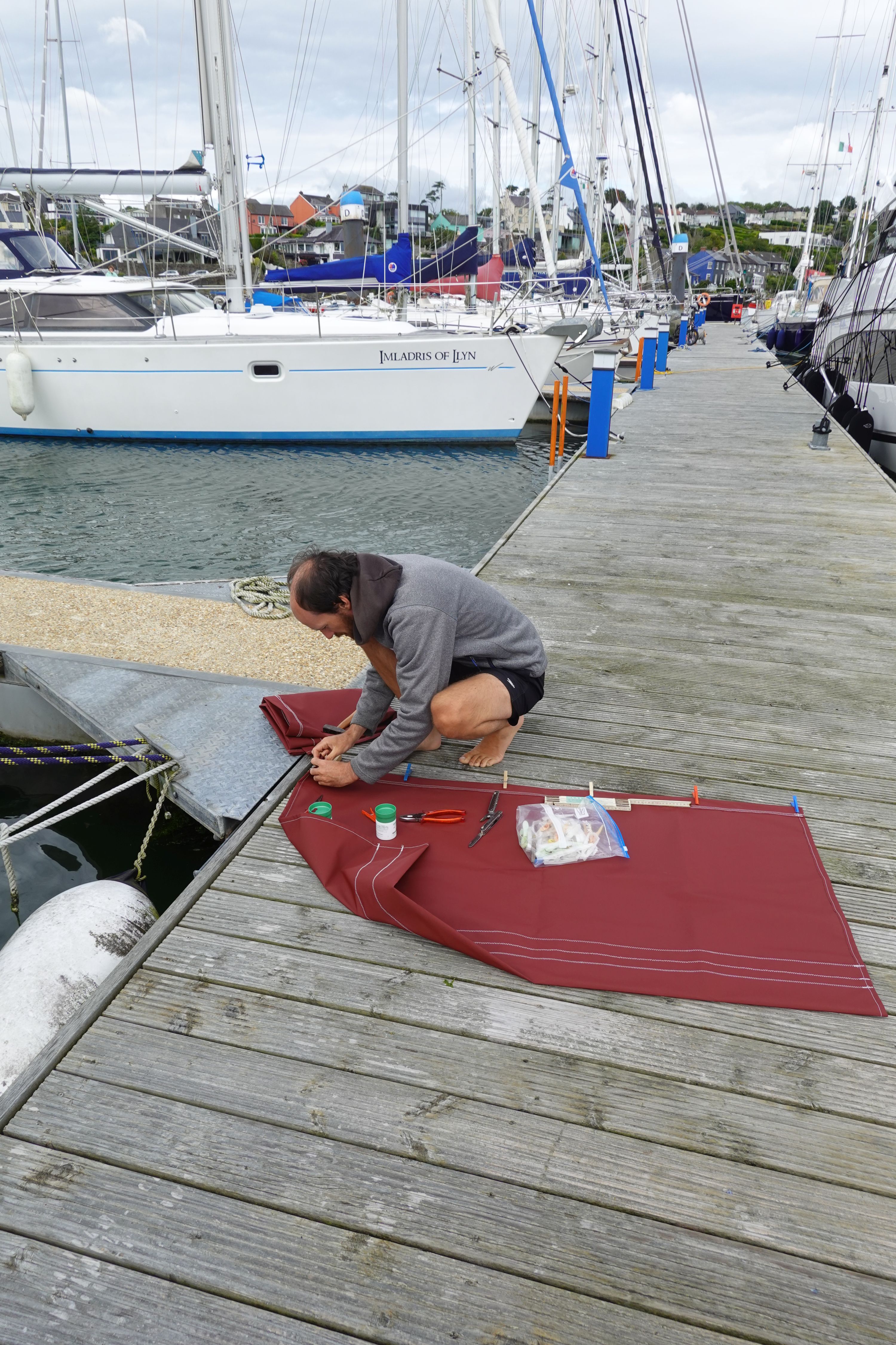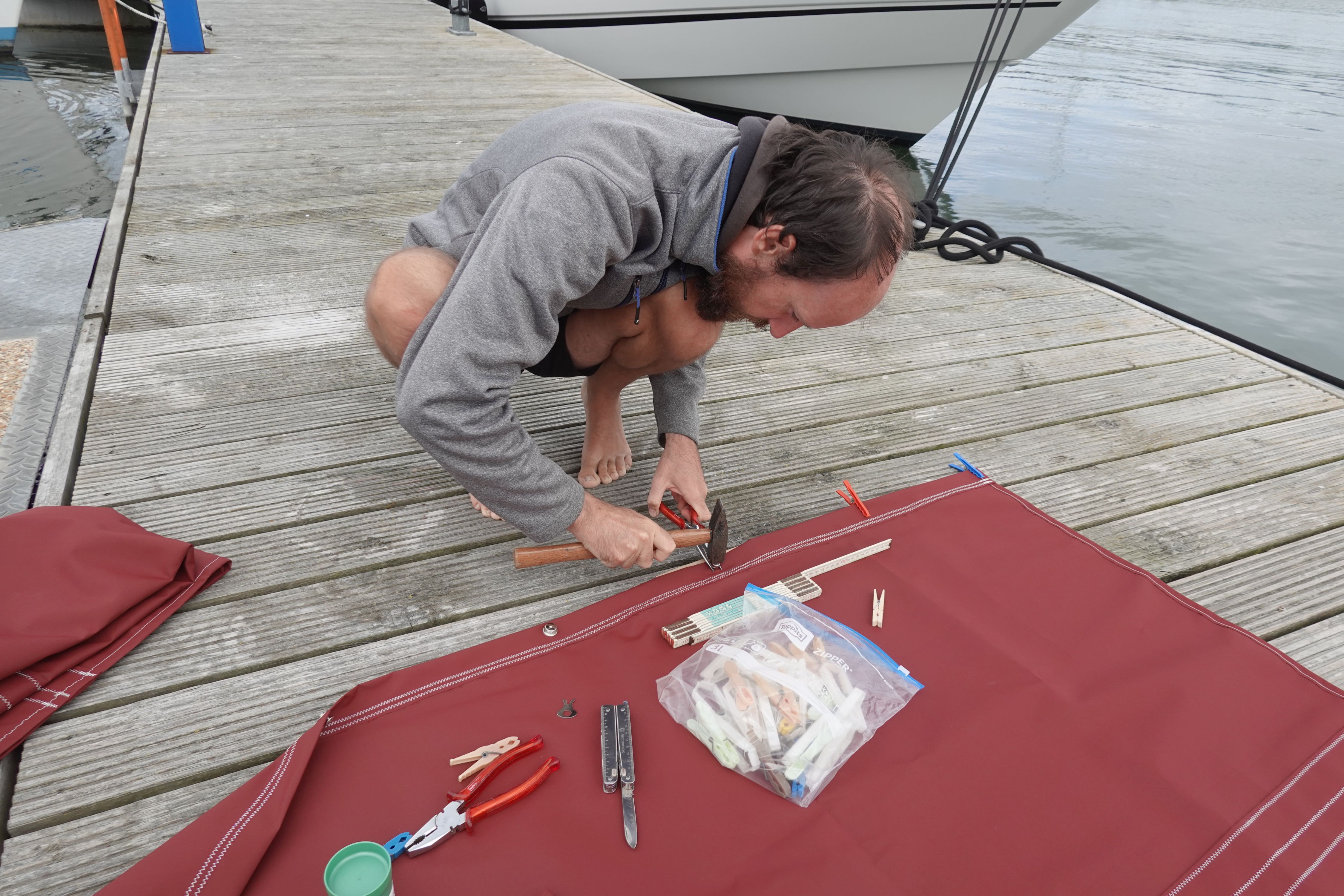 An Bord stelle ich die Leesegel fertig. Die Knöpfe mussten noch in die Tücher gestanzt werden und die Gegenstücke unter den Kojen verschraubt werden. Währenddessen füllt und leert Uwe den Bilgetank ein weiteres Mal. Der Chemiegeschmack lässt langsam nach, genießbar ist das Wasser aber noch nicht.