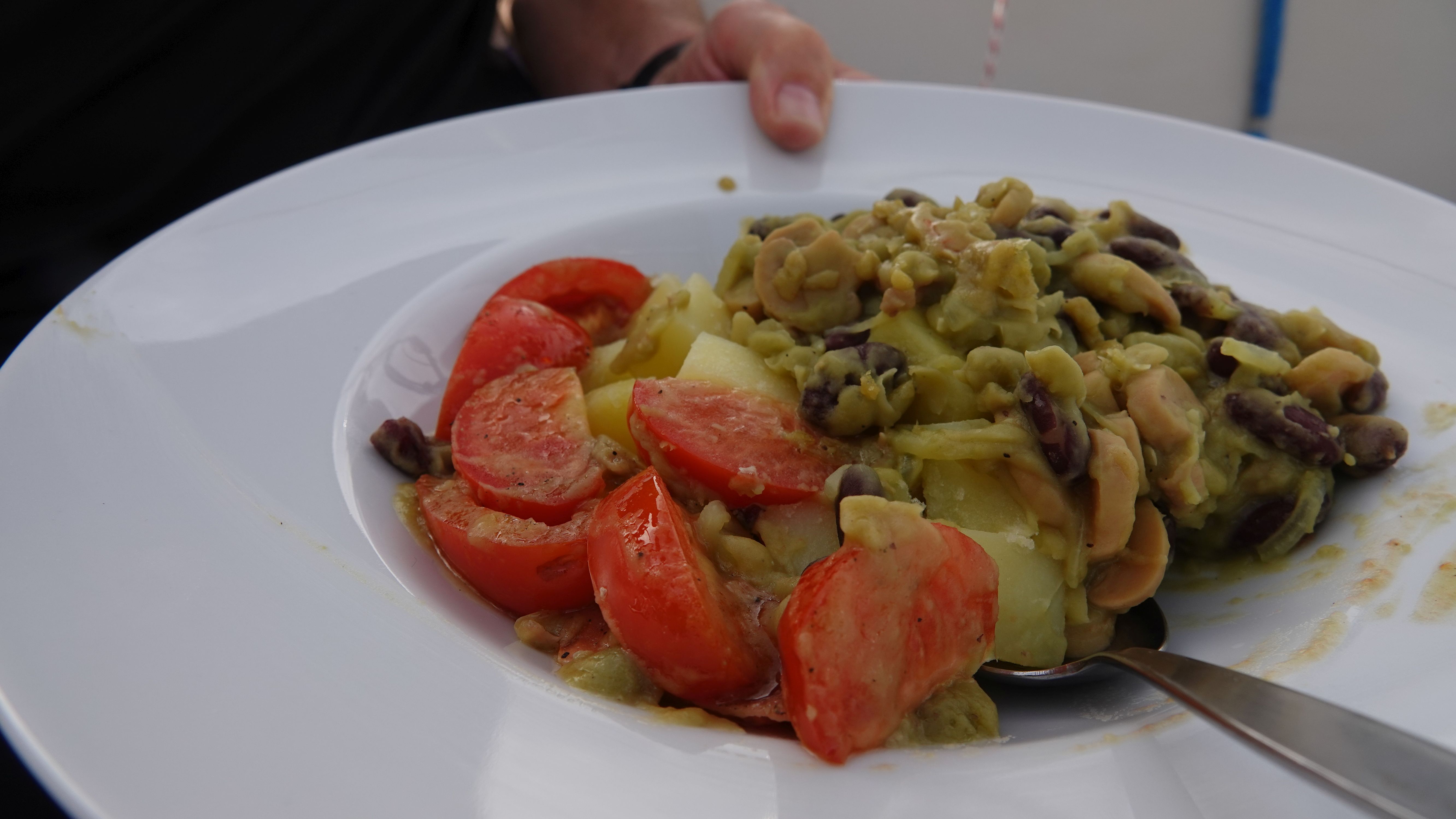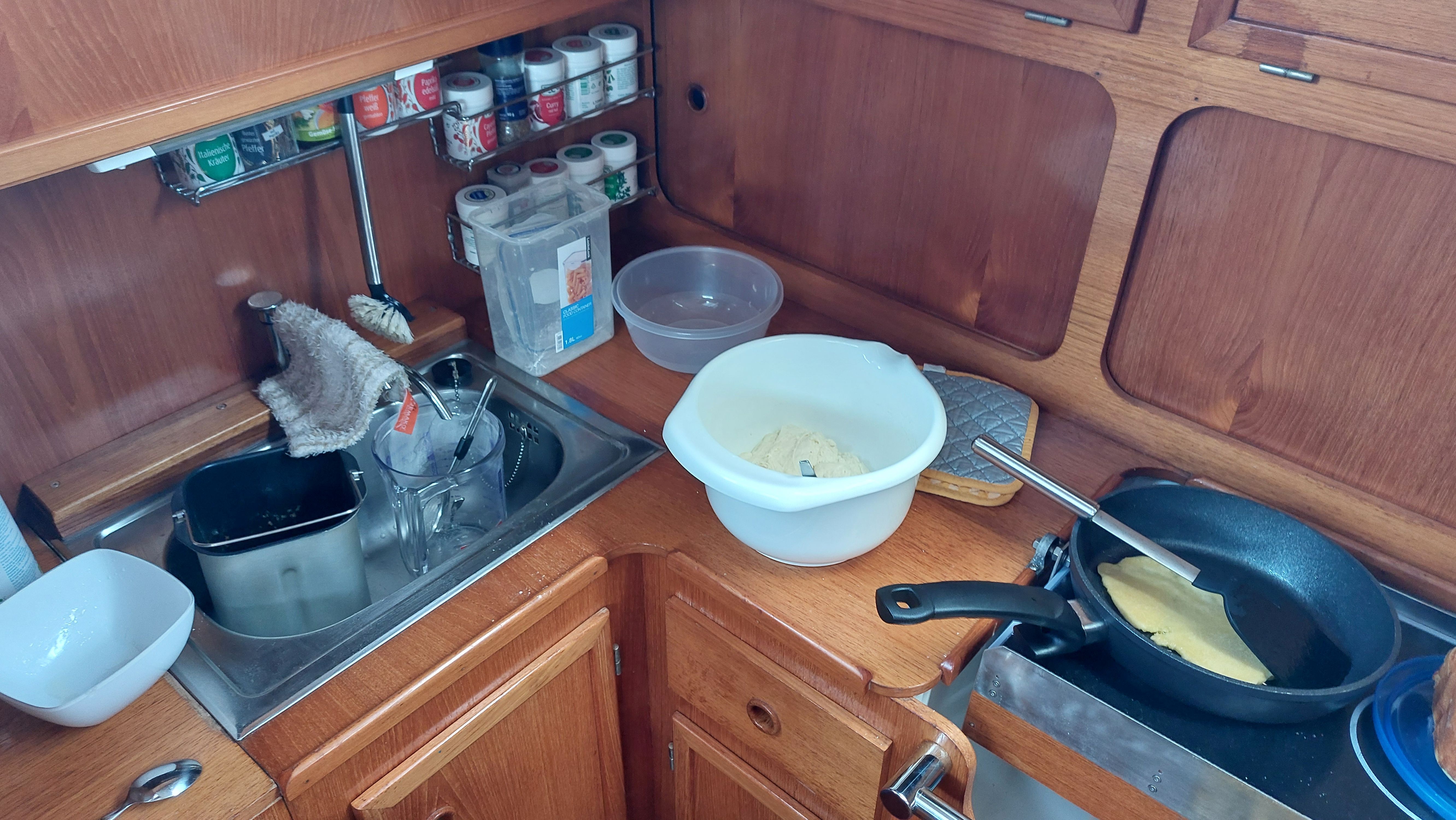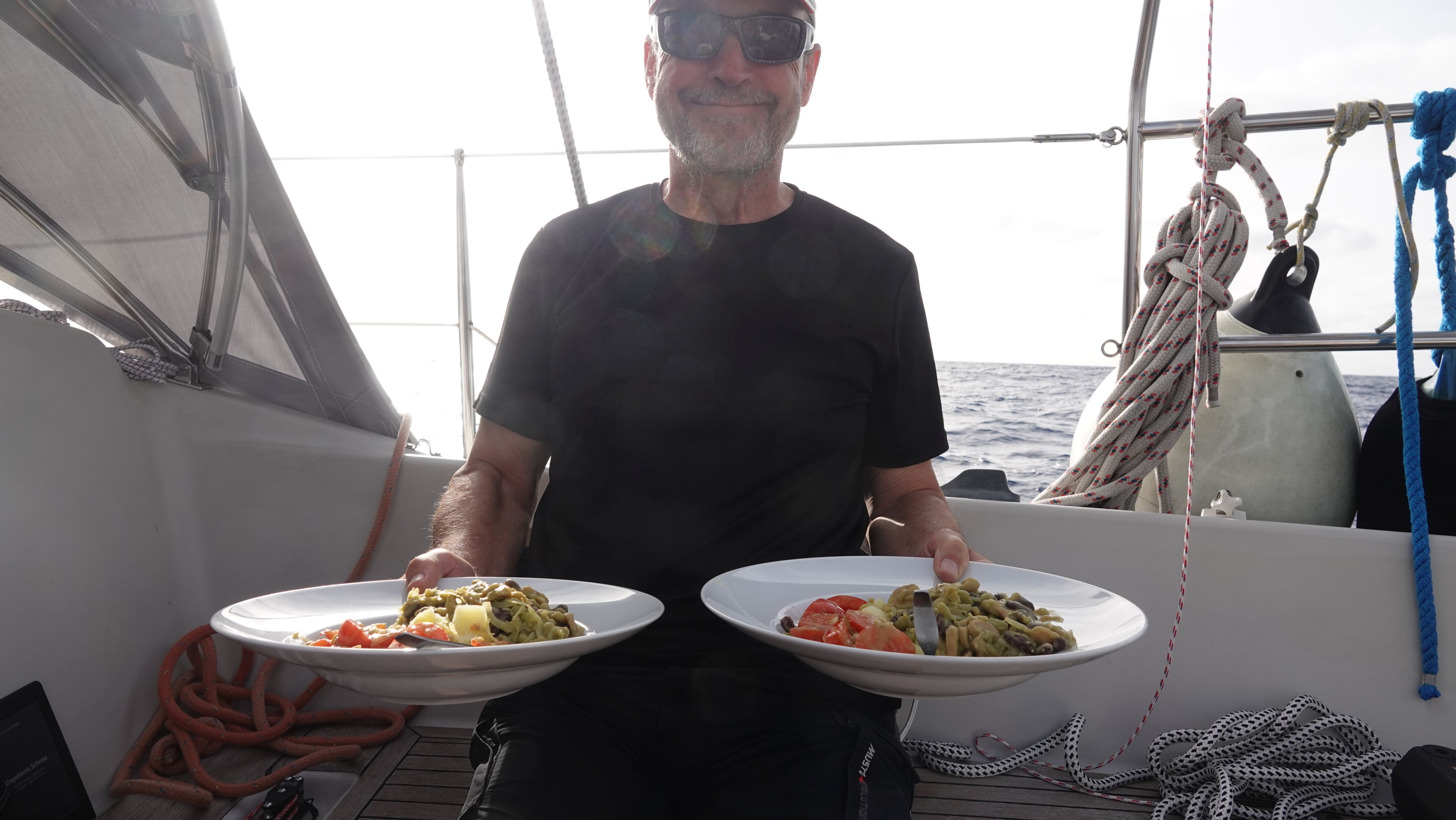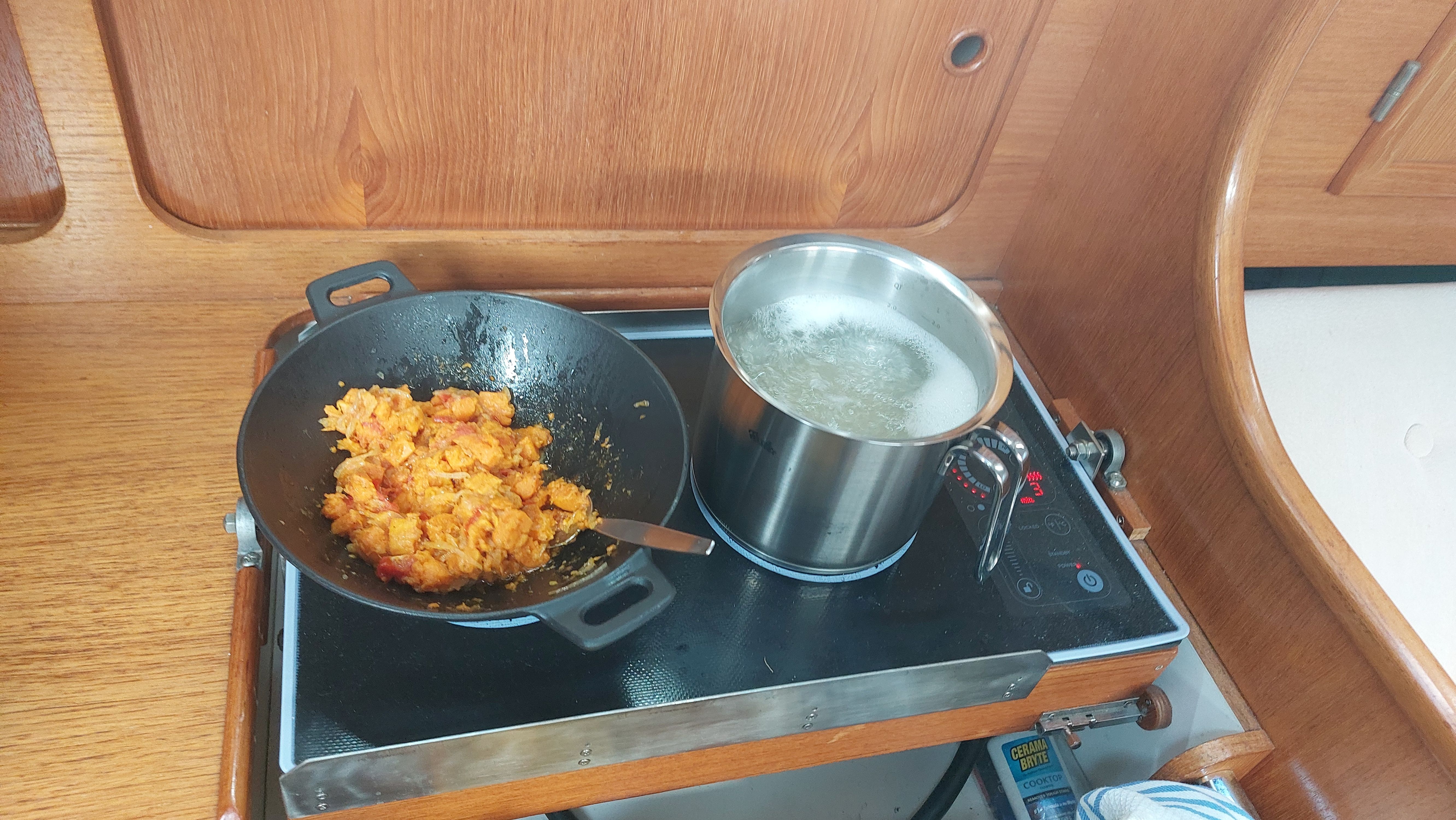 Die Flaute hat auch Vorteile: Es ist zumindest tagsüber in der Sonne relativ warm an Bord und ich kann uns ein richtiges Abendessen kochen.