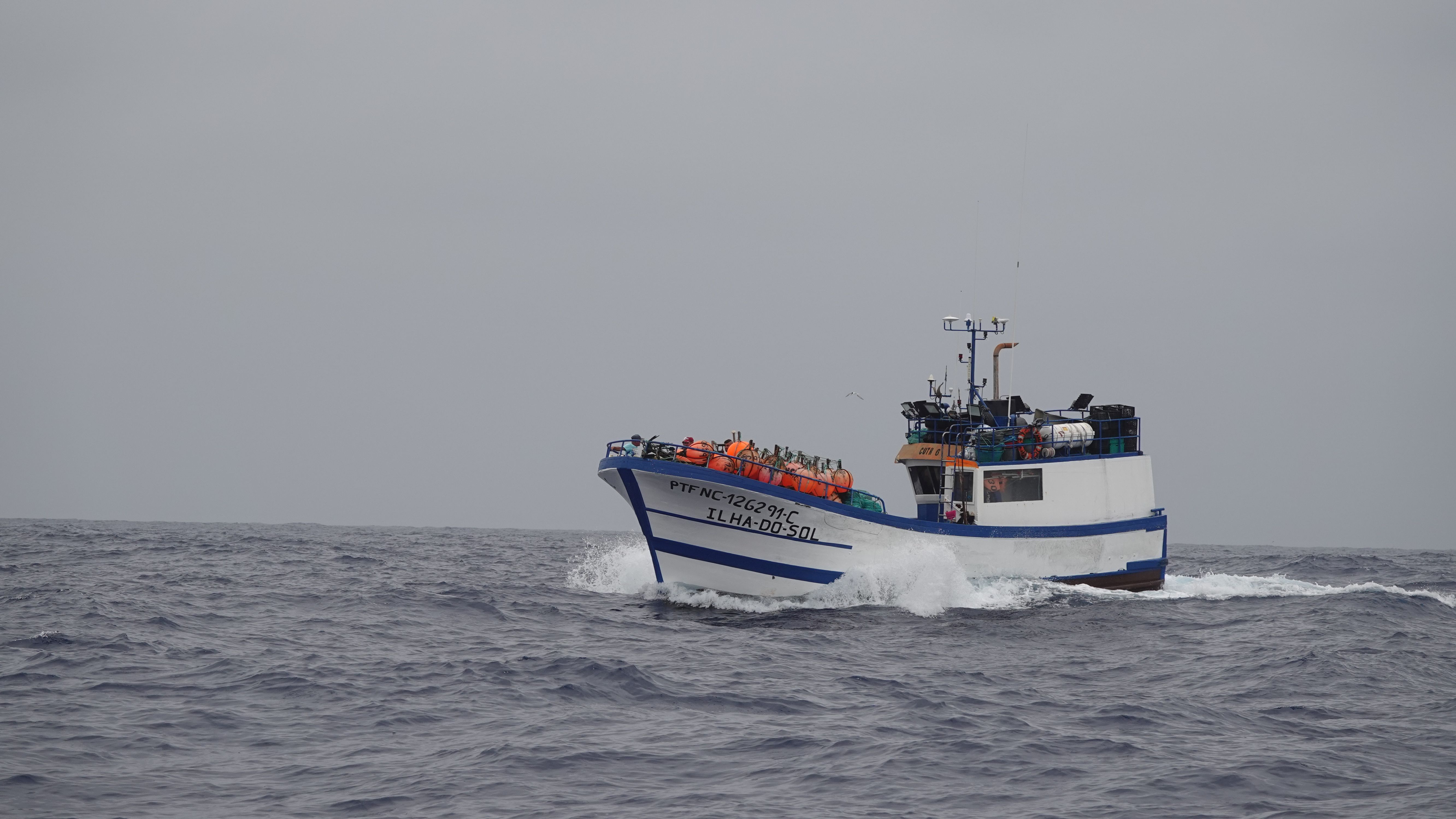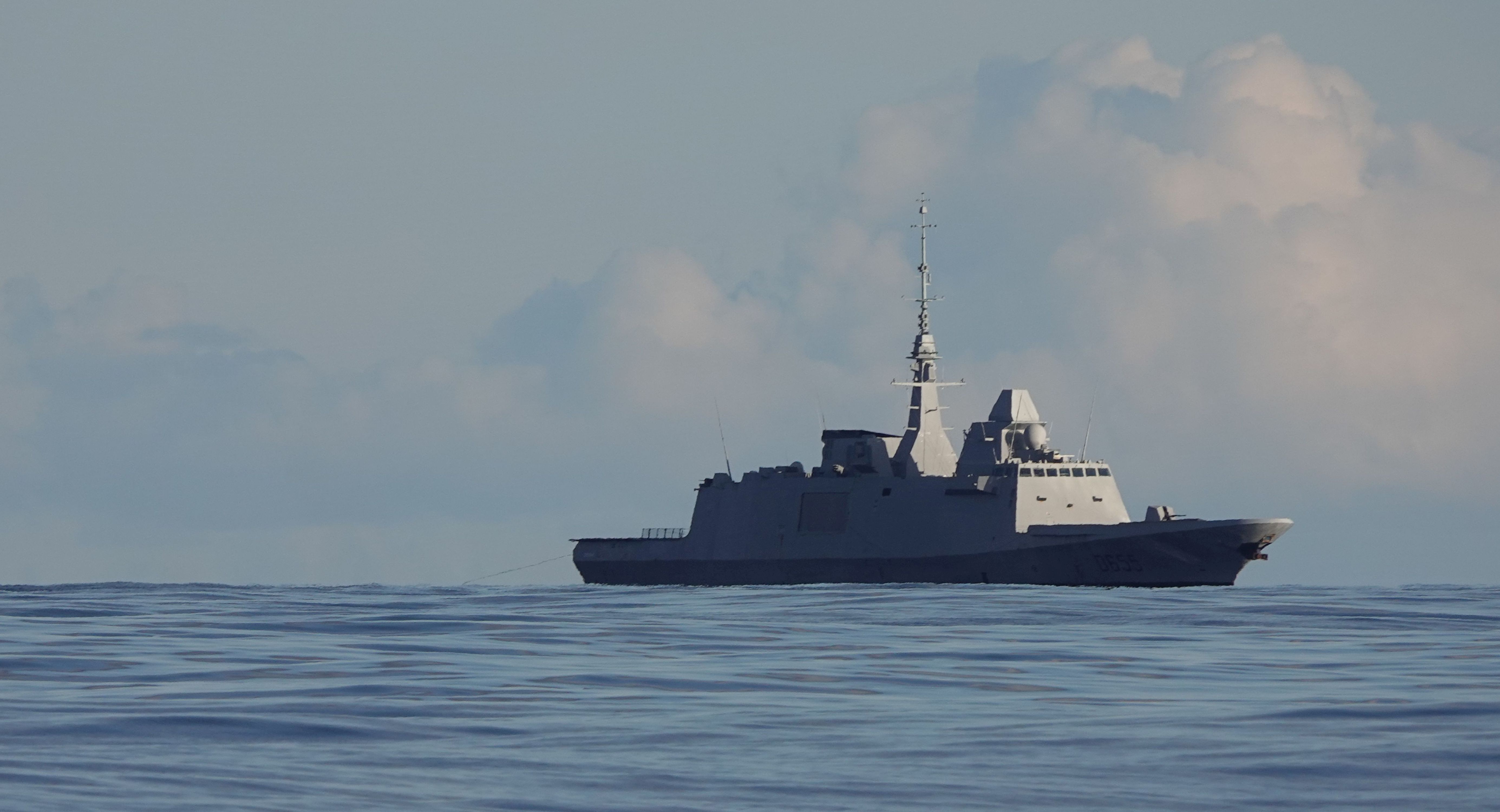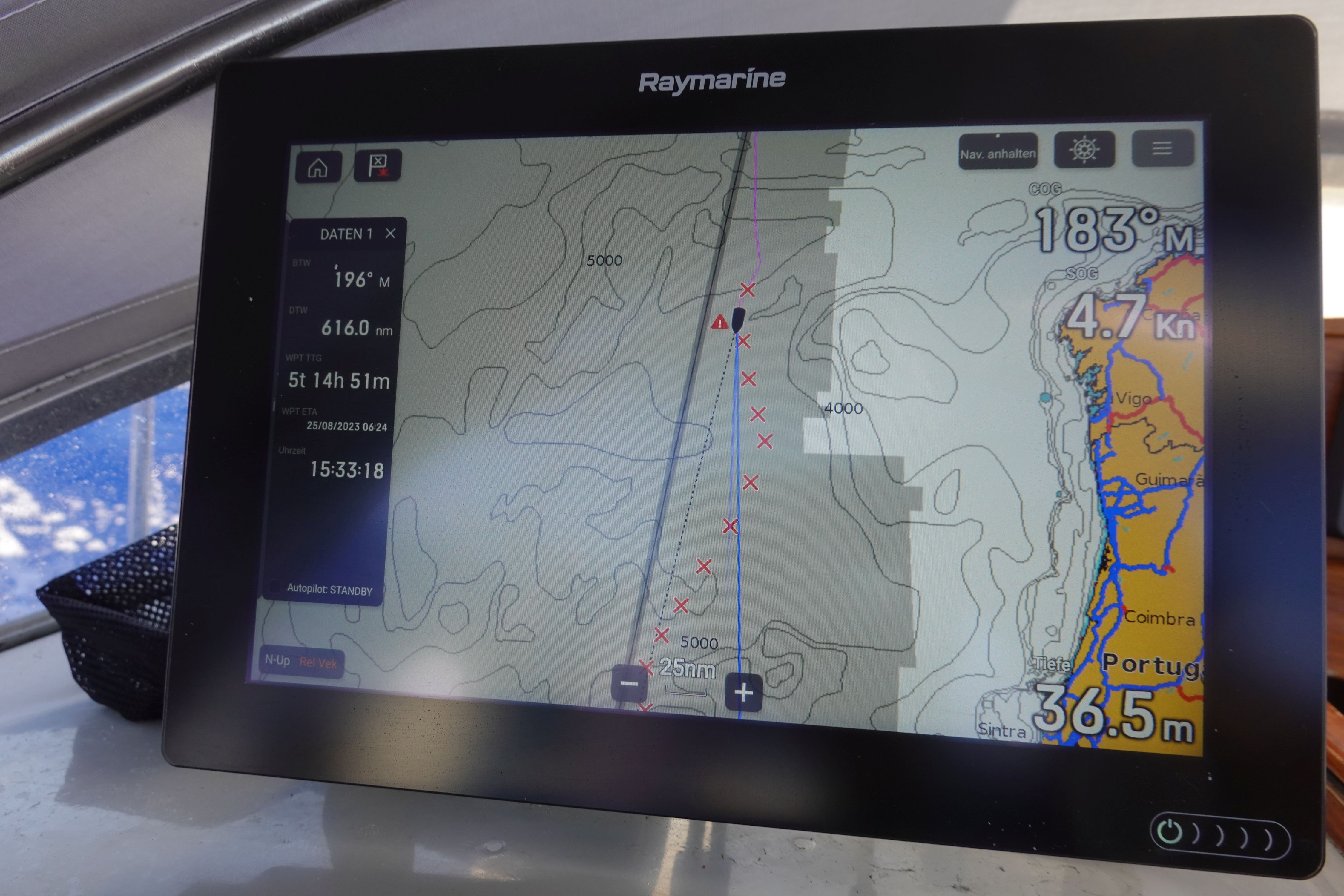 Spät am Dienstagabend kreuzt ein vermutlich französisches Marineschiff im Schneckentempo unseren Kurs. Eine lange Trosse verschwindet weit hinterm Heck im Atlantik, wir verlangsamen etwas und schlagen einen Haken.