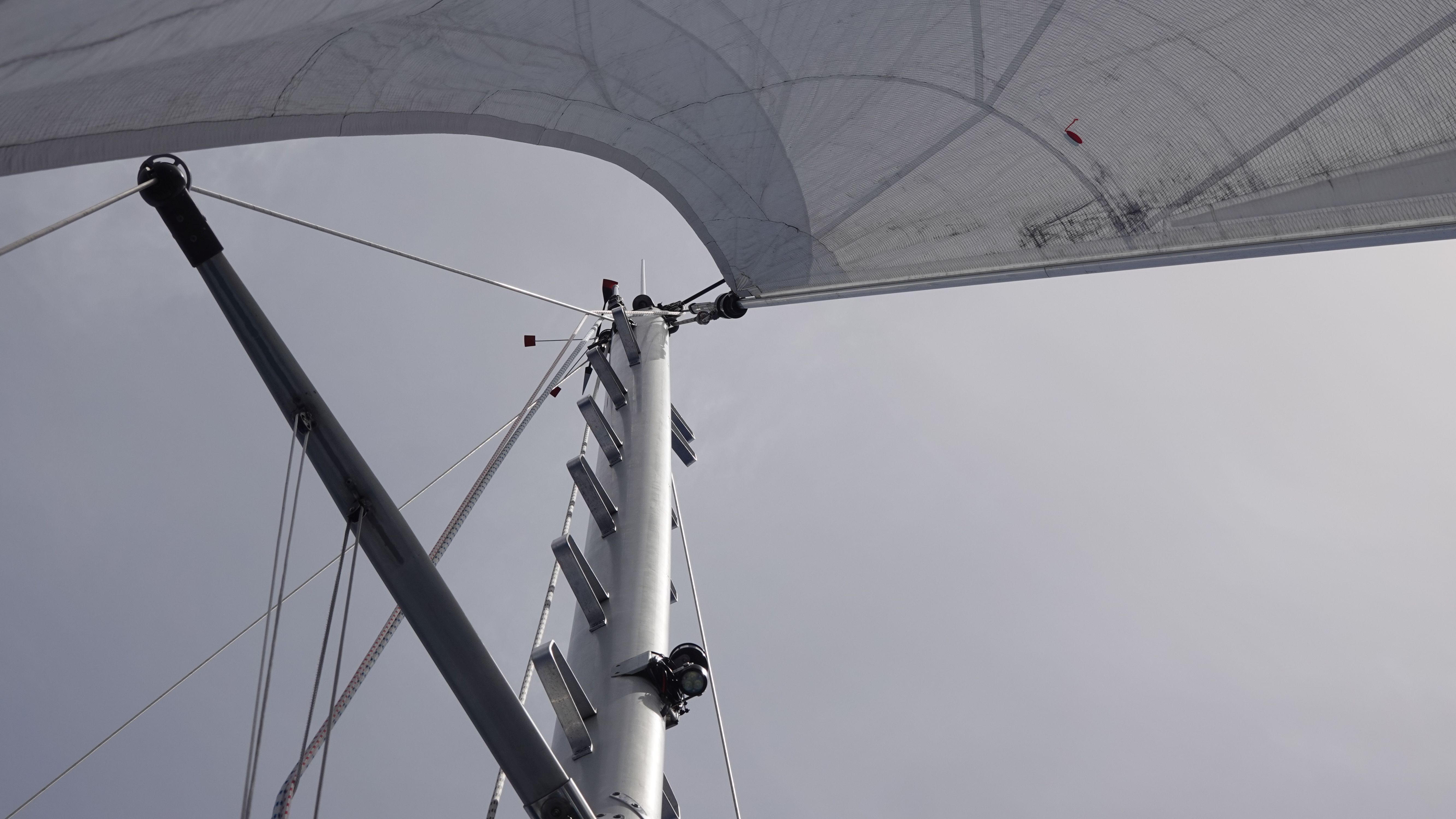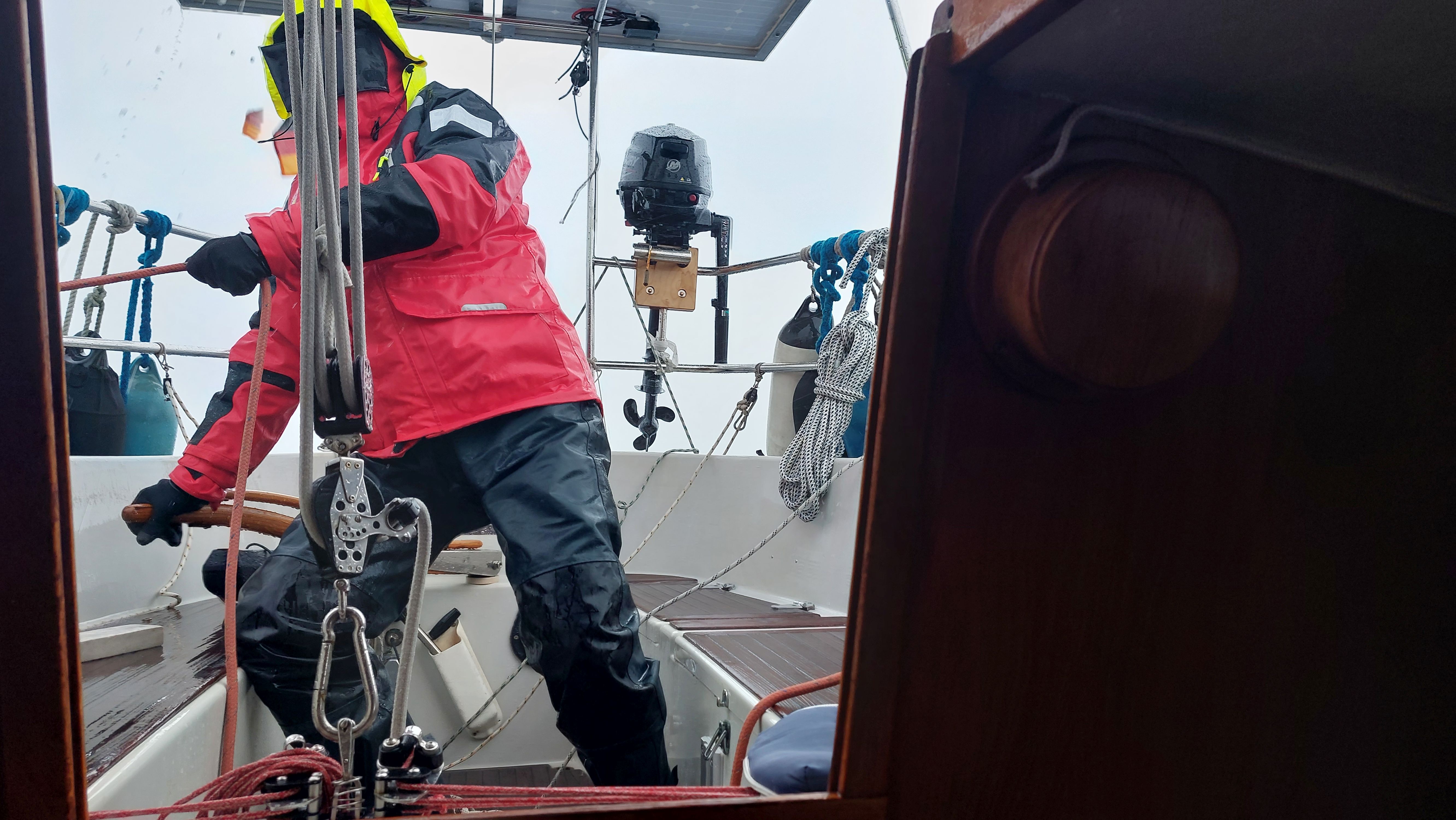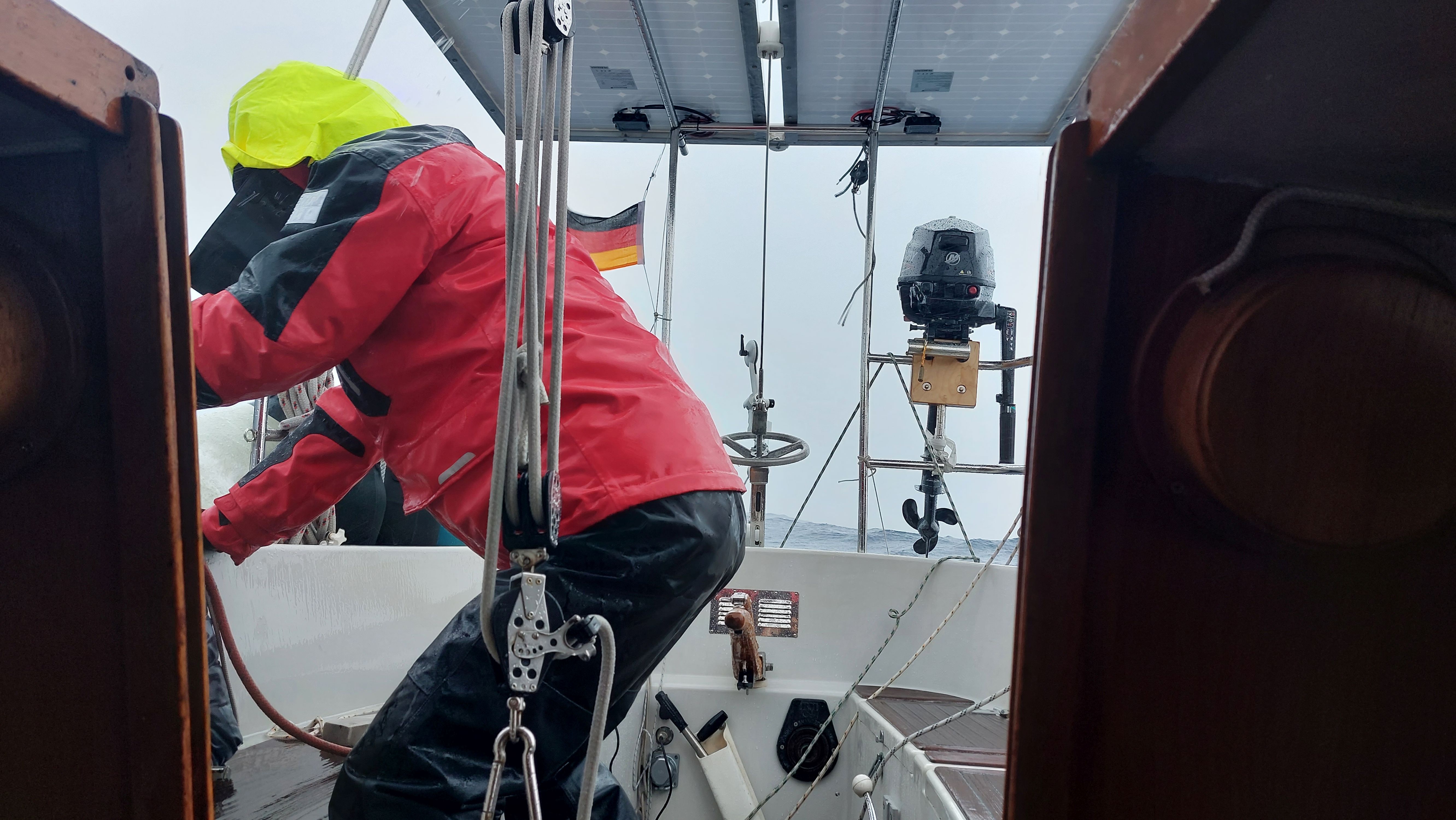 die Segel schlagen. Die Windpilot steuert nicht mehr. Es ist wieder die Schubstange.
