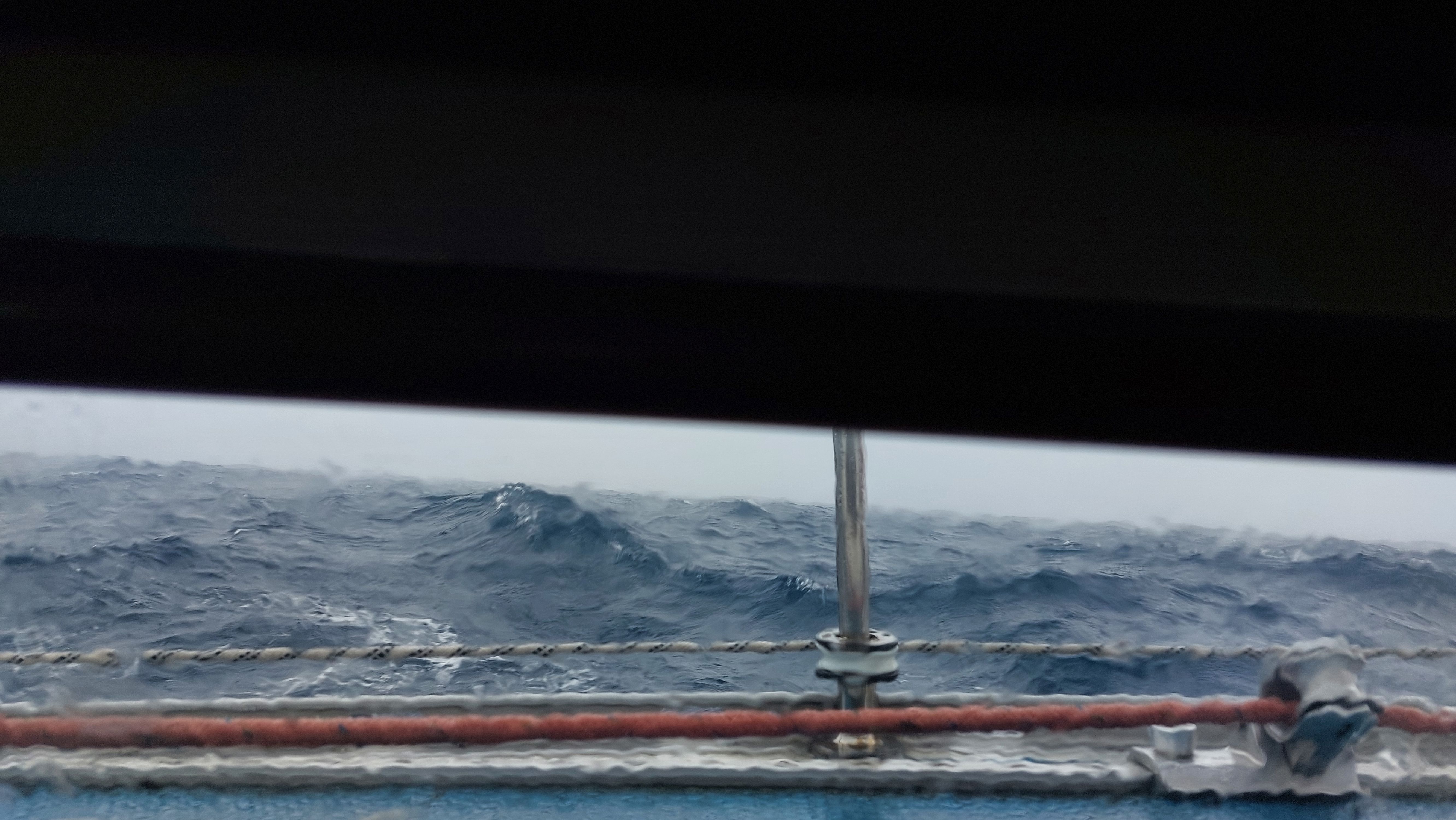 Der Sturm hält gut fünf Stunden lang an. Während die Böen erst noch an der vierzig kratzen gehen sie in der zweiten Hälfte regelmäßig auch darüber hinaus. Ab vierzehn Uhr lässt es endlich merklich nach. Die Sonne scheint weiterhin, es wird trockener im Cockpit, nur ab und an steigt nochmal eine unpassende Welle ein. Auch das Baro steigt nicht mehr ganz so schnell. Dankbar lege ich mich für ein paar Stunden schlafen, während Uwe wieder an Deck an die frische Luft geht.
