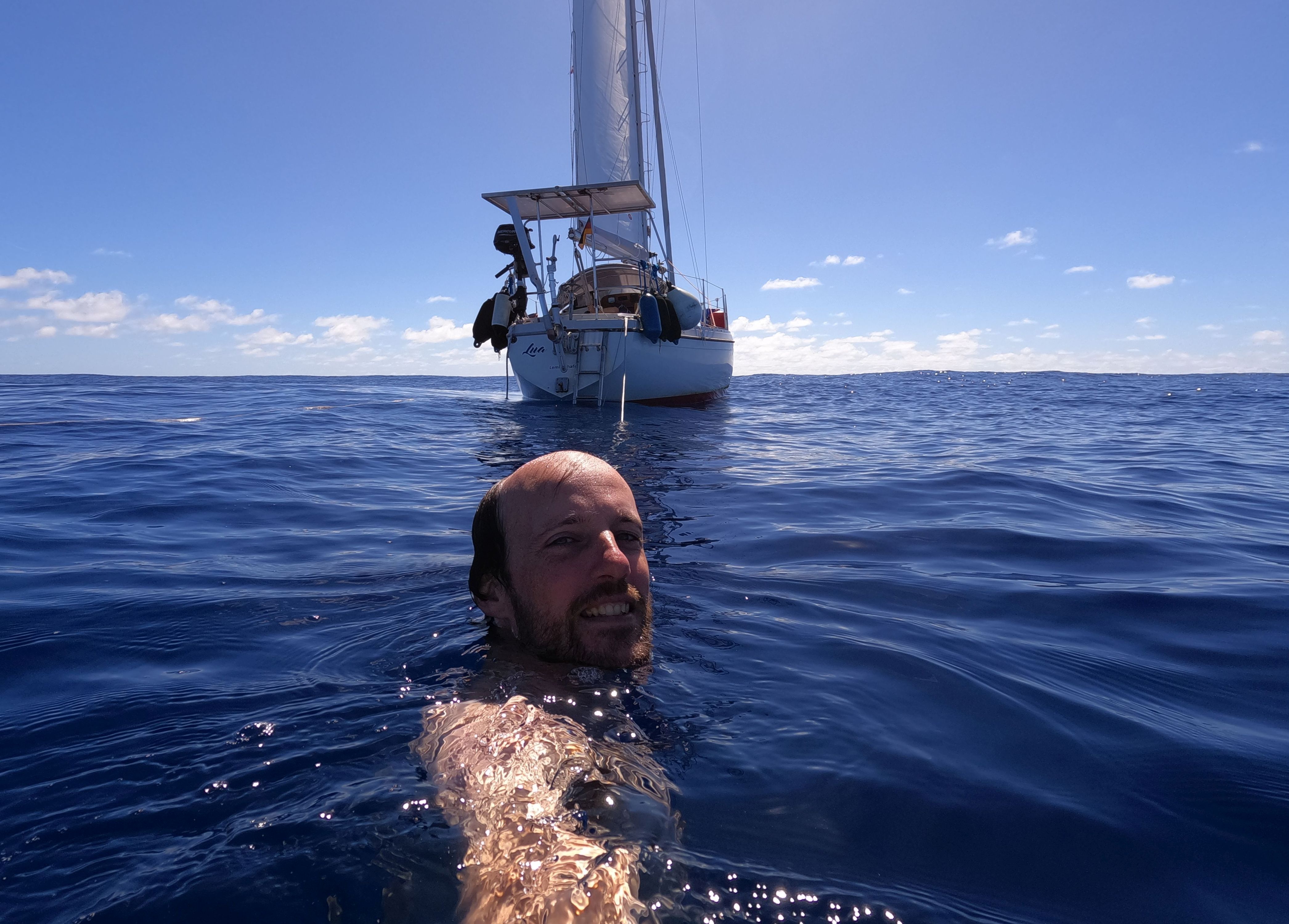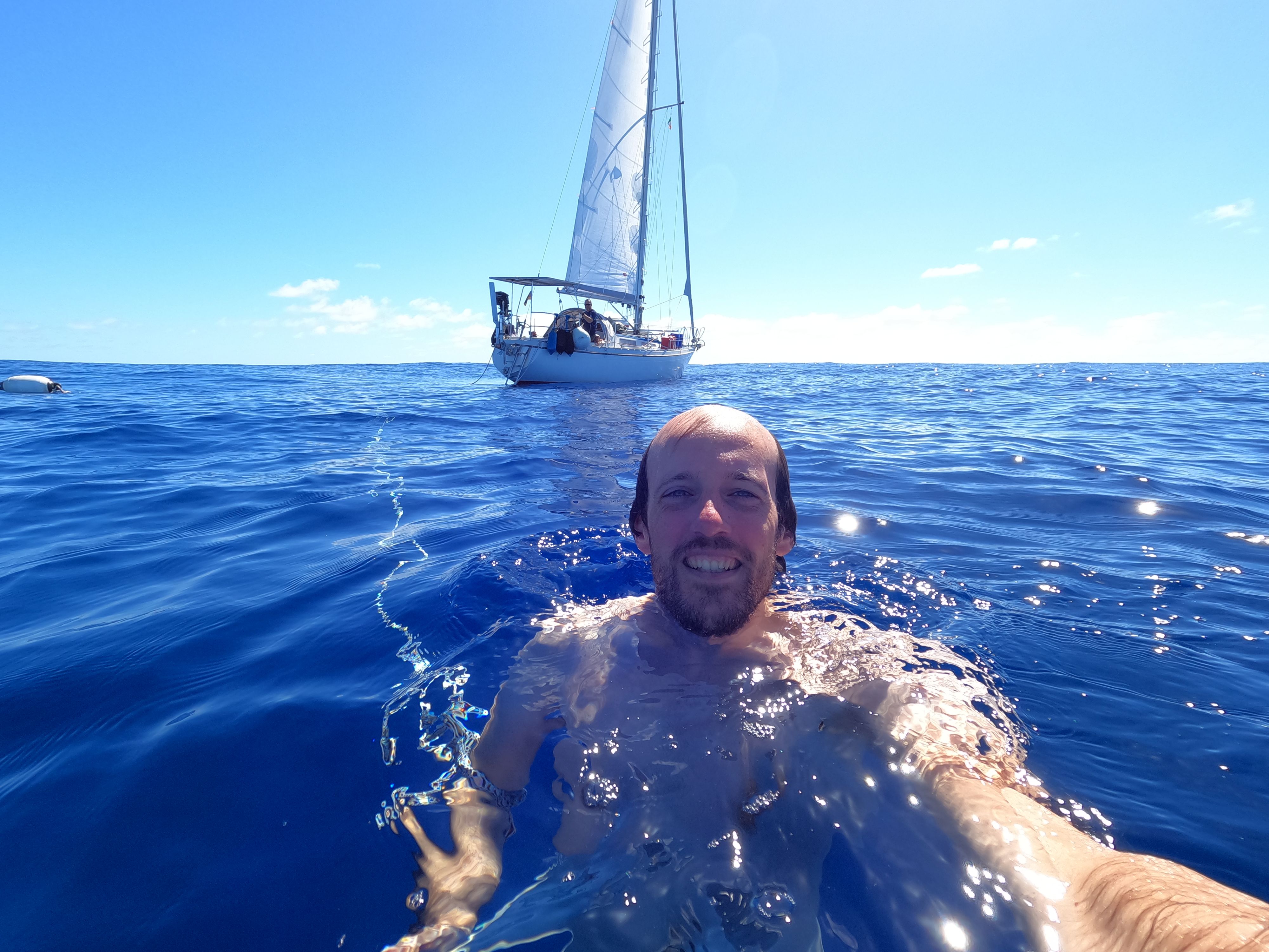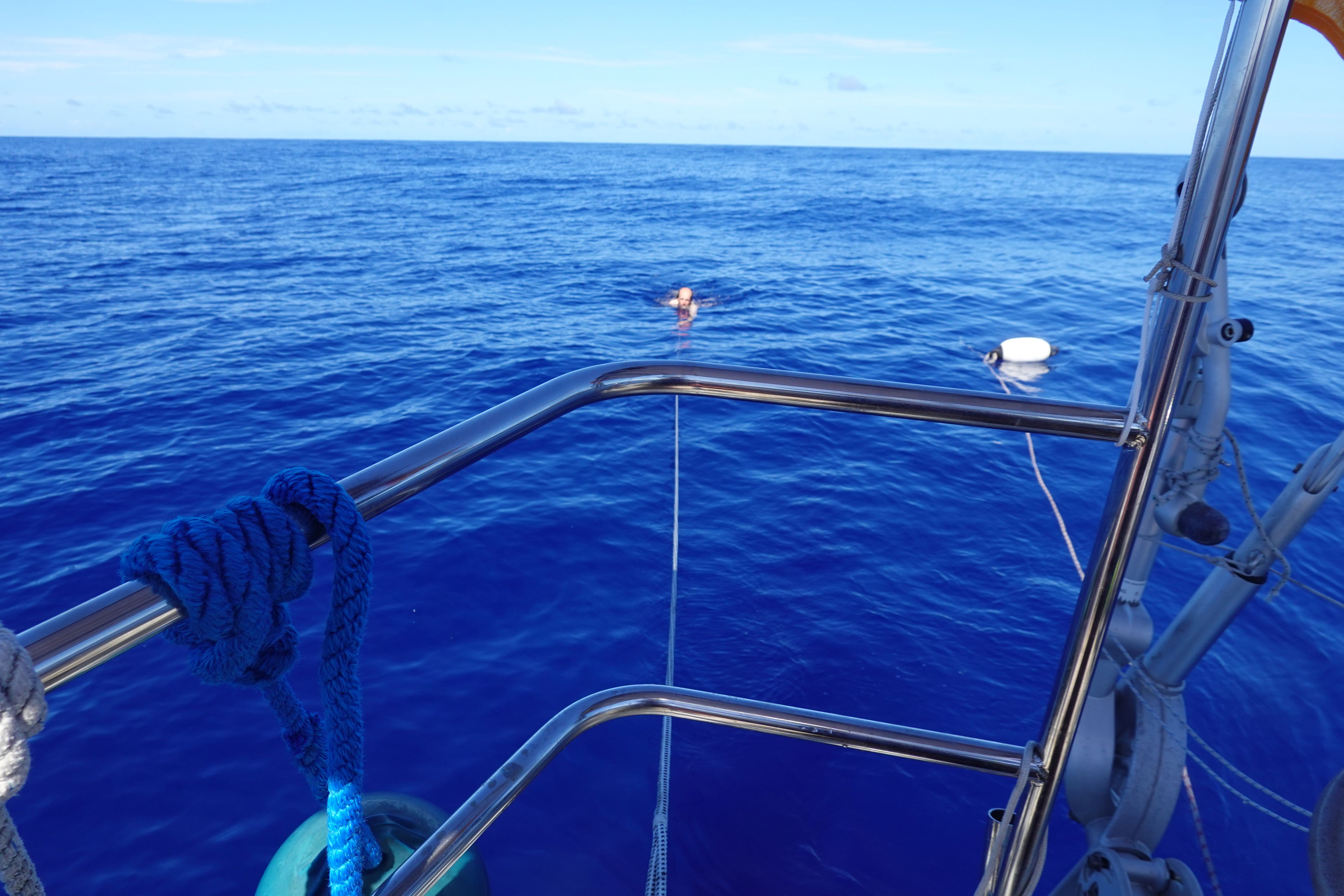 Bevor wie die Maschine starten und durch die Flaute motoren "dusche" ich am Heck und gehe eine Runde schwimmen. Ein unbeschreibliches Gefühl, mit viertausend Metern Wasser unter mir und weit und breit nur Wasser, Horizont und Lua.