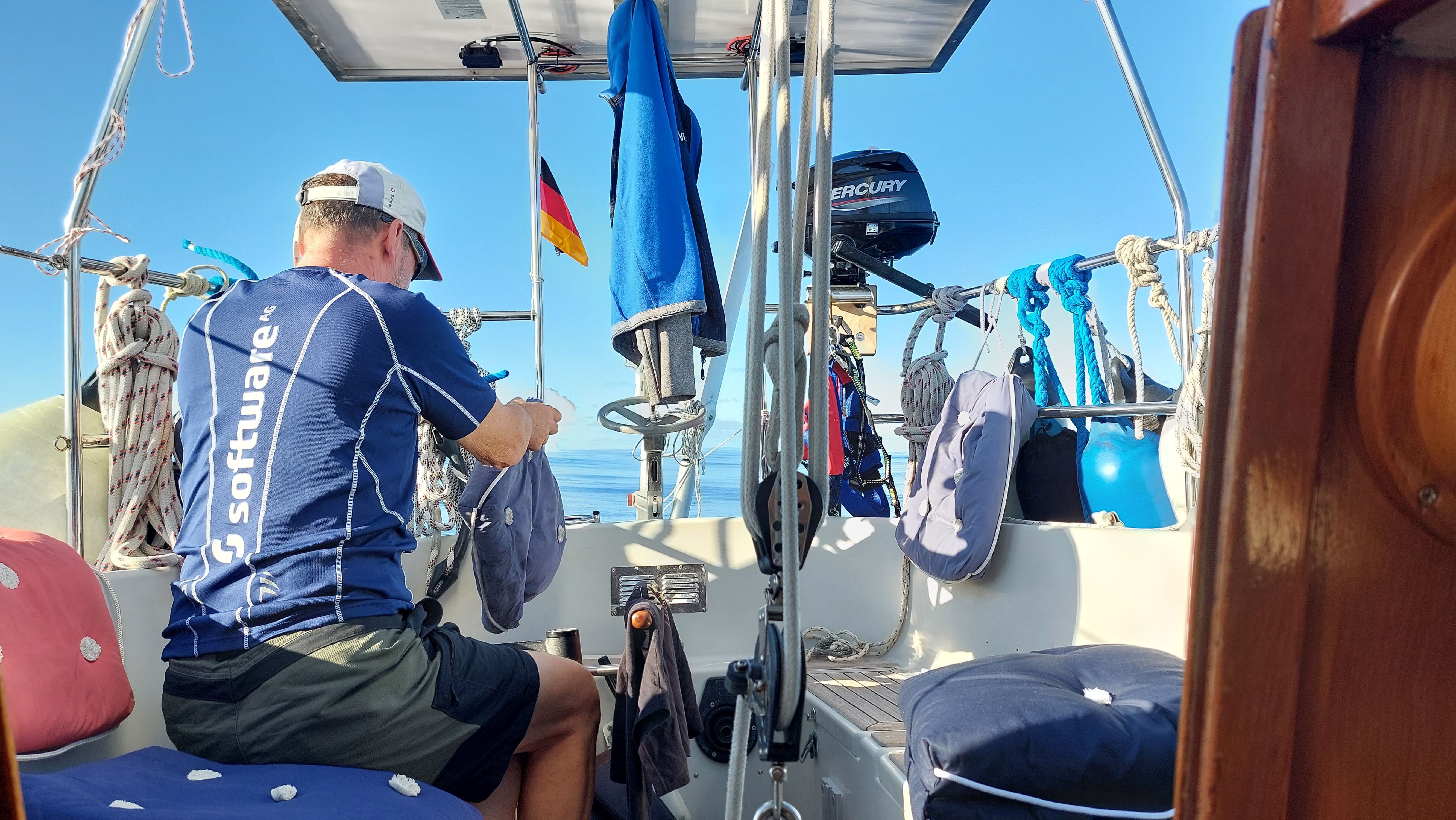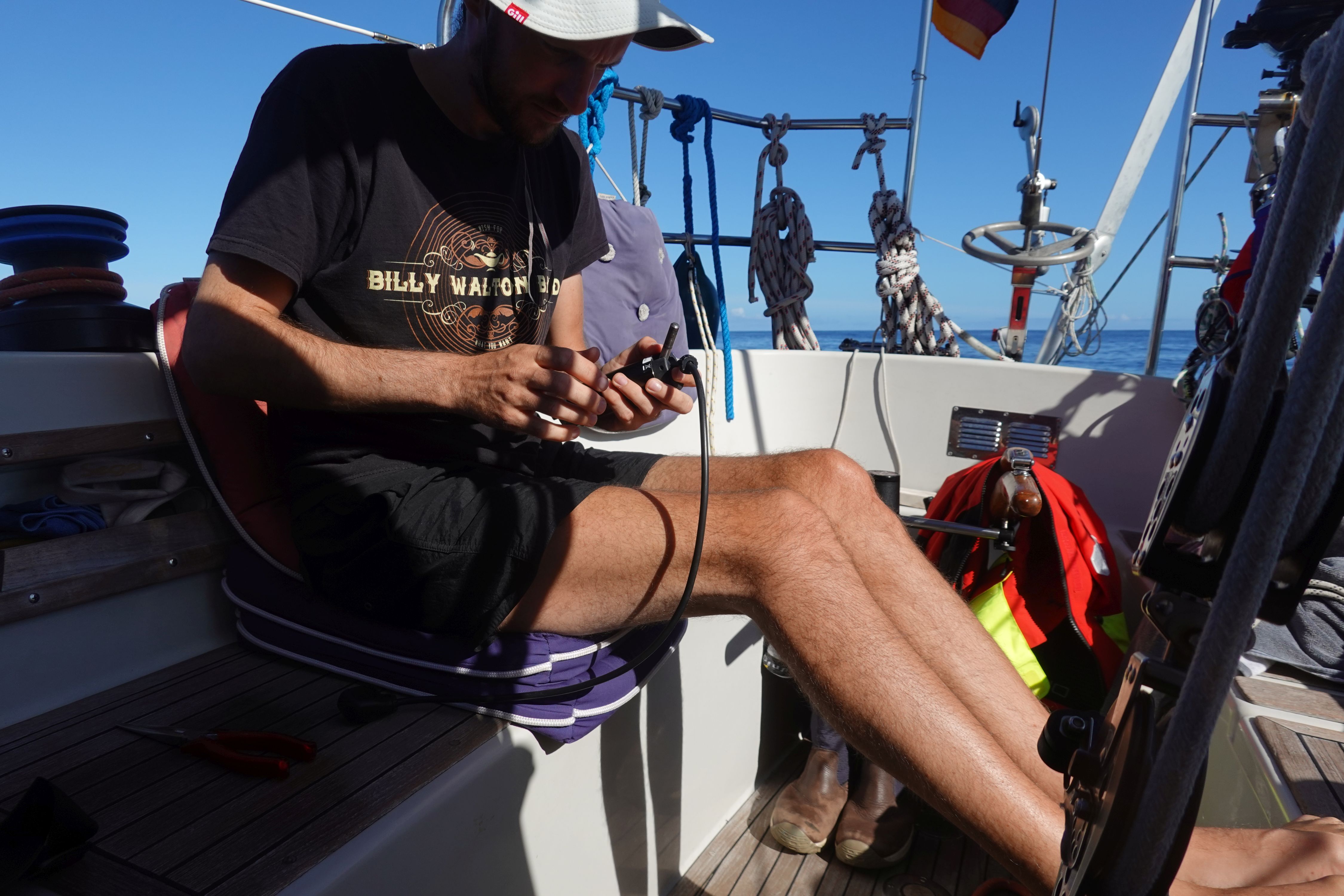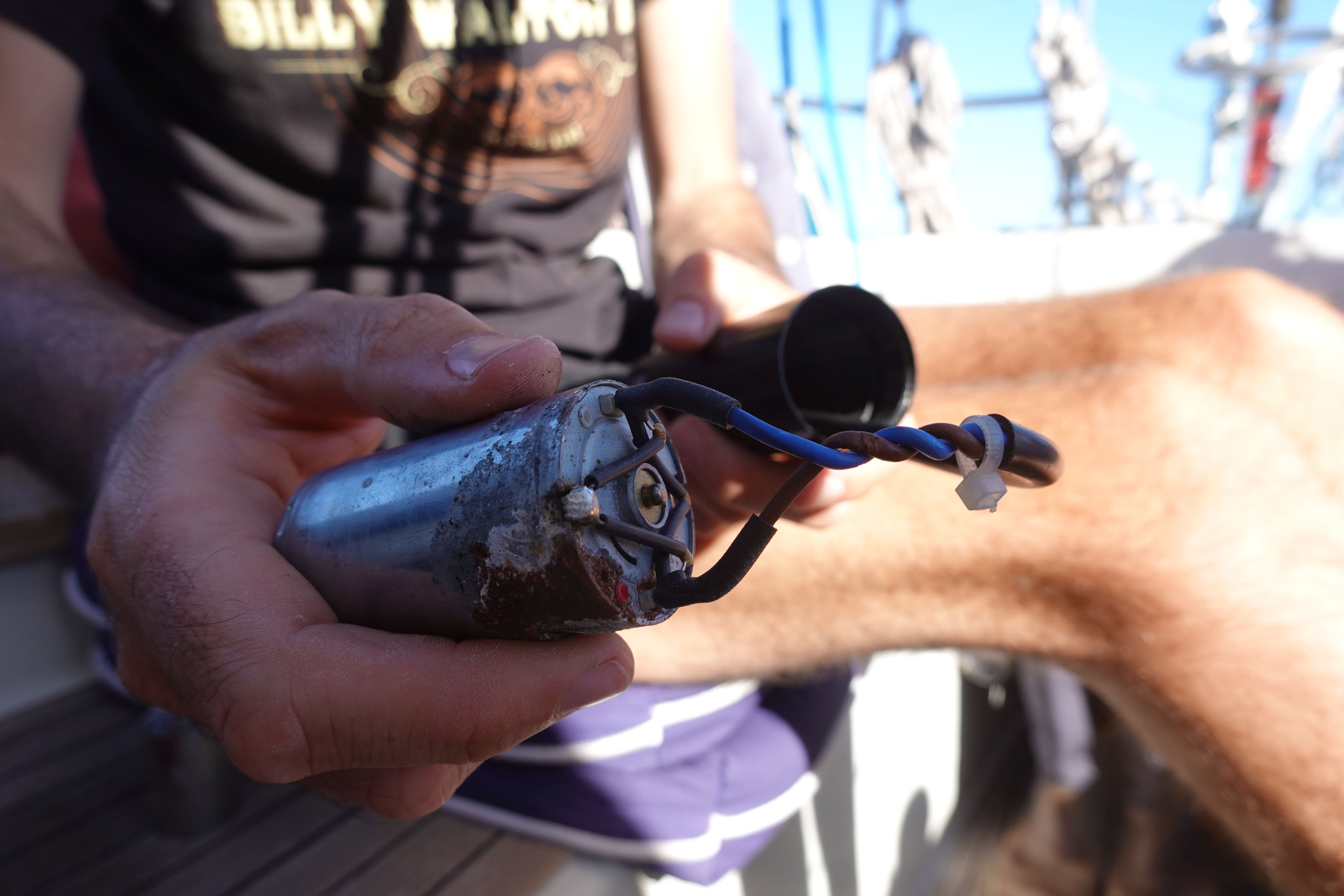 Ich baue den kaputten Pinnenpiloten auseinander und finde den Motor stark korrodiert vor. Rostlöser und Reinigung erwecken den nicht wieder zum Leben. Wir verlassen uns weiter auf den alten Autohelm, der uns bereits so ausdauernd durch die beiden Stürme gebracht hat.