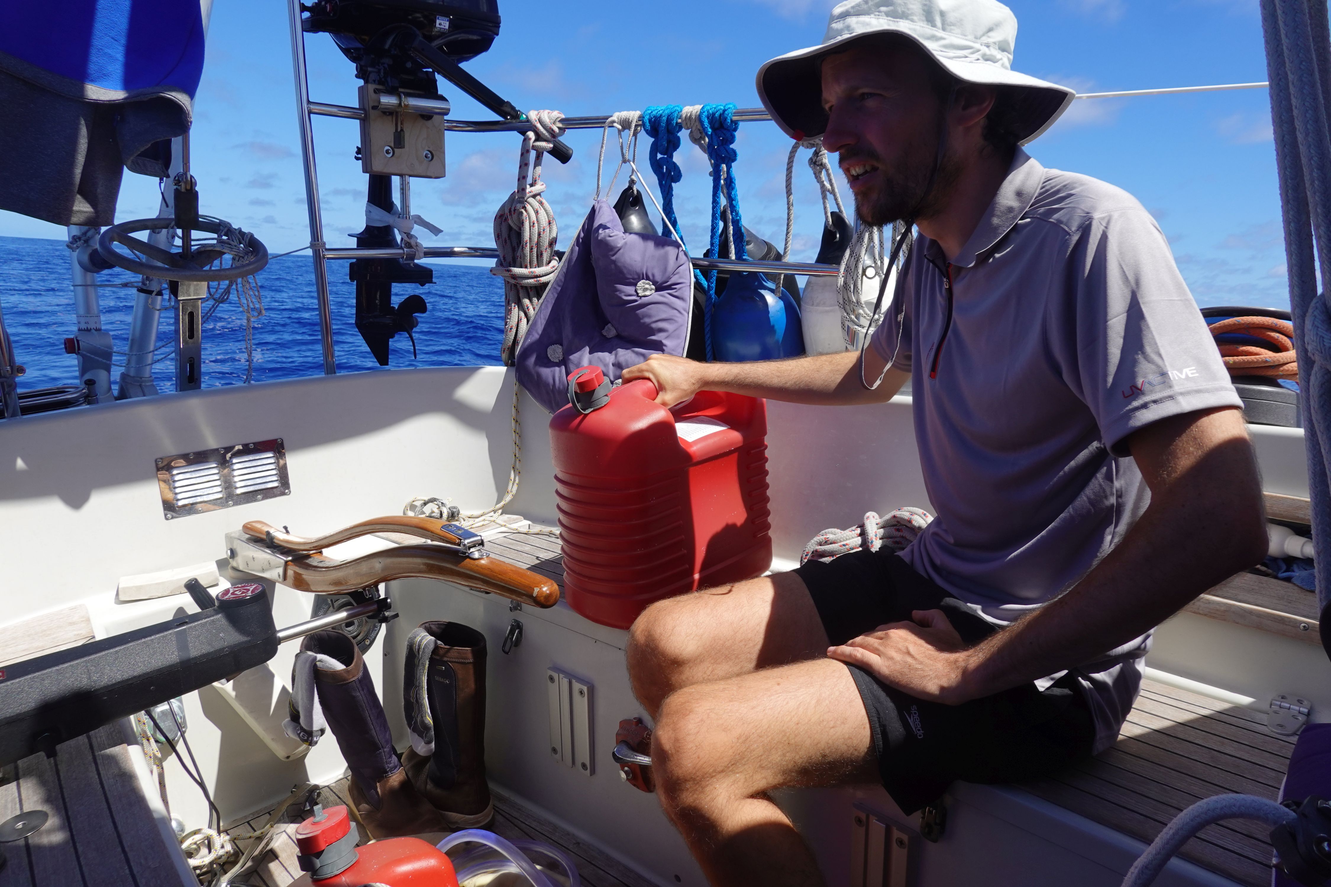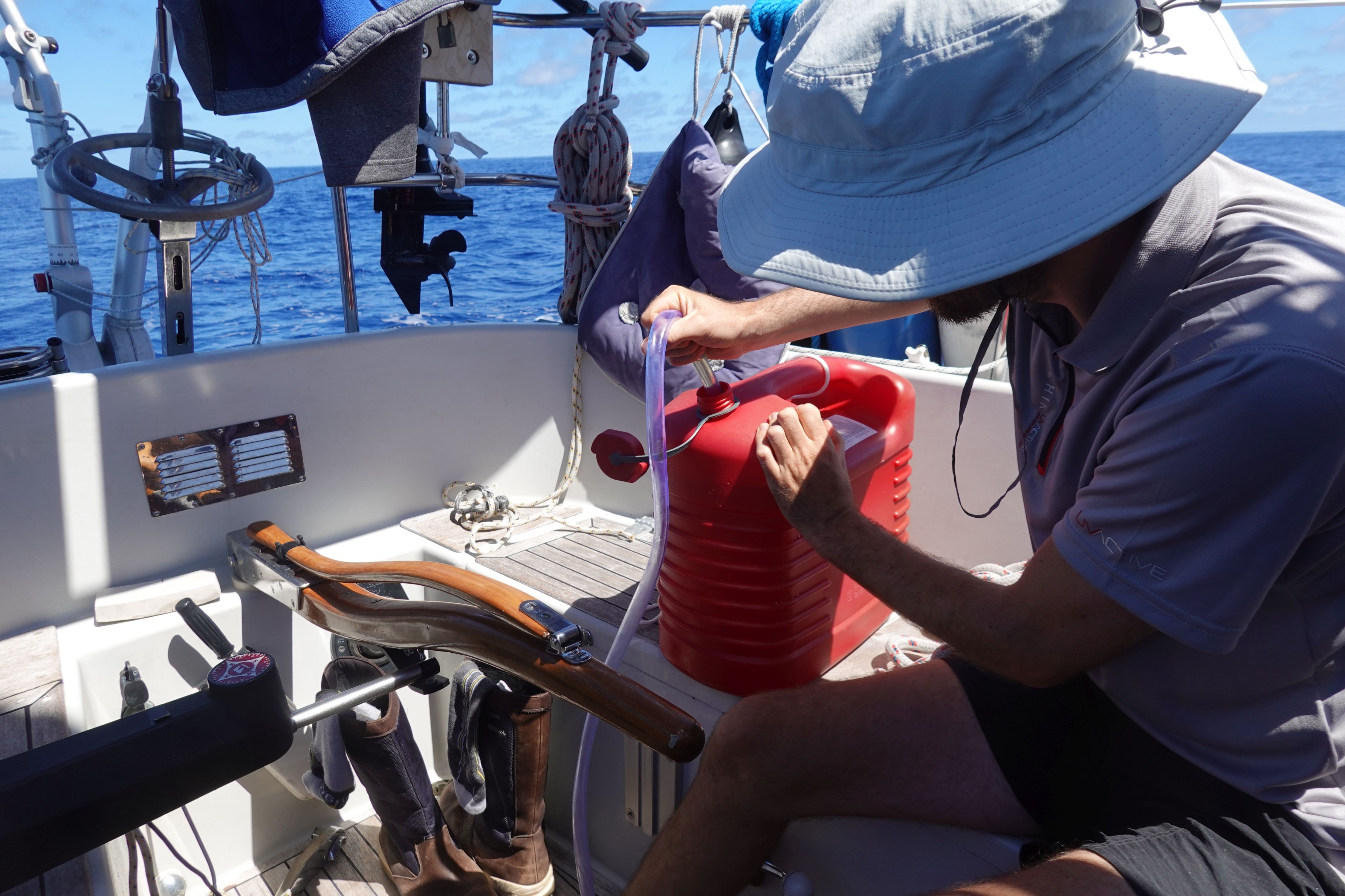 Am Nachmittag füllen wir noch zwei Kanister Diesel in den Tank um. Bei der Schaukelei ist es etwas schwierig mit dem Zollstock den Füllstand zu messen, aber wir dürften noch etwa achtunddreißig Liter im Tank haben. Mit vierzig Litern obendrauf ist der Tank jetzt erstmal wieder fast voll.