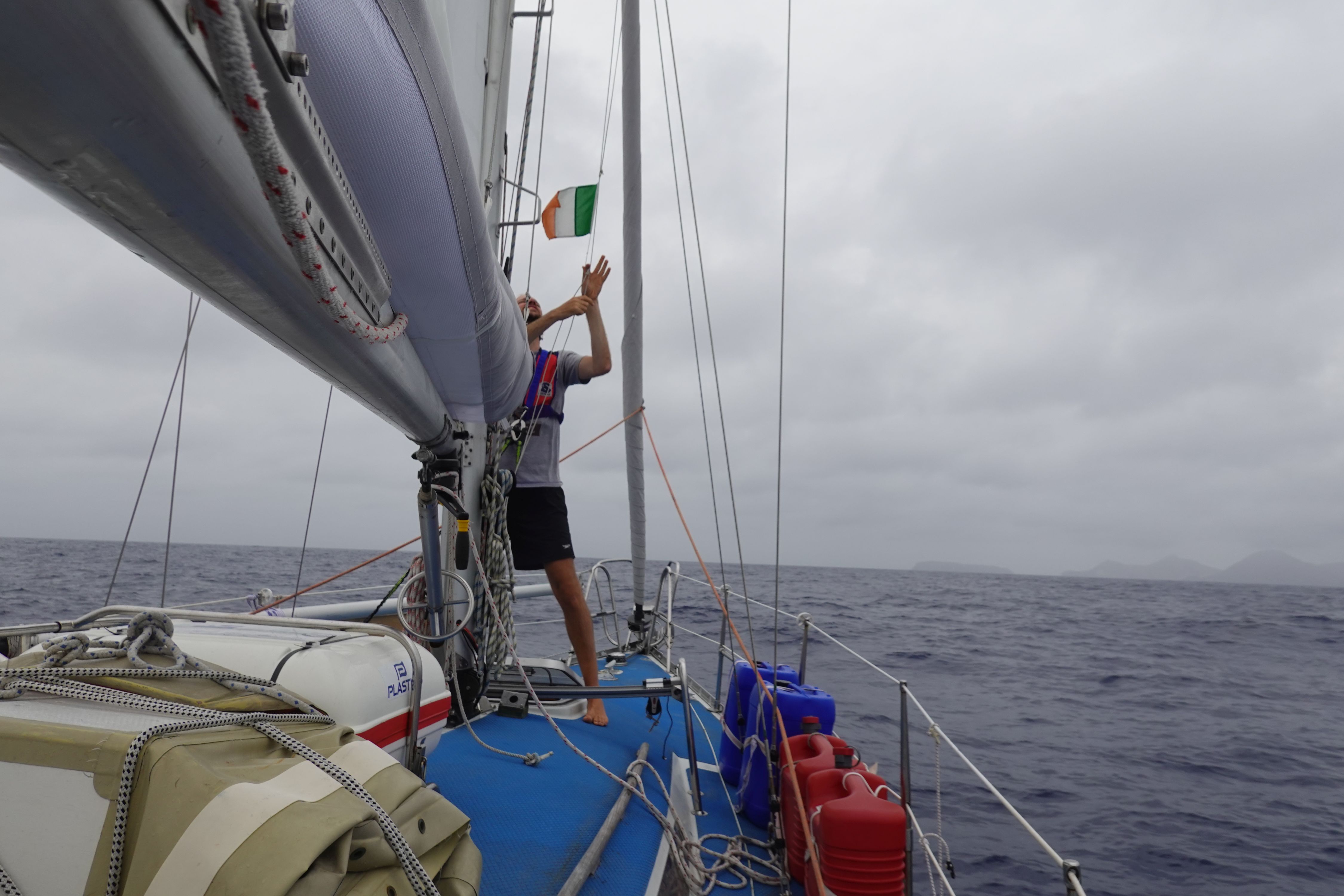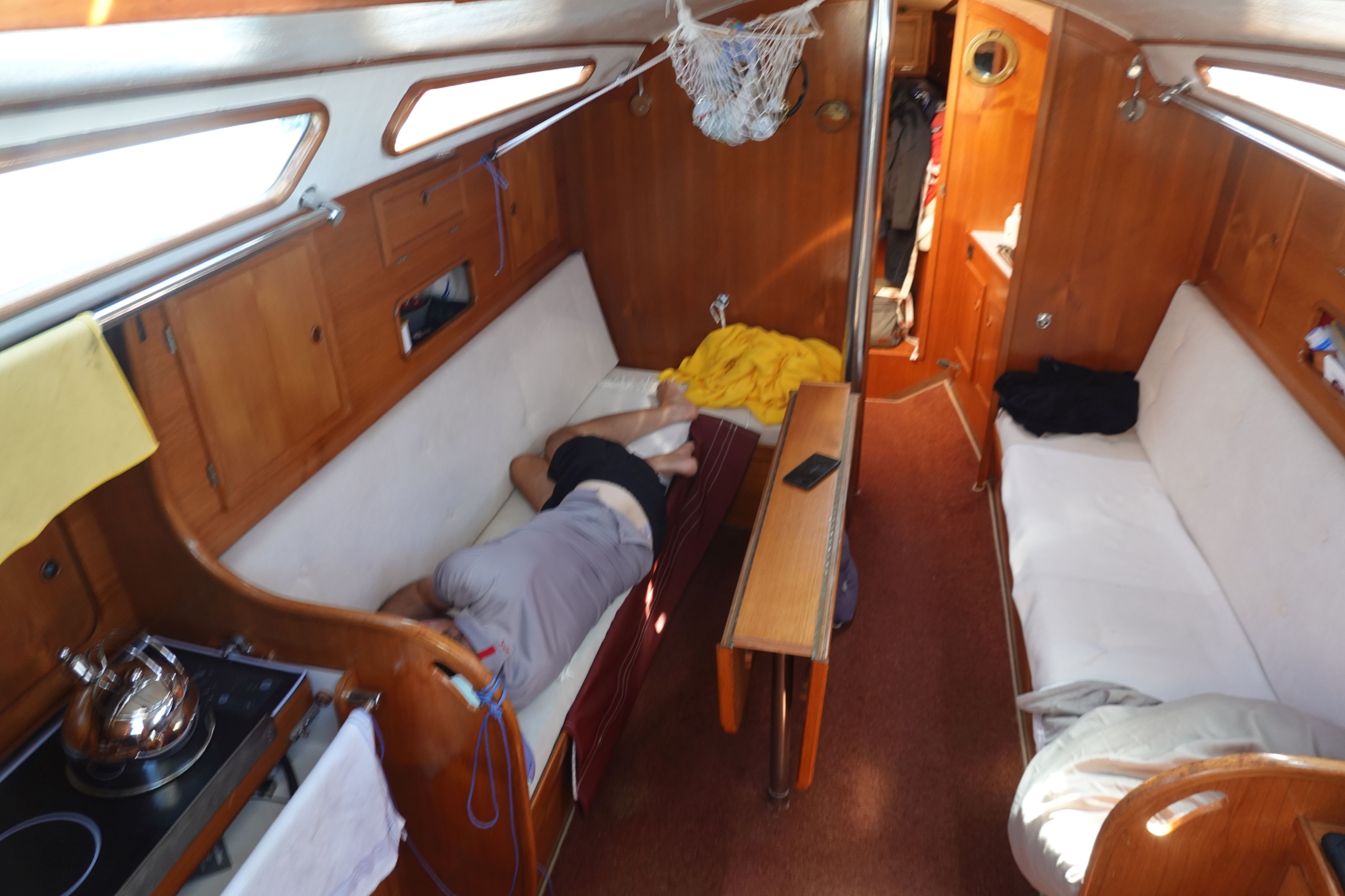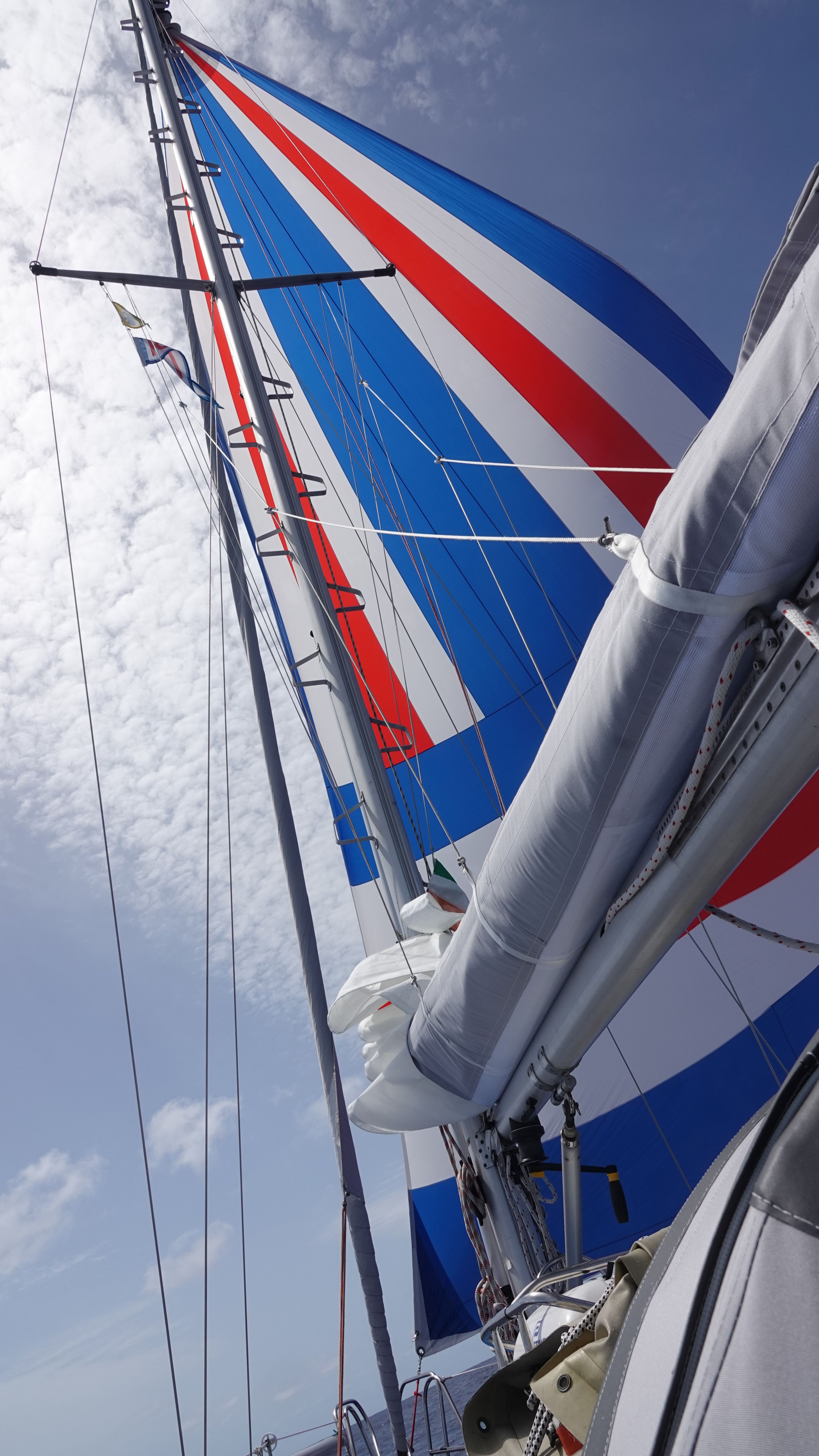 Bis Donnerstagmittag hält das ungemütliche Wetter an. Dann lässt der Wind plötzlich nach, es reißt auf und wird warm. Die nassen Klamotten trocknen in der Sonne, zeitweise segeln wir mit schwachem Wind oder motoren wenn der Wind zu wenig Druck in die von den Wellen hin und her schlagenden Segel bringt.