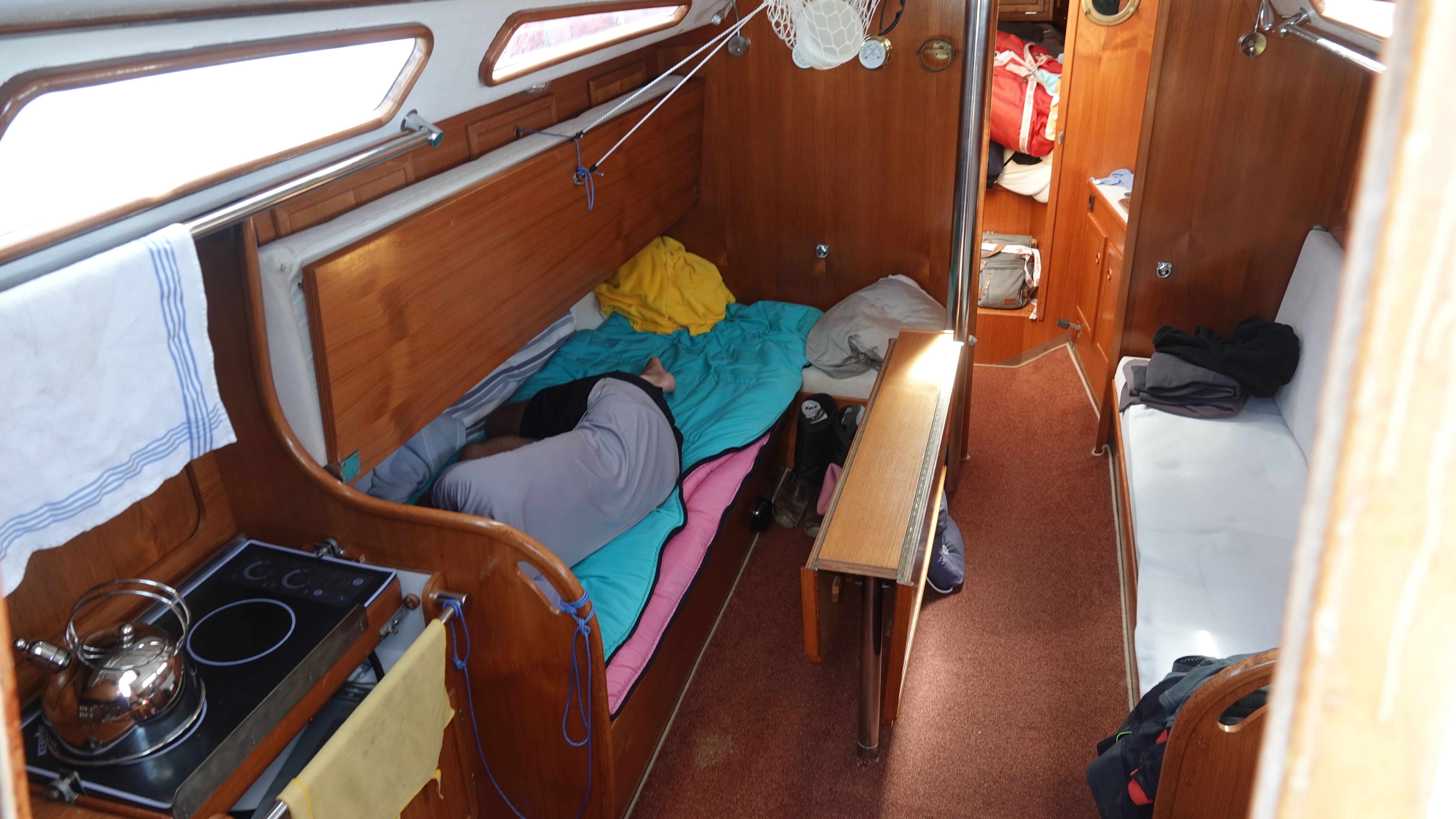 Die Freiwachen verbringen wir jetzt nachts auf dem Schlafsack, bestenfalls noch mit einer Wolldecke zugedeckt. Auch an Deck ist es in den Nächten nicht mehr so kalt und meist reicht uns eine Lage warmer Sachen unterm Ölzeug.