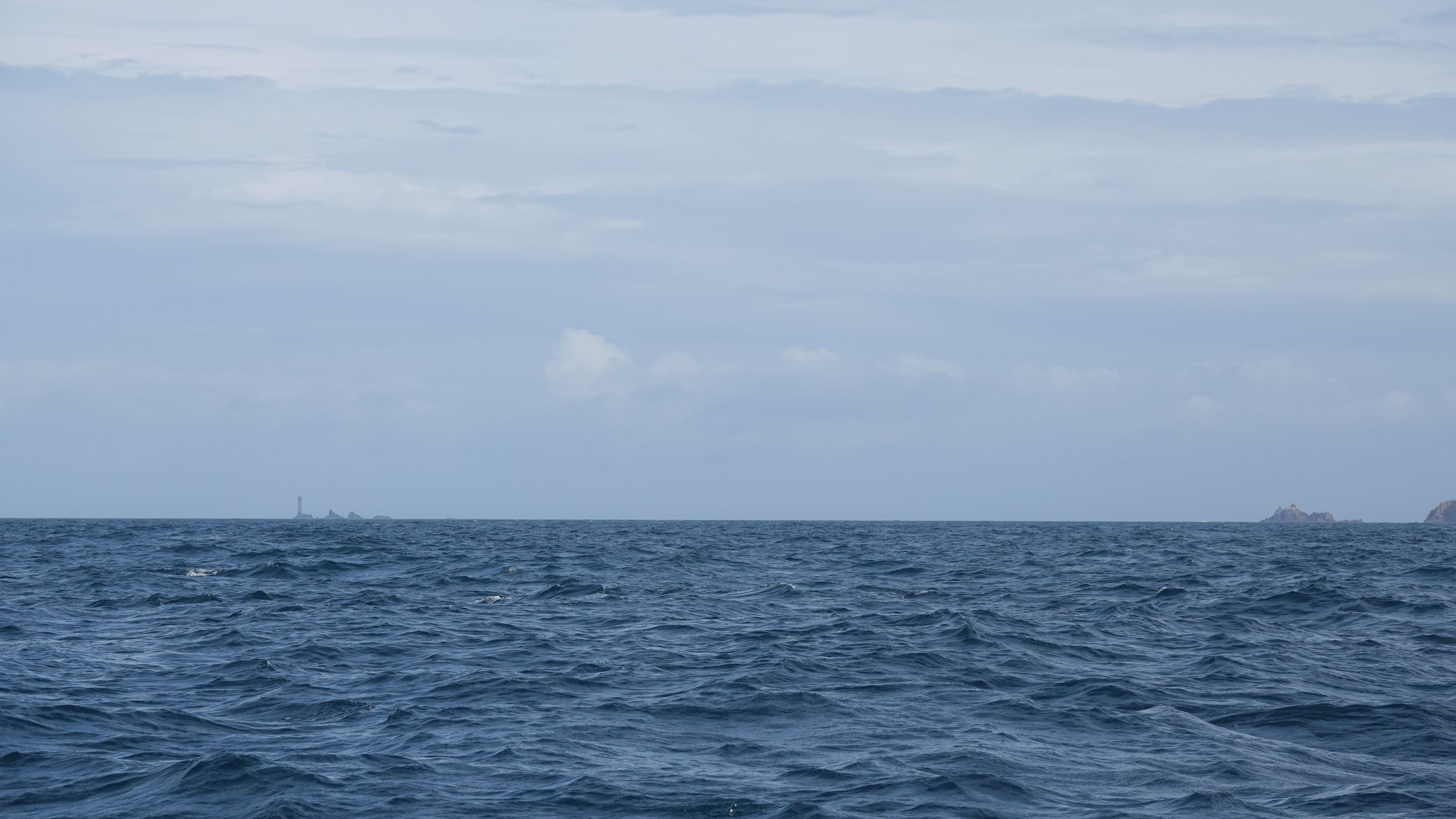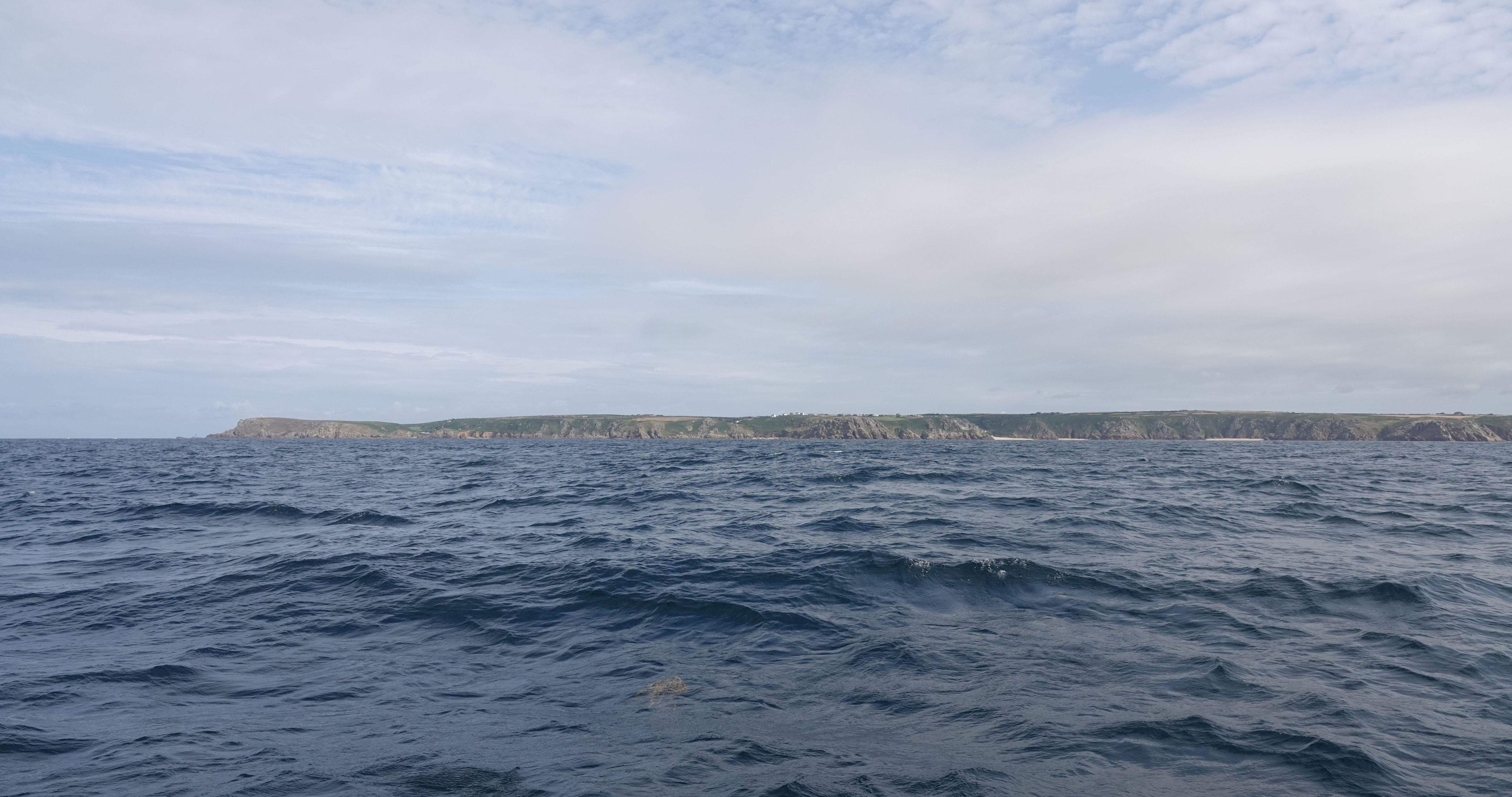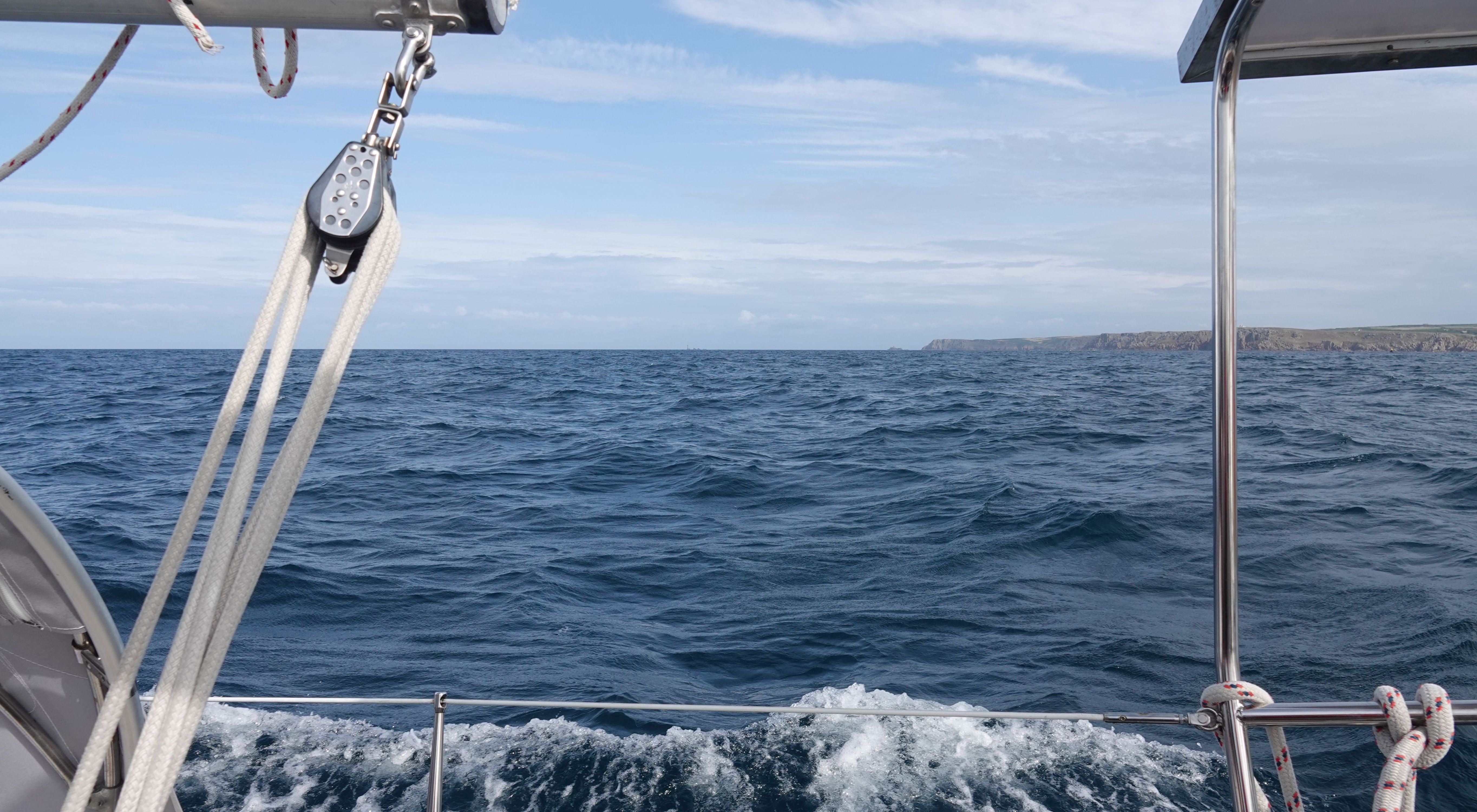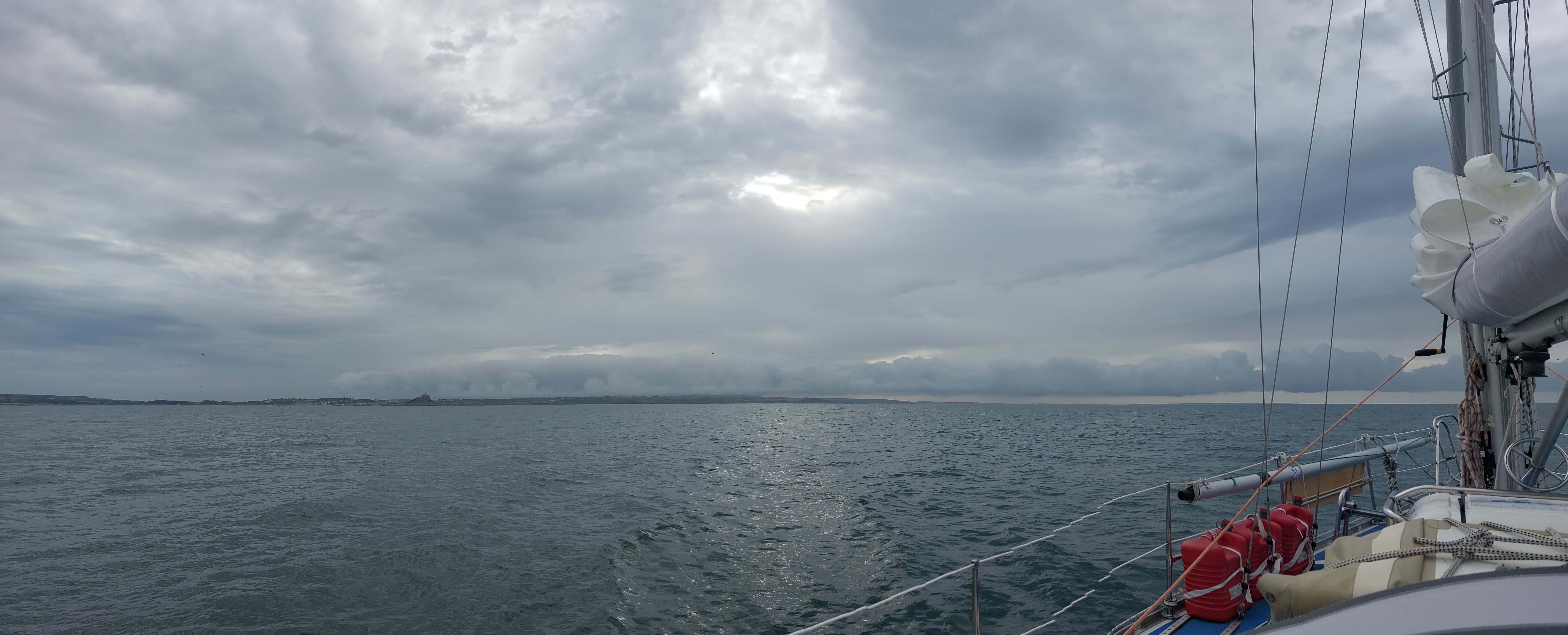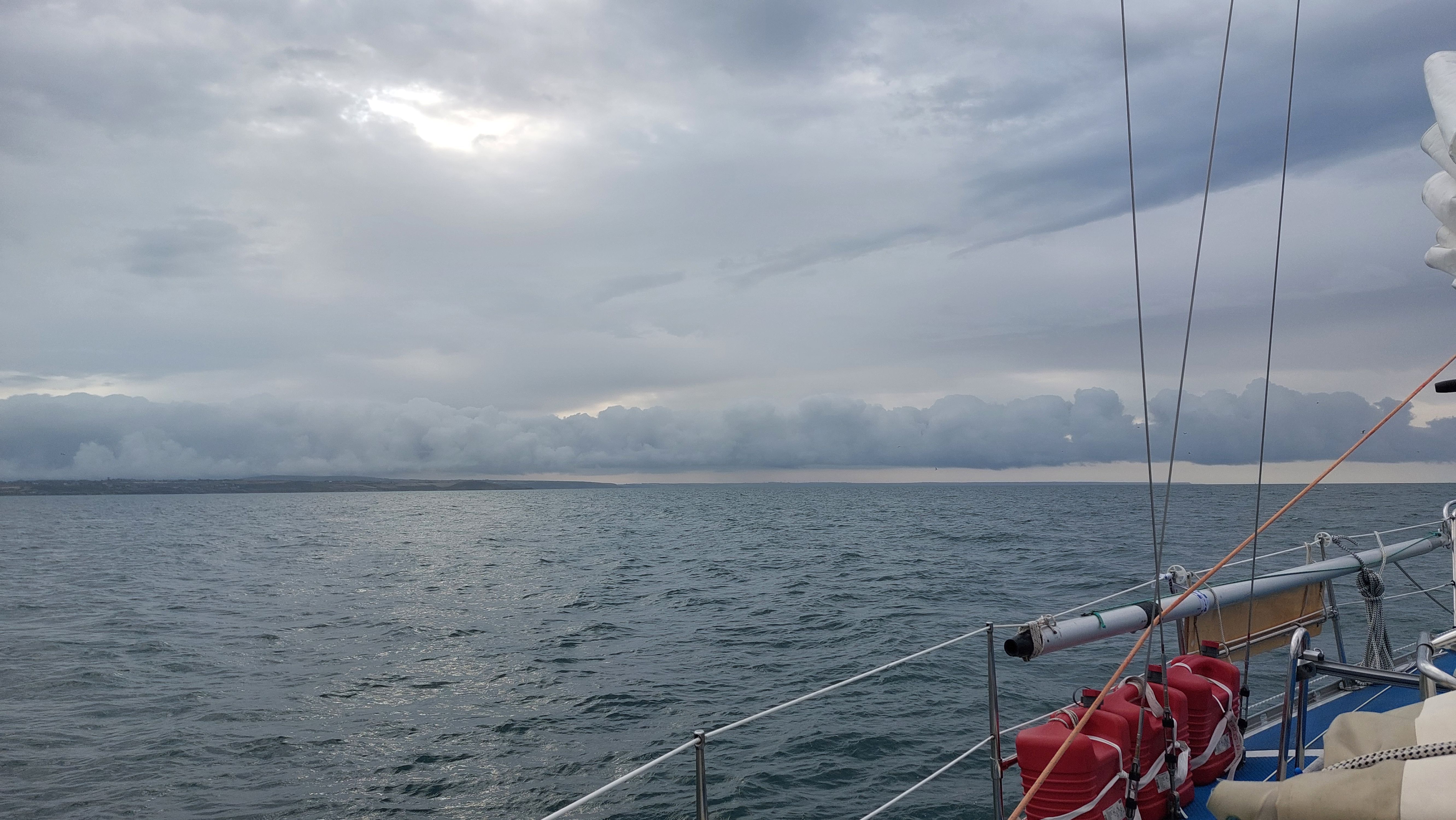 Mit Land's End querab reißt die Wolkendecke auf und es wird für eine Weile gemütlich warm an Bord. Währenddessen zieht über die Isles of Scilly allerdings ein Schauer nach dem anderen.
