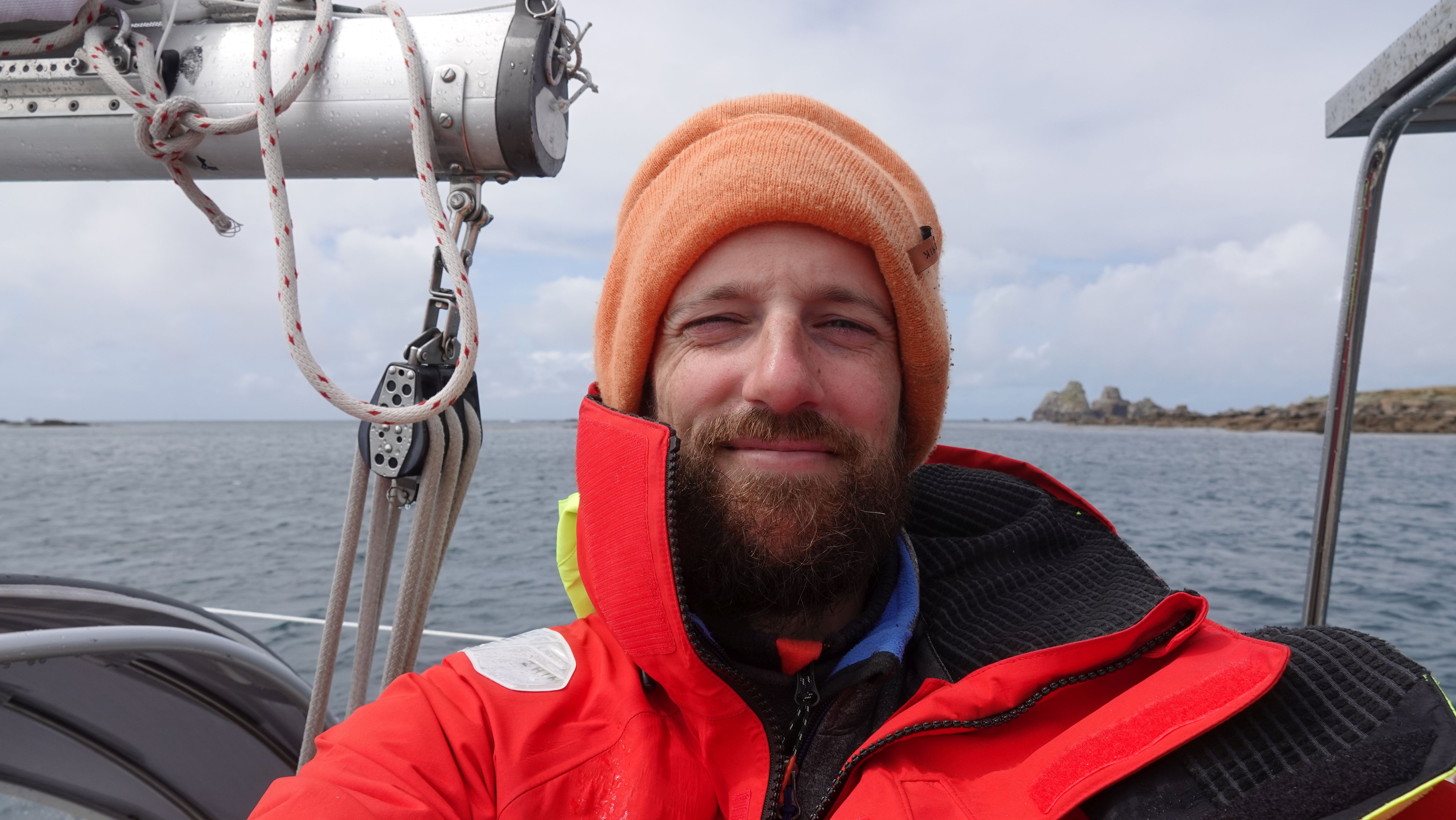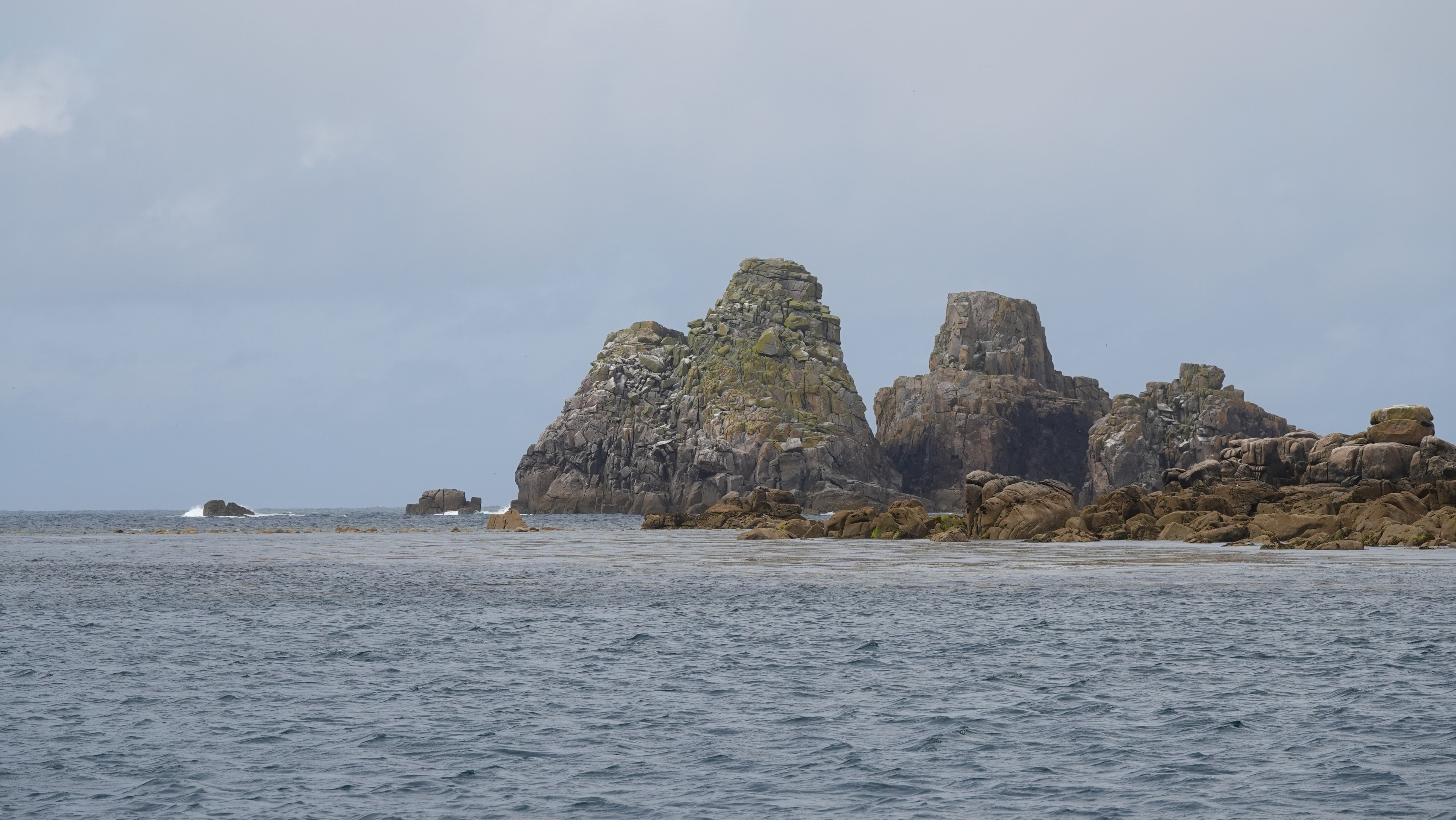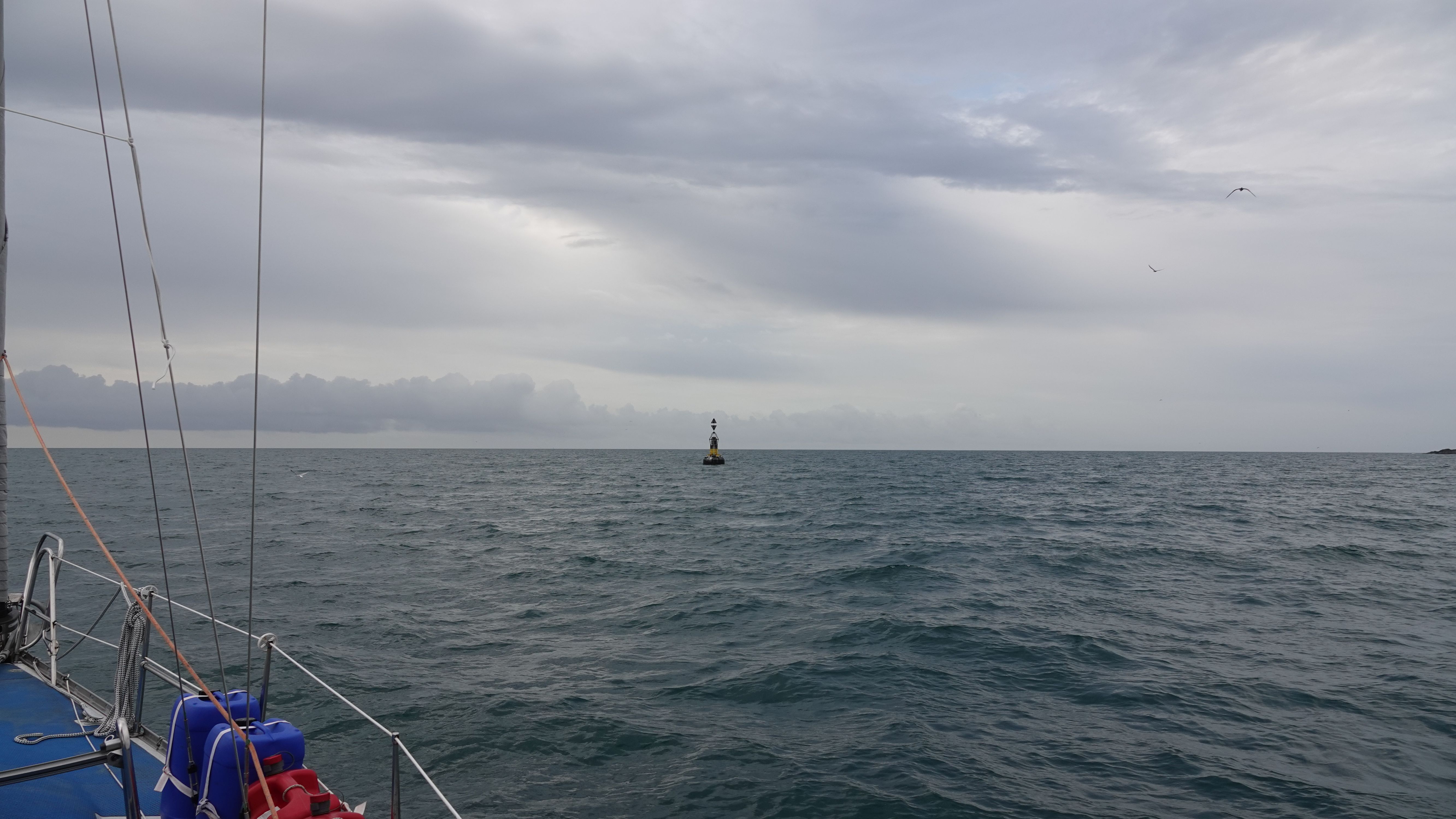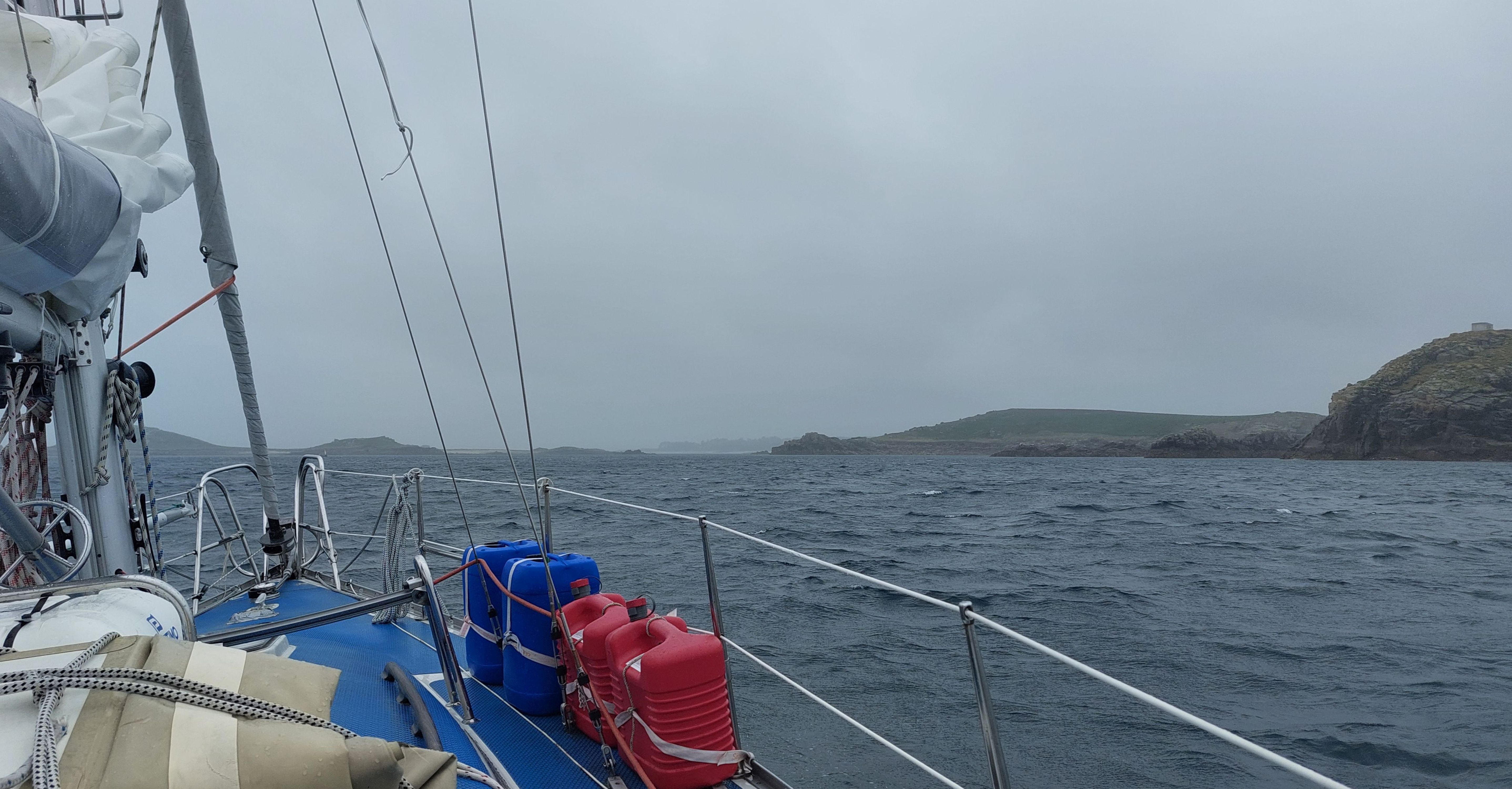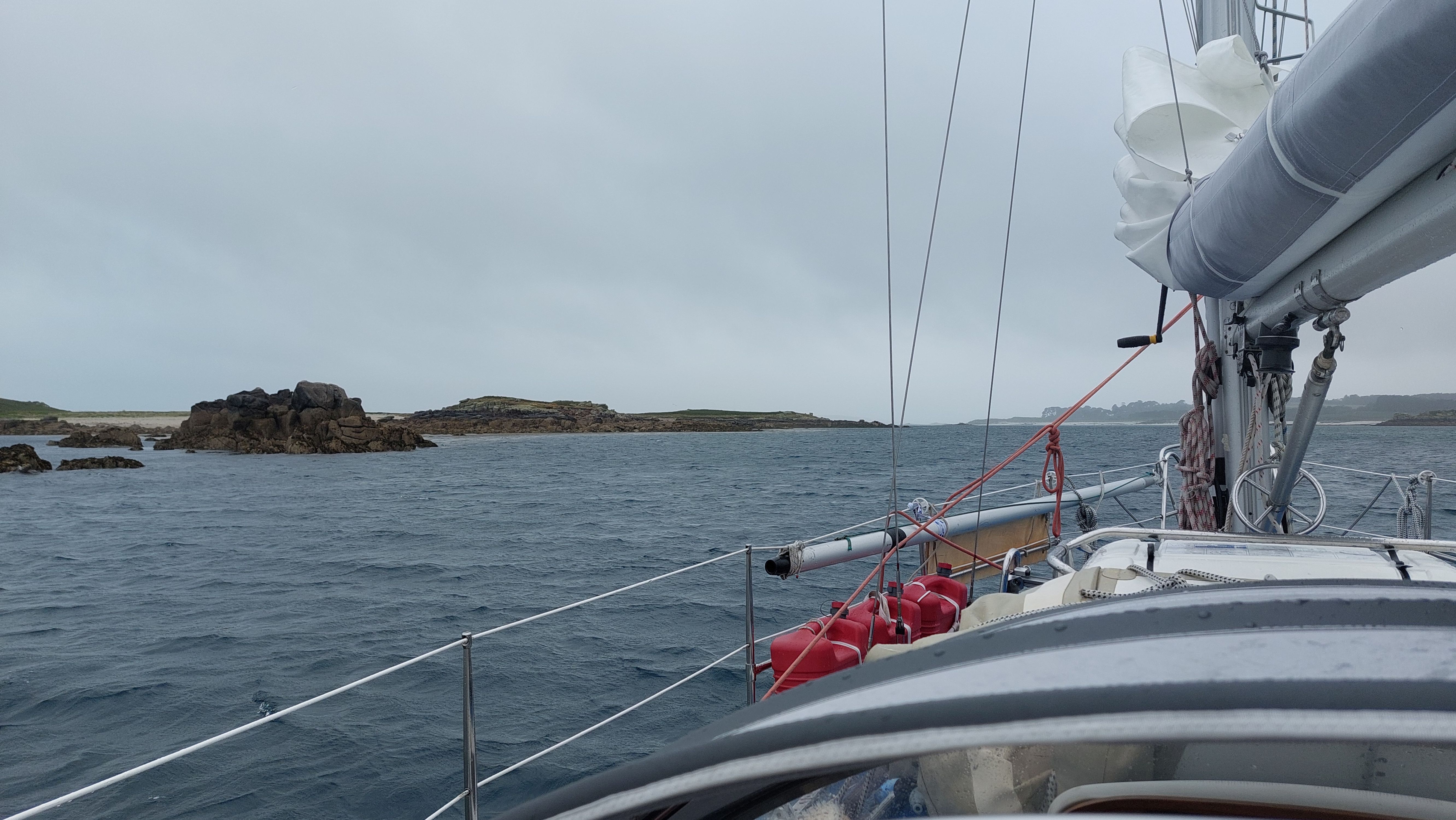 Ein Verkehrstrennungsgebiet gilt es noch zu queren. Da hier nur vergleichsweise wenig Verkehr herrscht geht das aber problemlos und ohne Frachterbegegnungen. Es zieht aber wieder zu und der Wind legt nochmal kräftig nach. Auch die Dünung und die Wellen sind höher. Mit dem Wind aus Südwest erhoffe ich mir eine ruhigere See im Norden der Inseln, doch die Wellen ziehen um die Felsen herum und kommen dort direkt aus West.