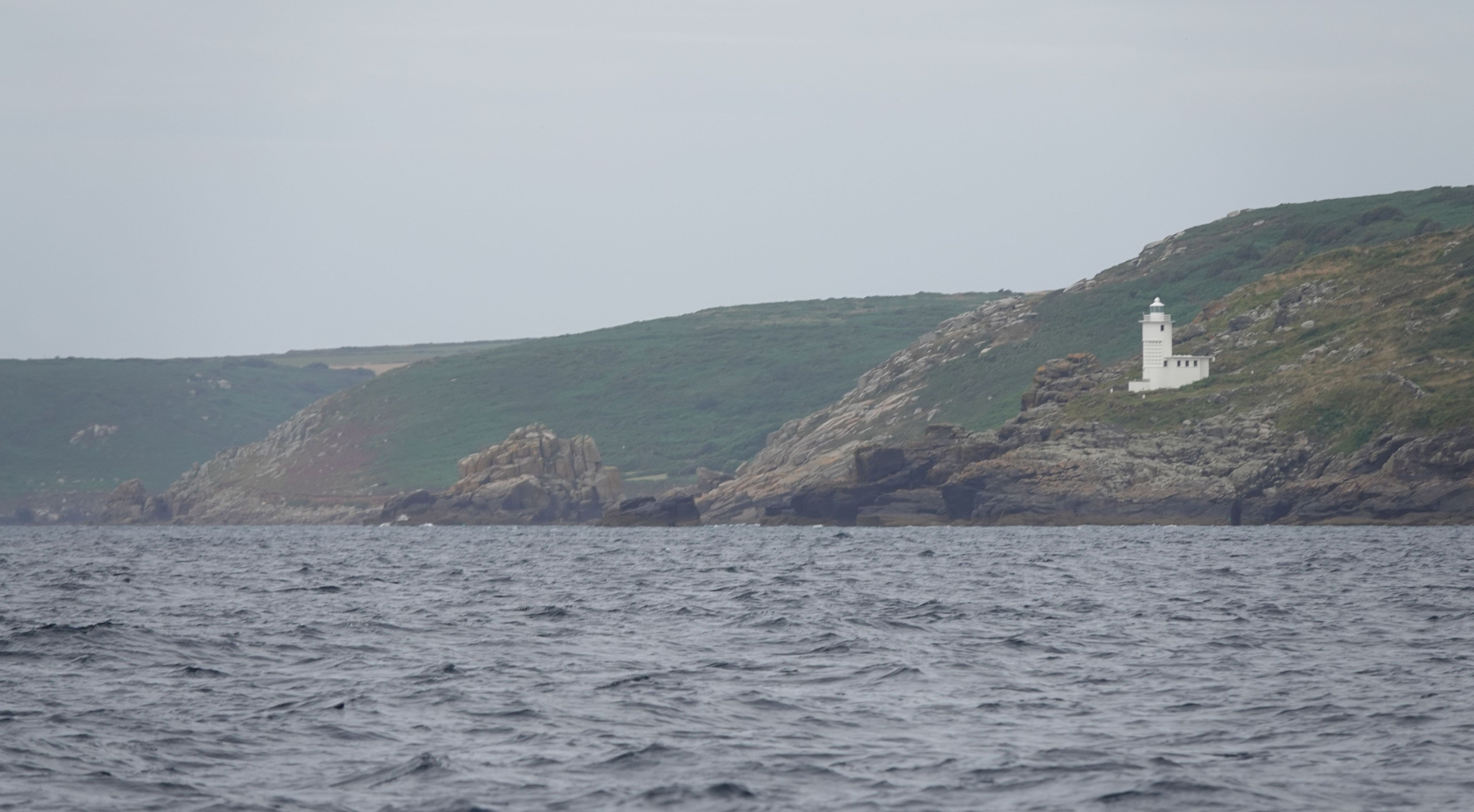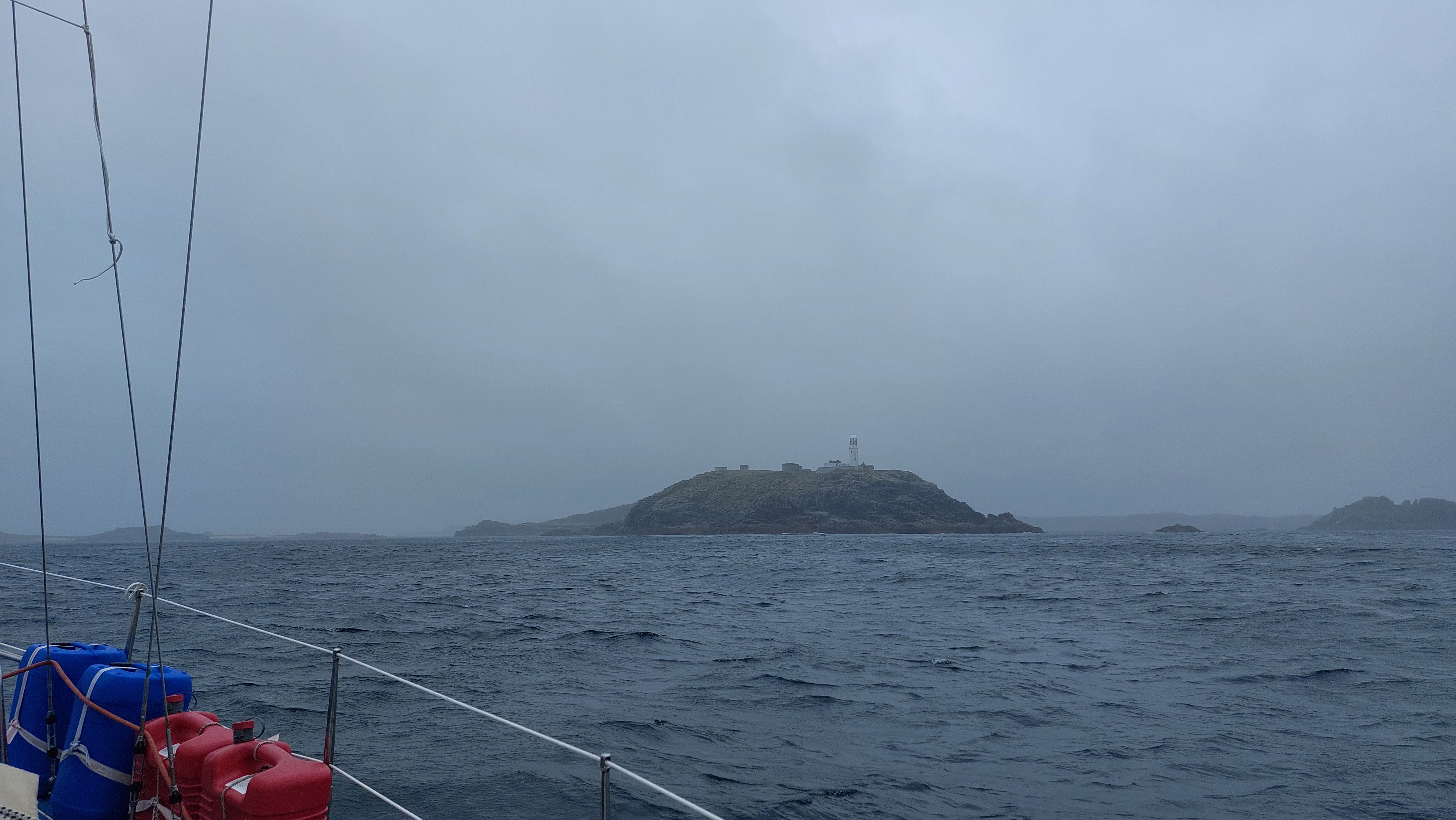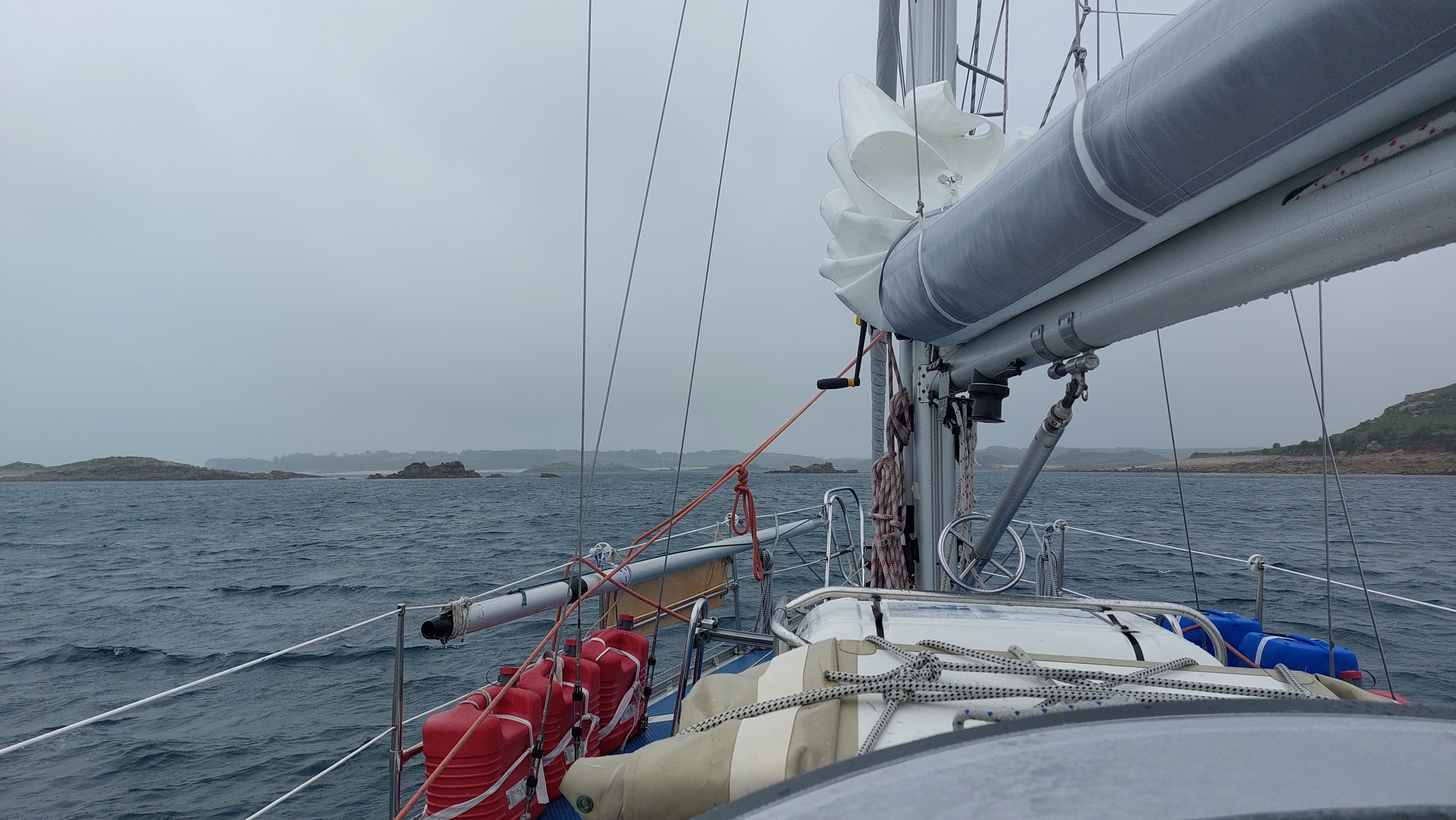 Zu meinem Ankerplatz muss ich durch St Helen's Gap. Eine enge, flache Öffnung in den Felsen, die durch einen Einschnitt zwischen den rauen Inseln erreicht wird. Markiert im Westen durch Round Island und das Round Island Lighthouse, im Osten durch die Klippen von Pernagle Isle. Als ich den Leuchtturm erreiche fegt noch einmal ein schwerer Schauer über mich hinweg und nimmt mir die Sicht. Ich schaukel noch eine Weile mit reduzierter Geschwindigkeit vor den Isles of Scilly bis die Einfahrt wieder erkennbar ist, dann berge ich die Segel und motore zwischen die felsigen Inseln während das Nebelhorn auf Round Island regelmäßig aus dem Dunst ertönt.