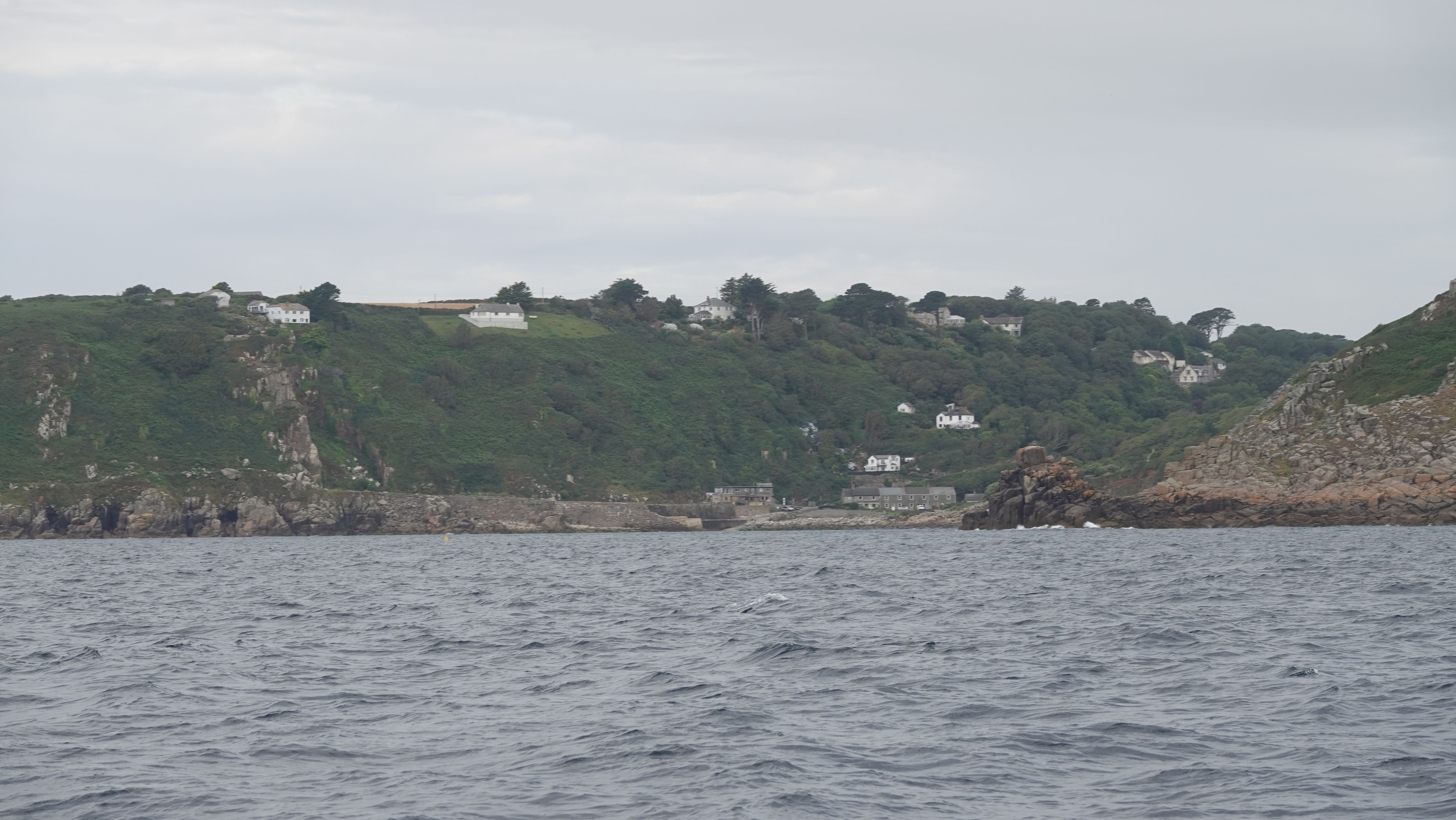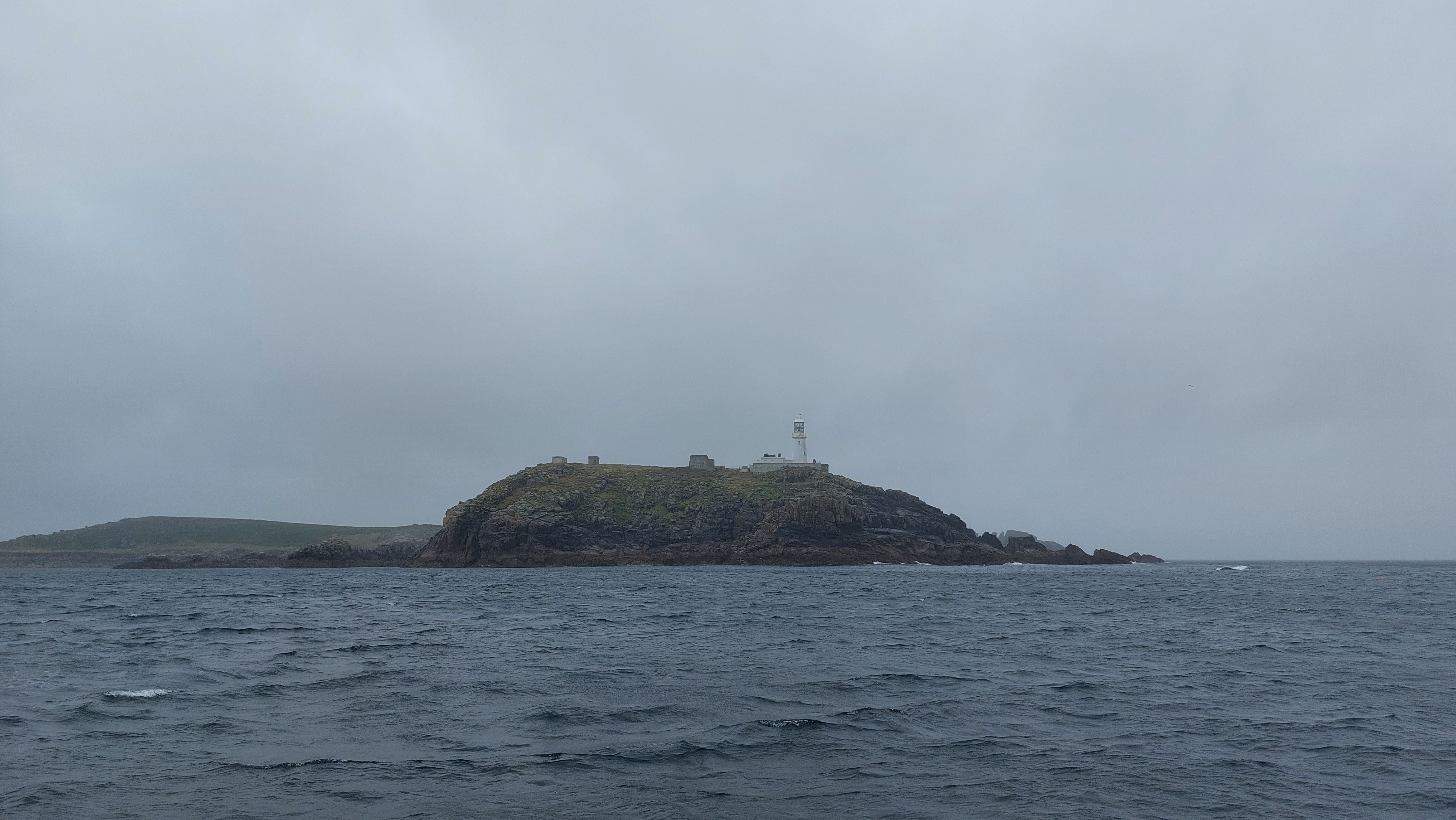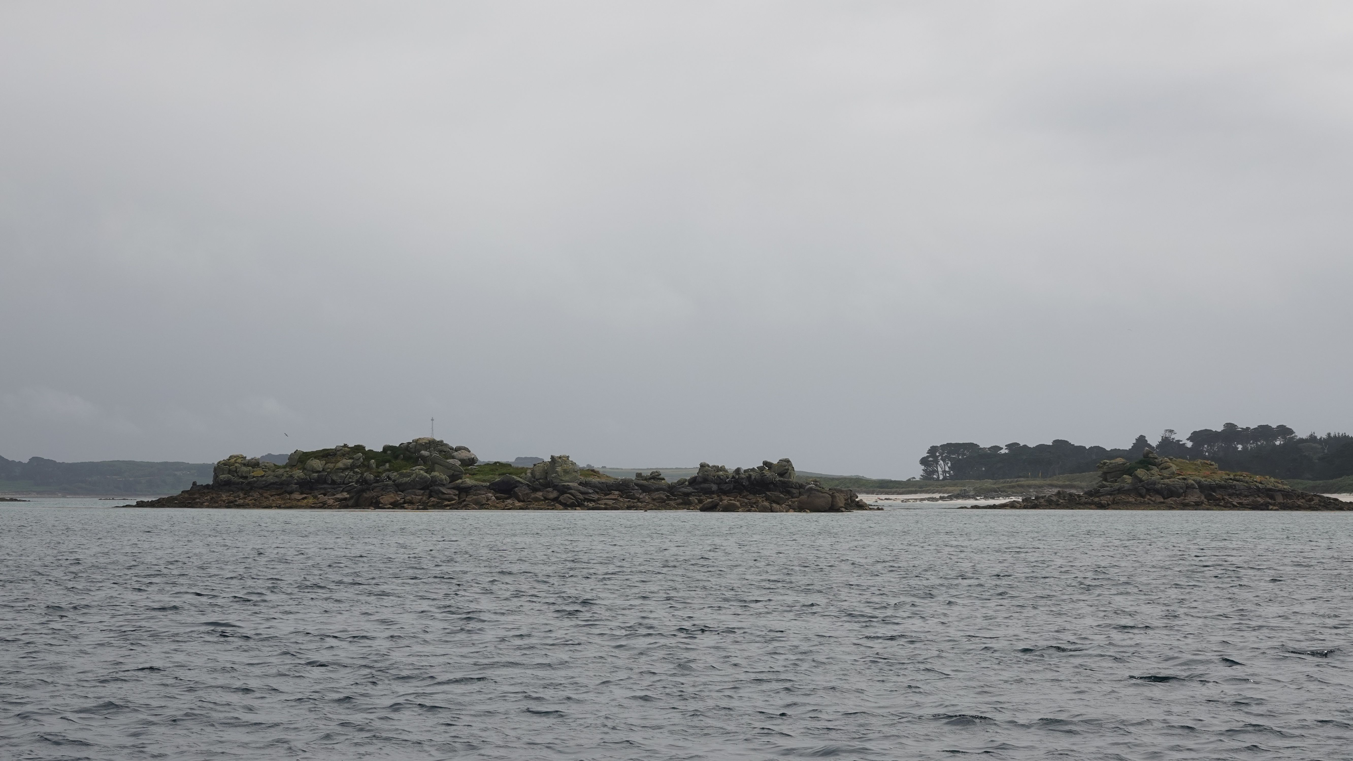 Zu meinem Ankerplatz muss ich durch St Helen's Gap. Eine enge, flache Öffnung in den Felsen, die durch einen Einschnitt zwischen den rauen Inseln erreicht wird. Markiert im Westen durch Round Island und das Round Island Lighthouse, im Osten durch die Klippen von Pernagle Isle. Als ich den Leuchtturm erreiche fegt noch einmal ein schwerer Schauer über mich hinweg und nimmt mir die Sicht. Ich schaukel noch eine Weile mit reduzierter Geschwindigkeit vor den Isles of Scilly bis die Einfahrt wieder erkennbar ist, dann berge ich die Segel und motore zwischen die felsigen Inseln während das Nebelhorn auf Round Island regelmäßig aus dem Dunst ertönt.