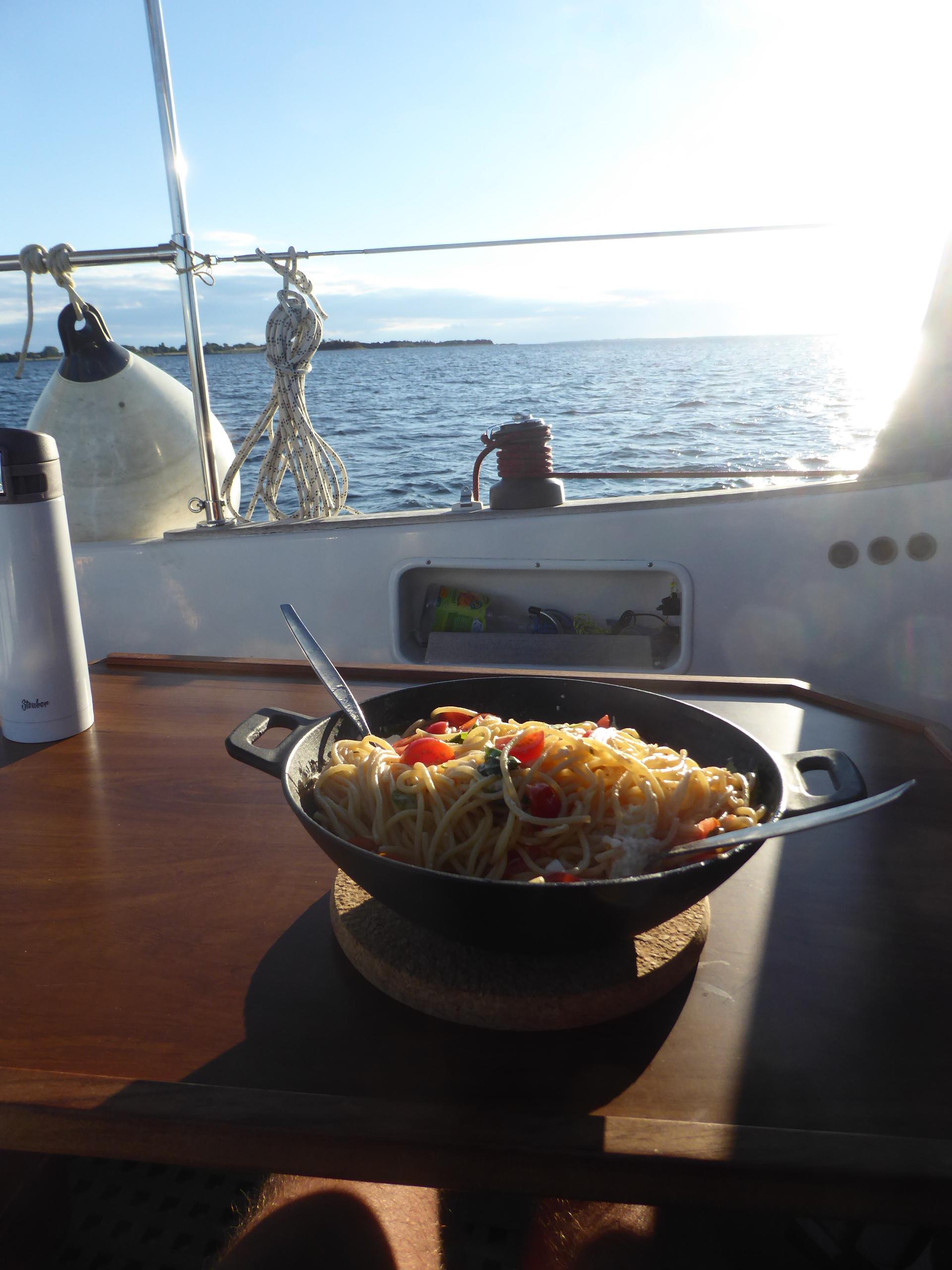 Nach der Arbeit gehe ich schwimmen. Nur eine Runde ums Boot schaffe ich, dann wird es mir zu kalt. Immerhin wärmt die Sonne mich im Schutz der Sprayhood schnell wieder auf.