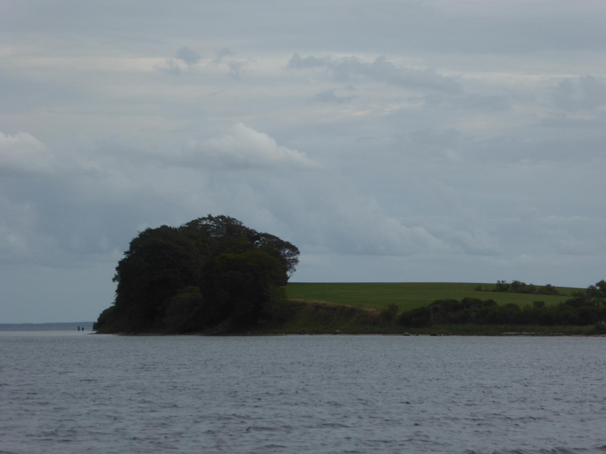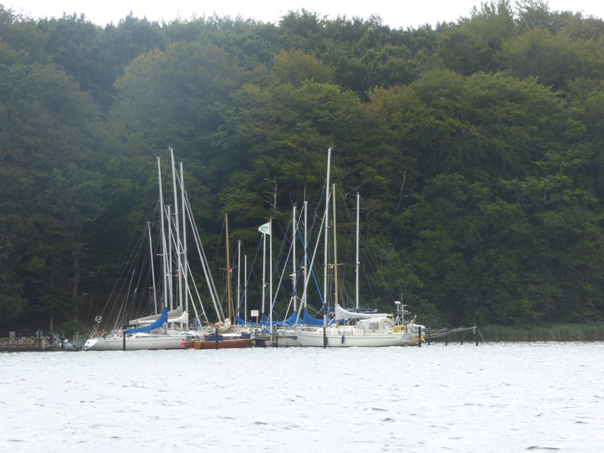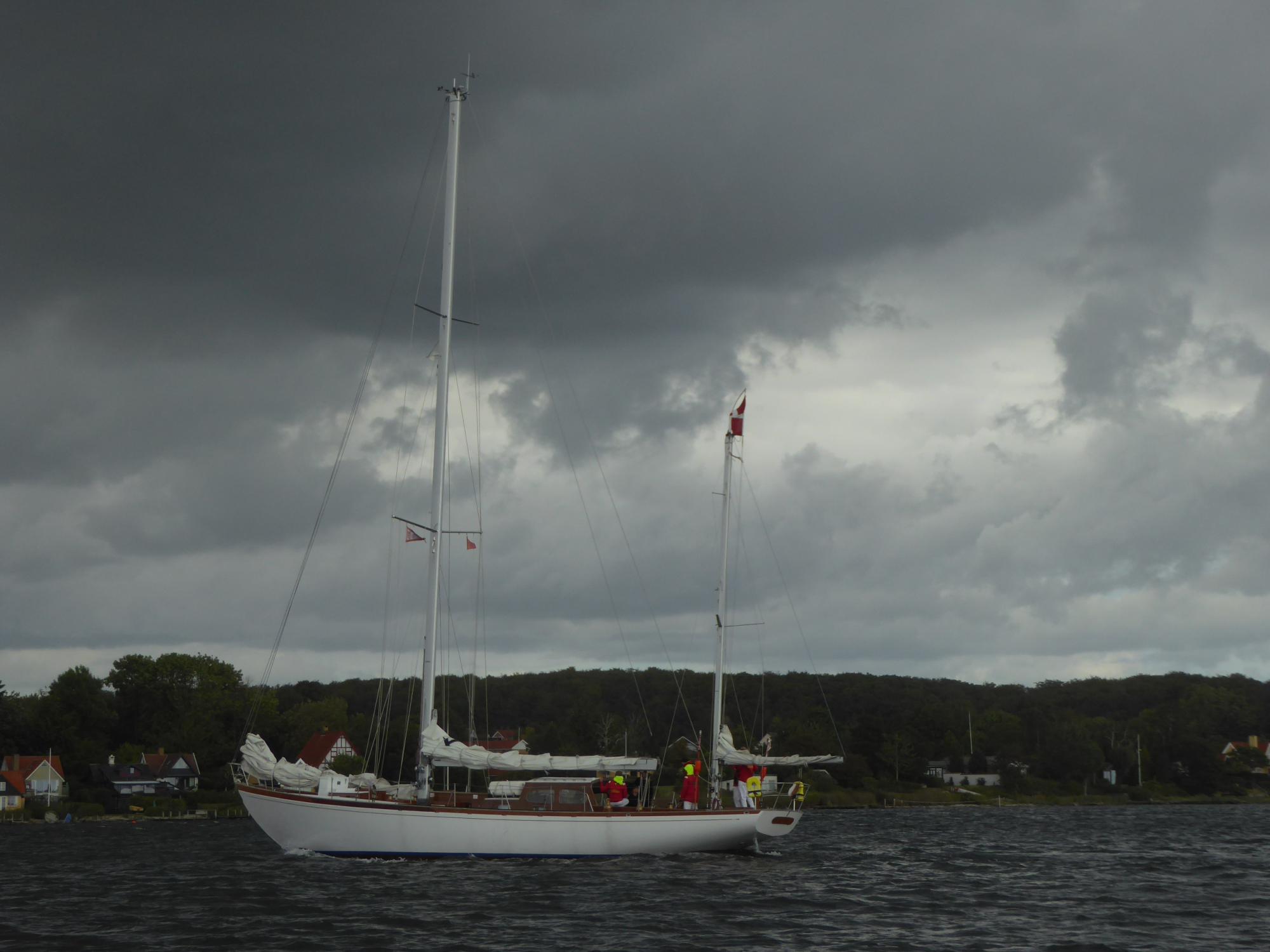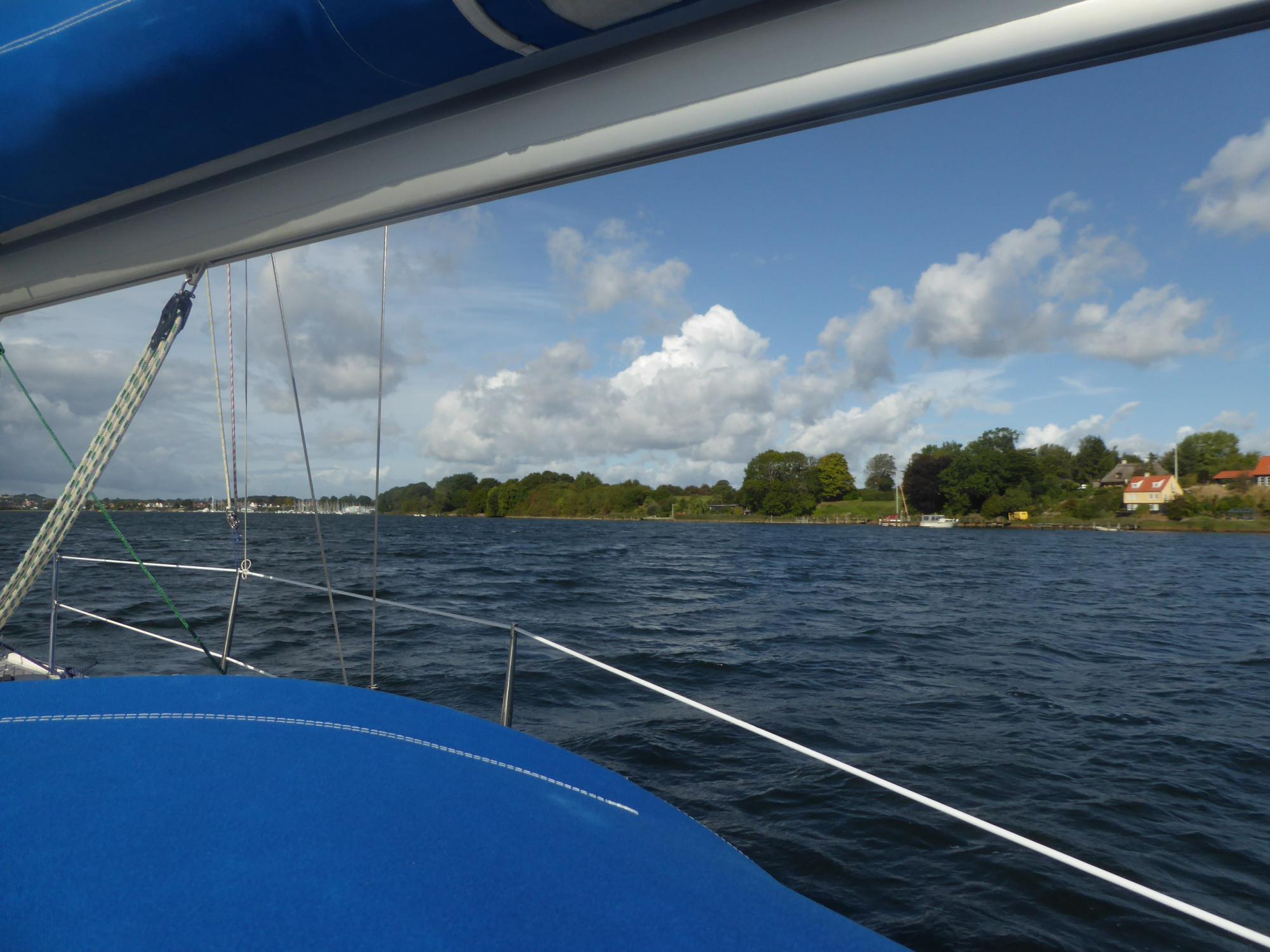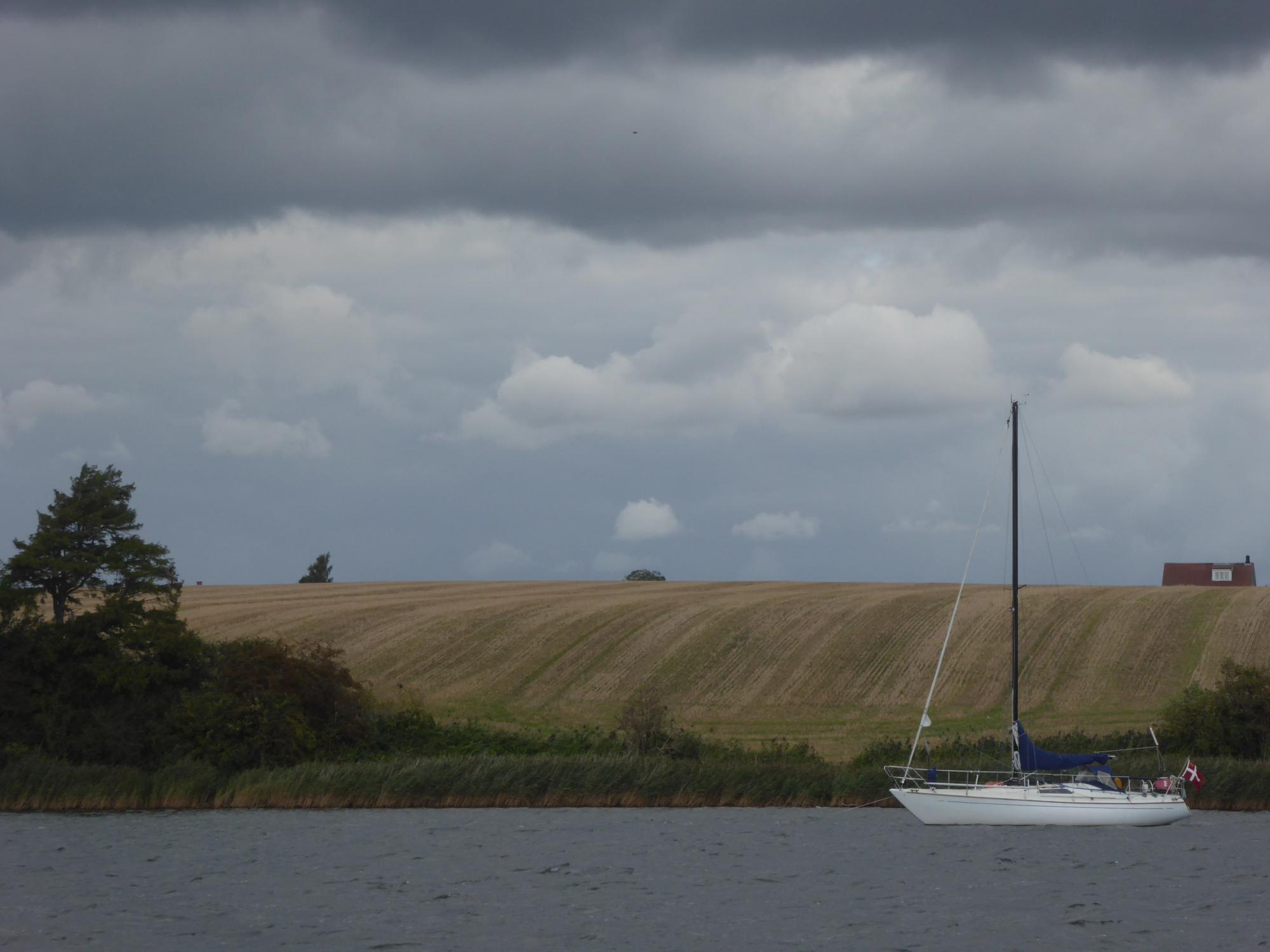 Um ein Uhr mache ich Feierabend und breche auf nach Nyborg. Im Sund habe ich fast das Gefühlt rückwärts zu fahren, so stark drückt der Strom in den Sund hinein. Ich starte mit dem zweiten Reff im Großsegel, schütte das allerdings bald aus. Auf dem Nordkurs lässt der Wind nämlich nach. Mit vollen Segeln steigt meine Geschwindigkeit auch zügig von viereinhalb auf sechseinhalb Knoten. Unterwegs bekomme ich ein paar leichte Schauer ab, überwiegend ist es aber sonnig.